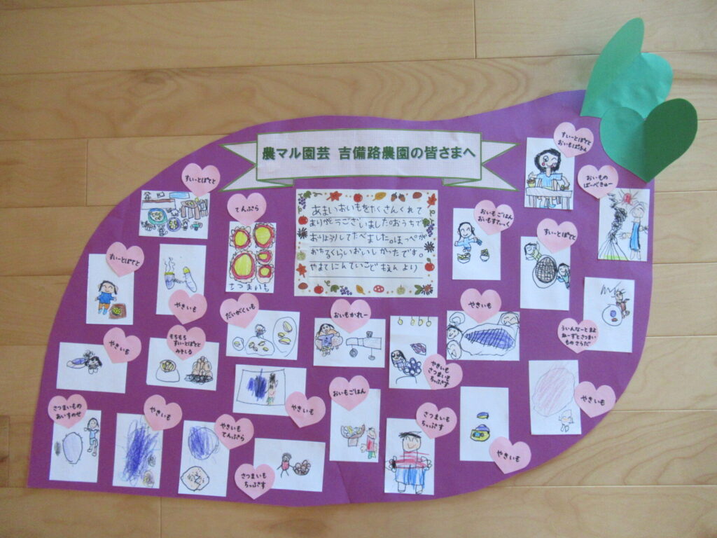 子どもたちは、持ち帰ったさつまいもで、自分の大好きなお料理をお家の方に作ってもらいました。何を作ってもらおうかとワクワクしながら、お家の人と会話を弾ませている様子が目に浮かんできます。😊天ぷらにスイートポテト、さつまいもチップスに大学芋・・・。子どもたちは作ってもらったお料理の話を友達と嬉しそうに話しながら、農マル園芸さんへお礼の手紙を描きました。