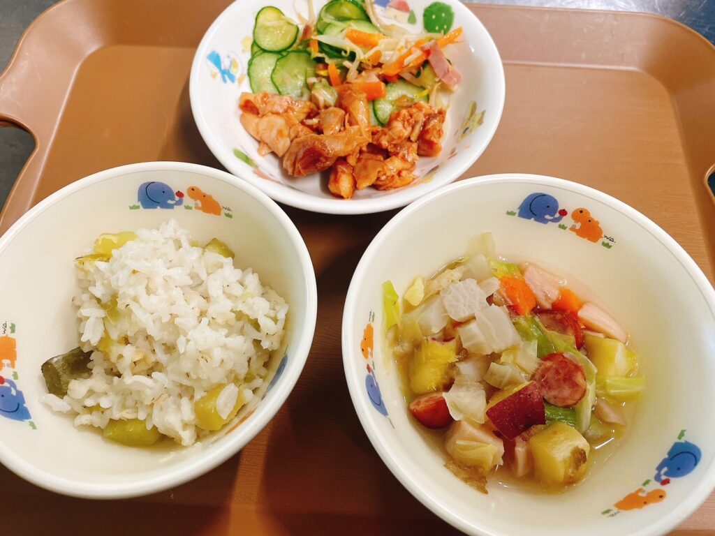 こども園では、給食の先生が10月6日の中秋の名月の日に『さつまいもご飯🍠』を作ってくれました。甘いサツマイモに、”ほっぺたが落ちそう”でした。子どもたちも先生ものみんな元気をいただきました。