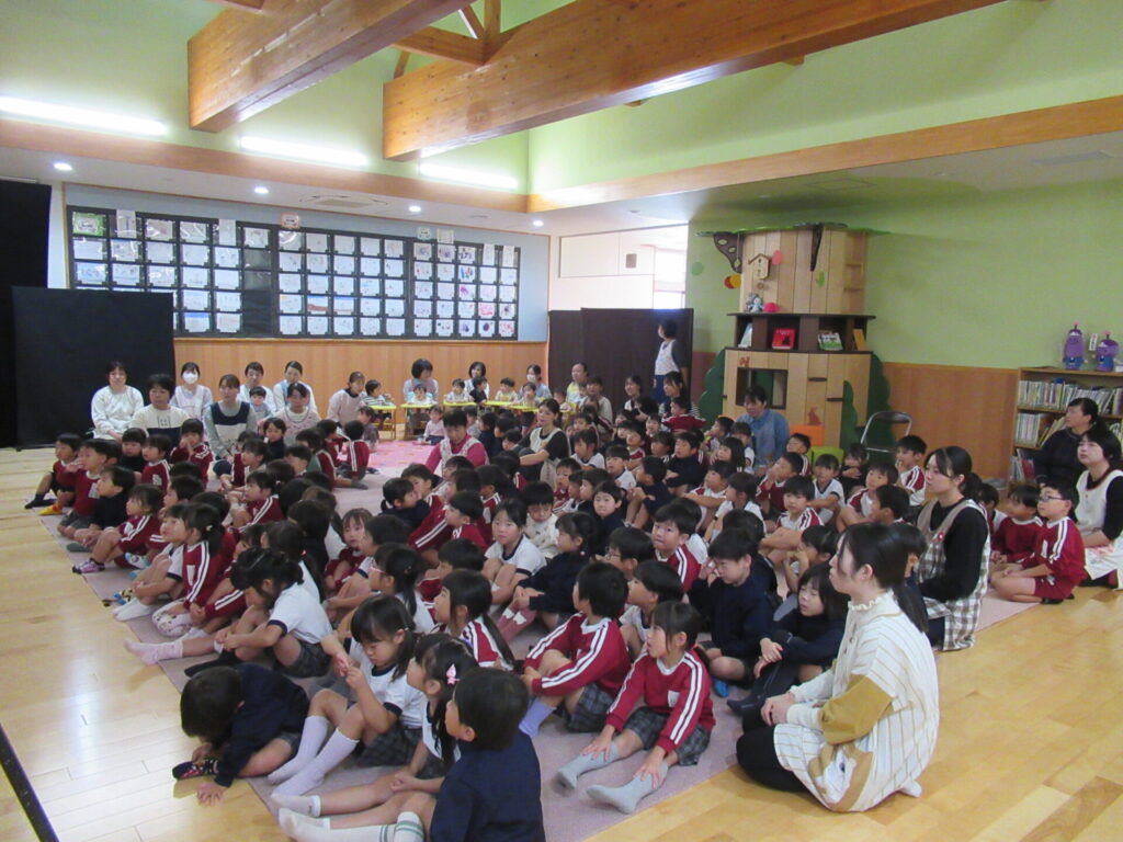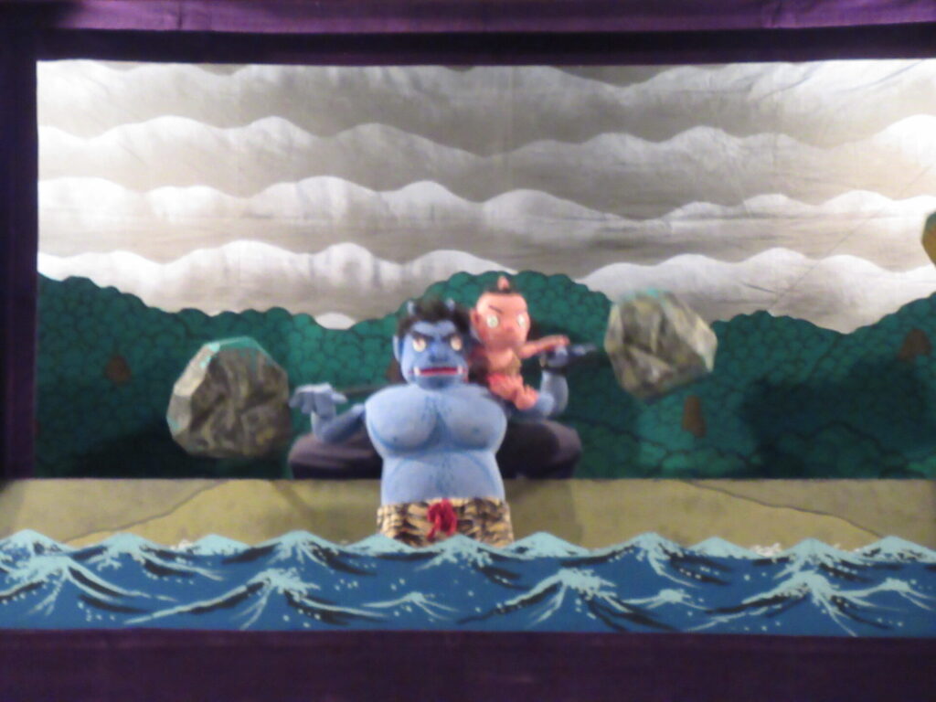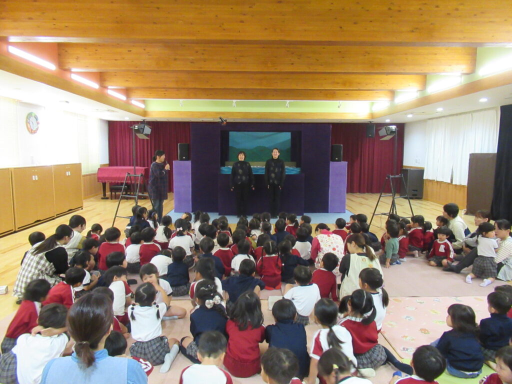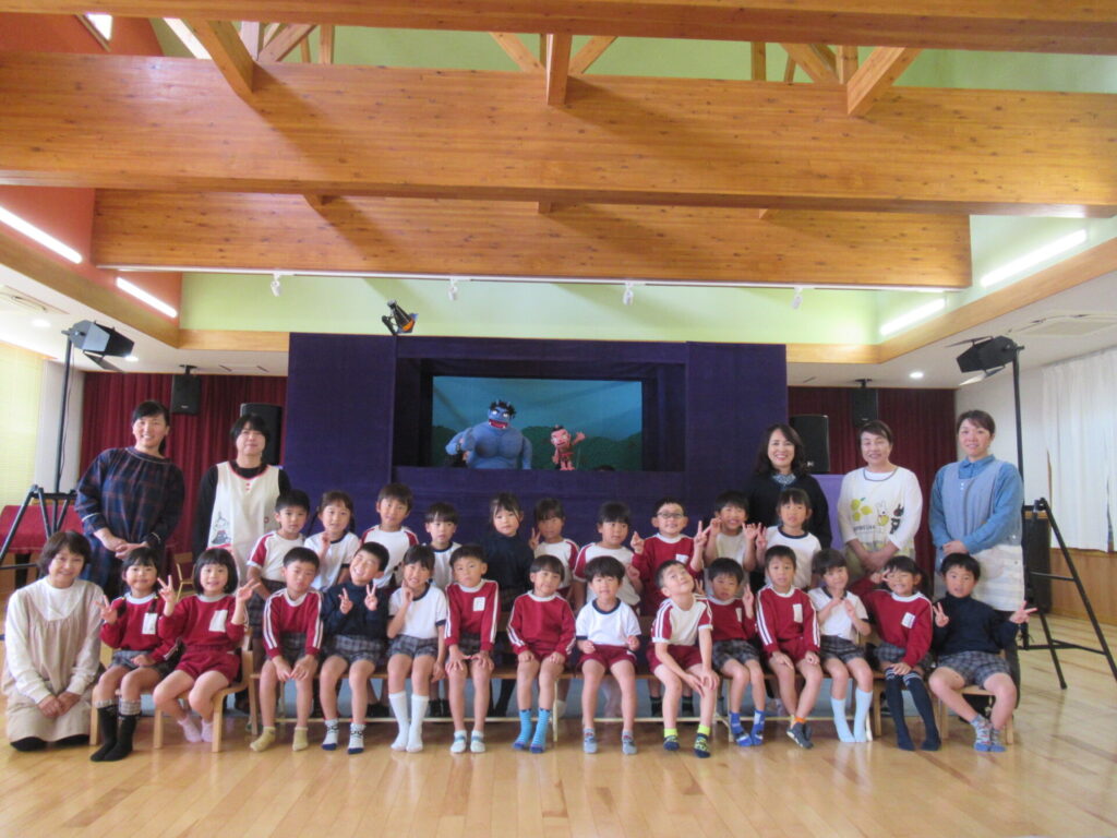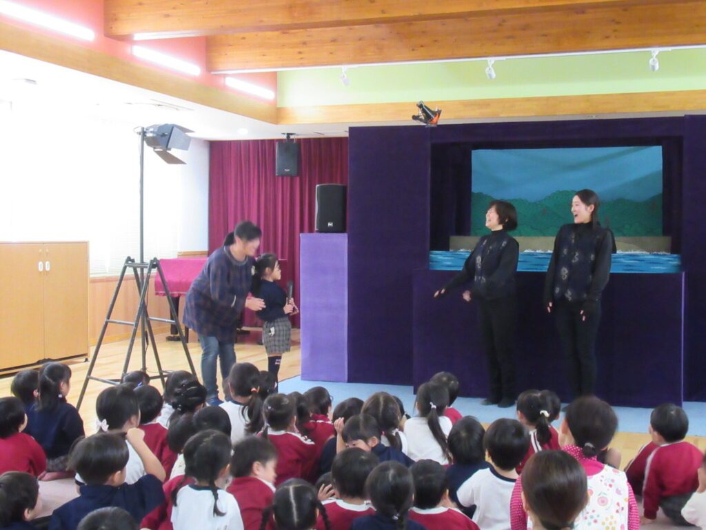 今年も、とらまる人形劇団の方に来ていただき、心温まるお話を見せていただきました。鬼が出てくるお話で、始まる前は、ドキドキしている子どもたちもいましたが、愛嬌のある鬼の子と大きいけれど心優しい鬼のお父さんに子どもたちも、職員も夢中になって見ることができました。このお話は、土佐の民謡『海に沈んだ鬼』のお話です。