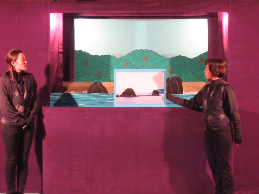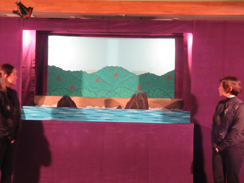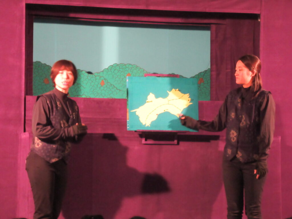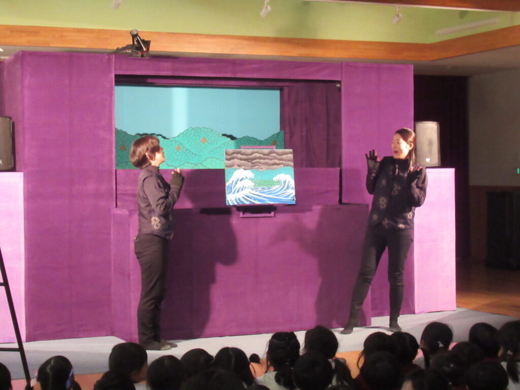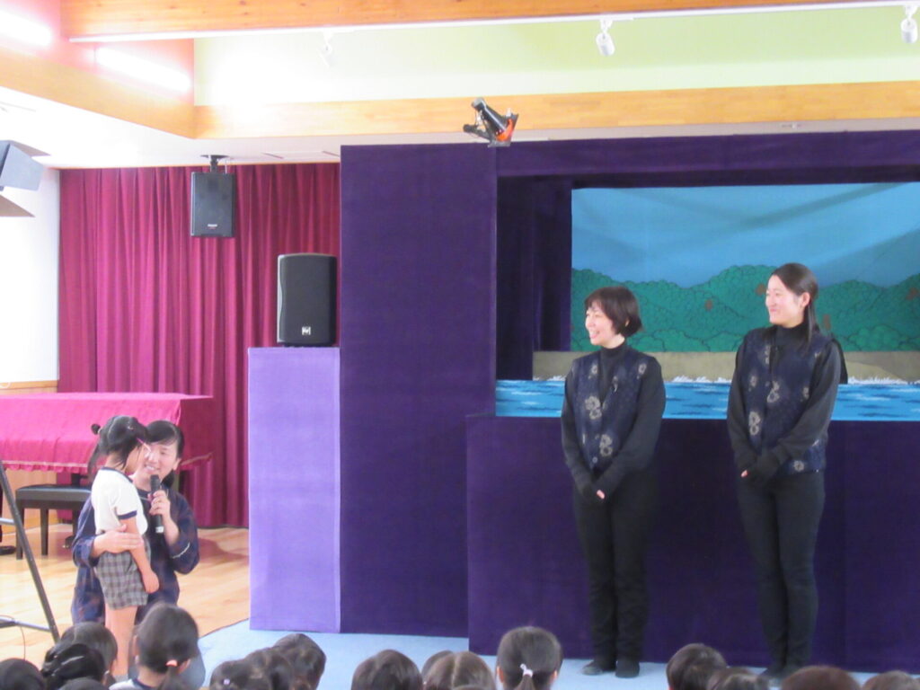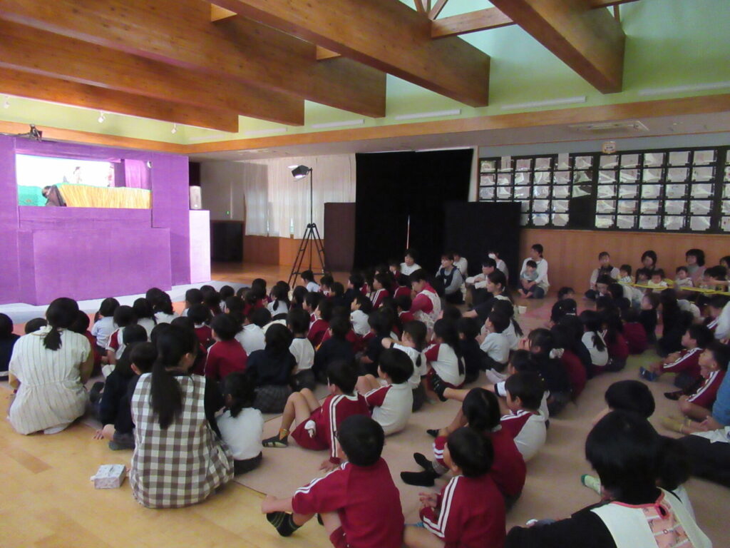 音楽を操作しながら人形や背景を、たった2人で見せてくれた人形劇に、子どもたちも先生も感動しました。子どもに感想を聞いてみると、「人形劇は楽しかったです。」「二人技がすごかった。」と教えてくれました。