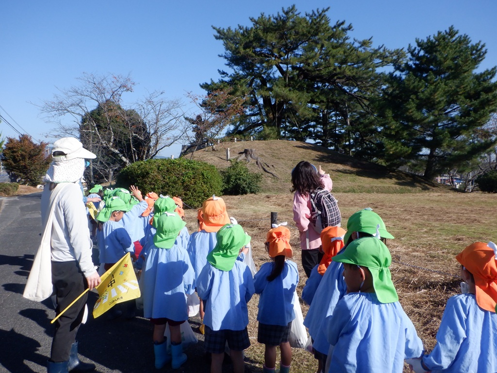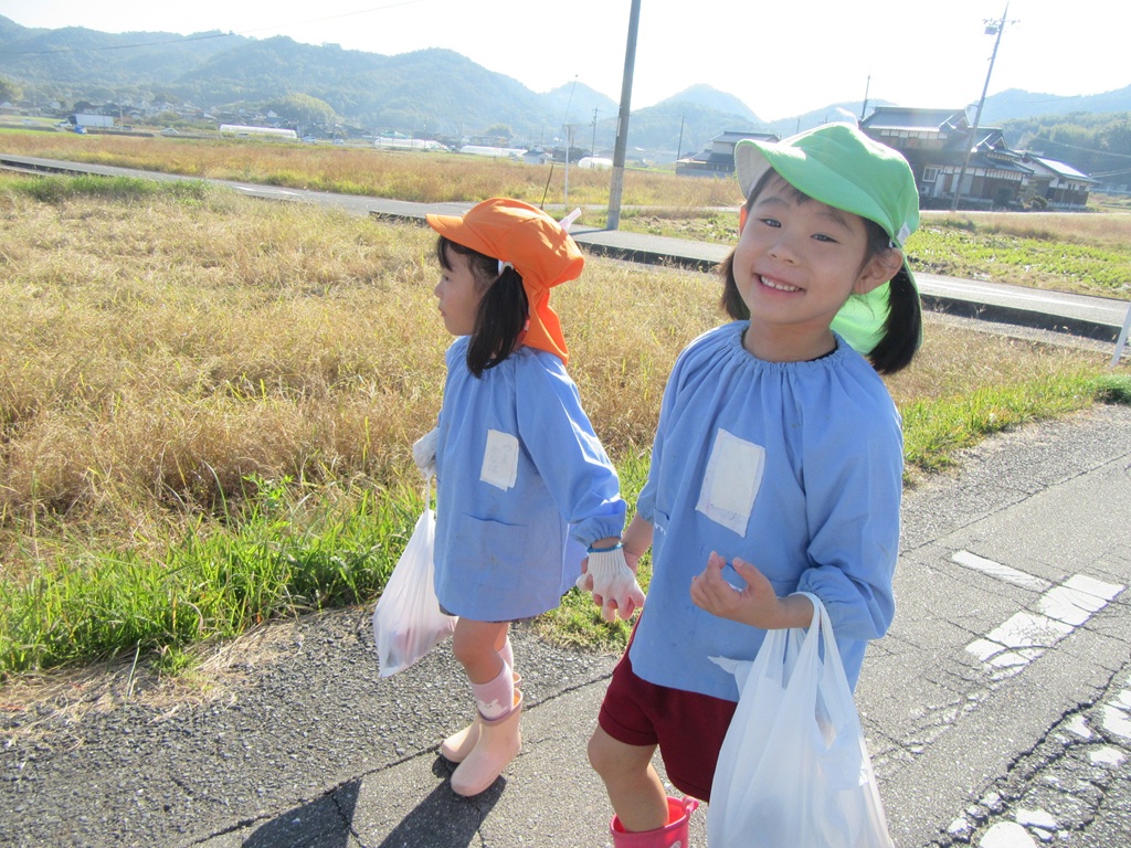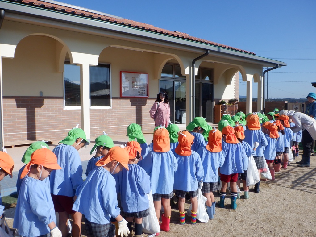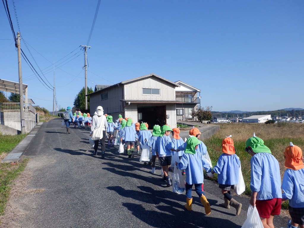 待ちに待ったお芋掘りの日でした。自分のスコップを用意して、長靴を履き、軍手をはめて、準備万端です。めろん組とみかん組で手を繋ぎ、ワクワクしながら、サツマイモ畑まで歩いていきました。通り道には、角力取山の松の木が見えました。園長先生から松が500歳だと聞いて、子どもたちもびっくりです!😲