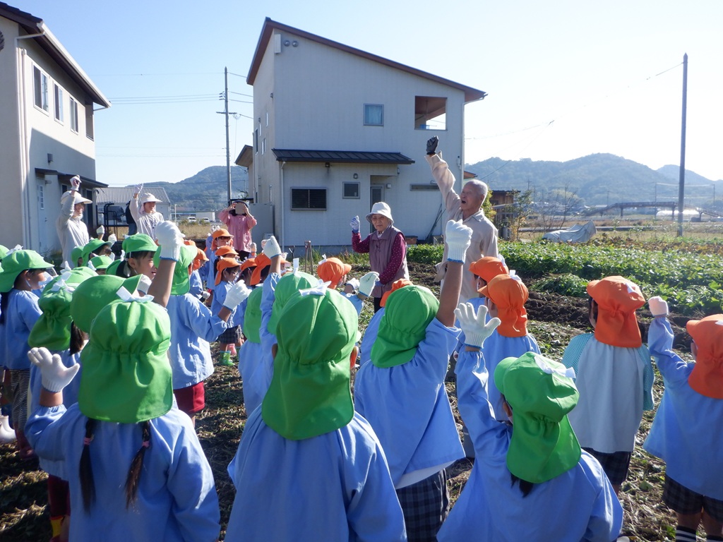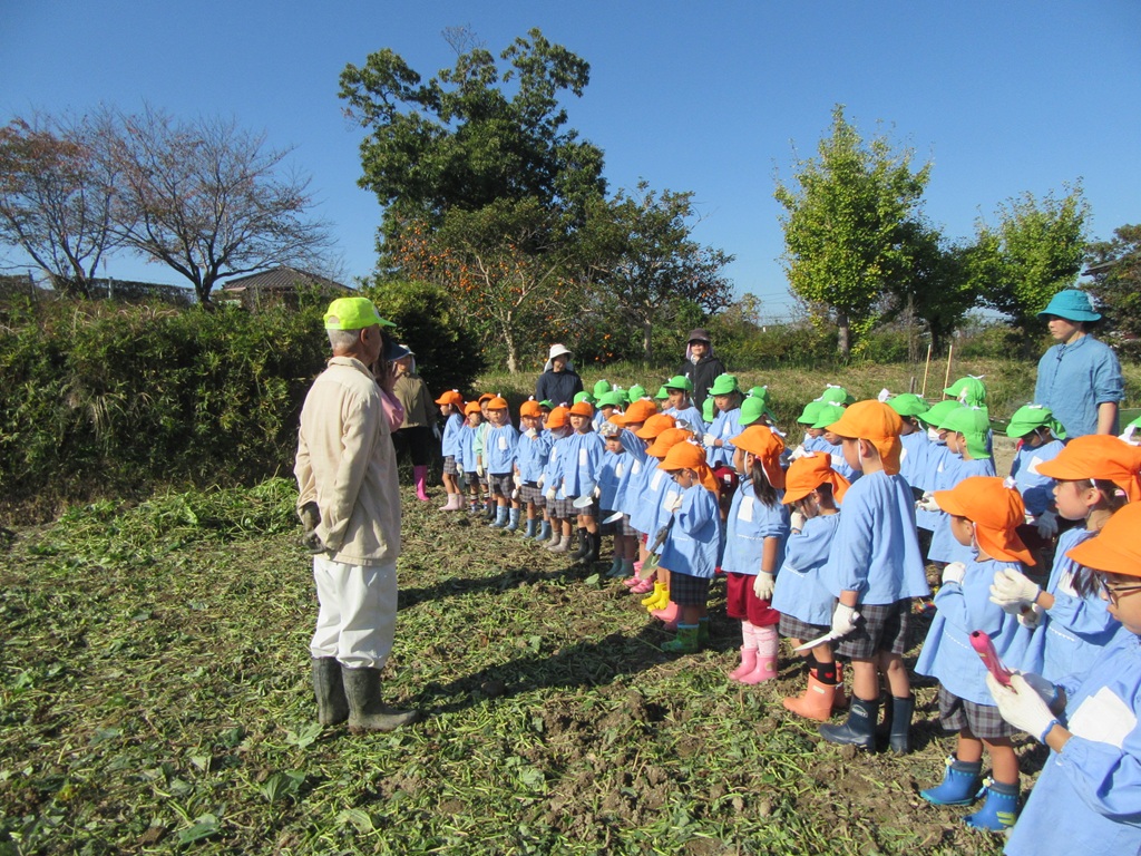 畑に到着しました!「おはようございます」と徳山さんに元気にあいさつをし、お芋の掘り方について話を聞きました。気合いを入れる「えいえいおー✊」のかけ声でお芋掘りスタートです✨