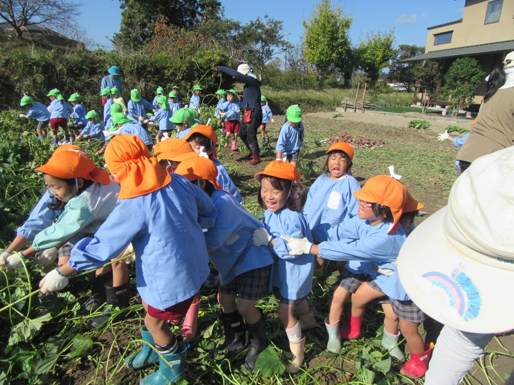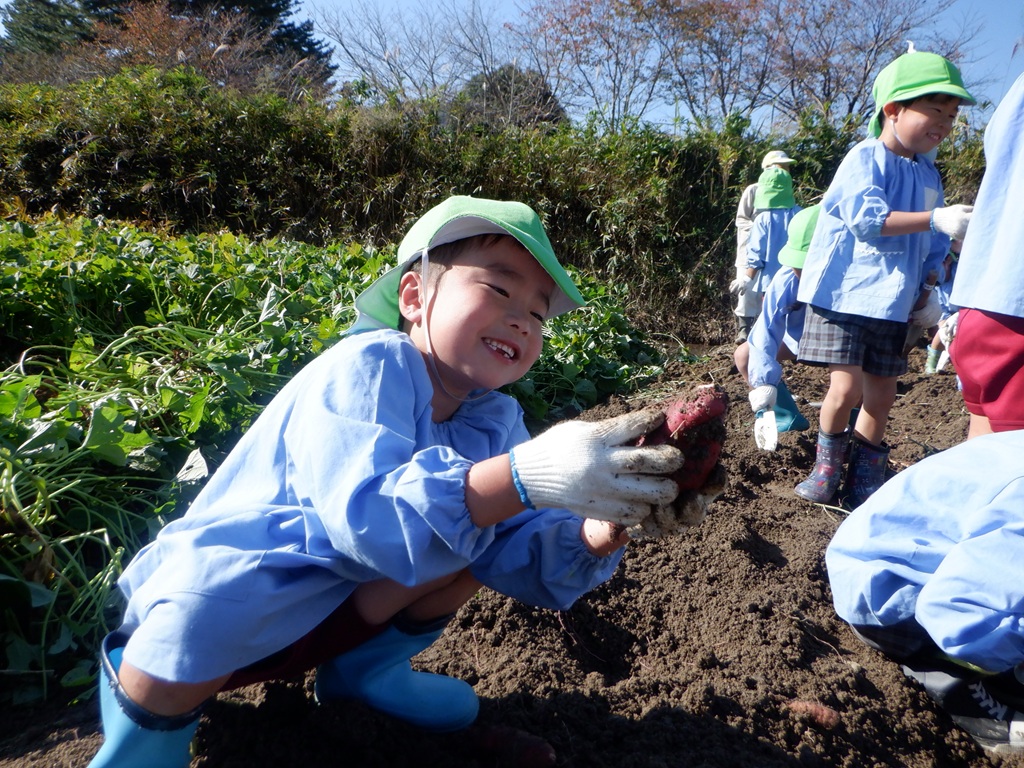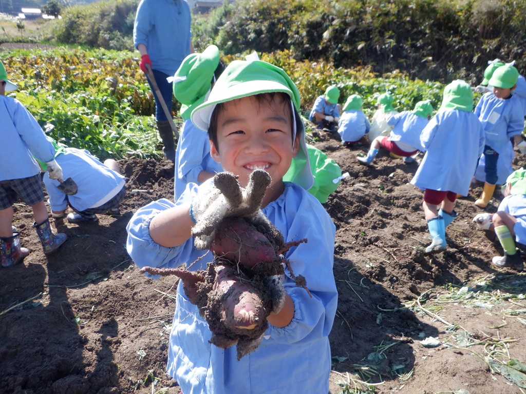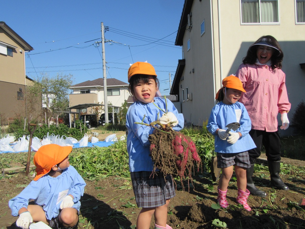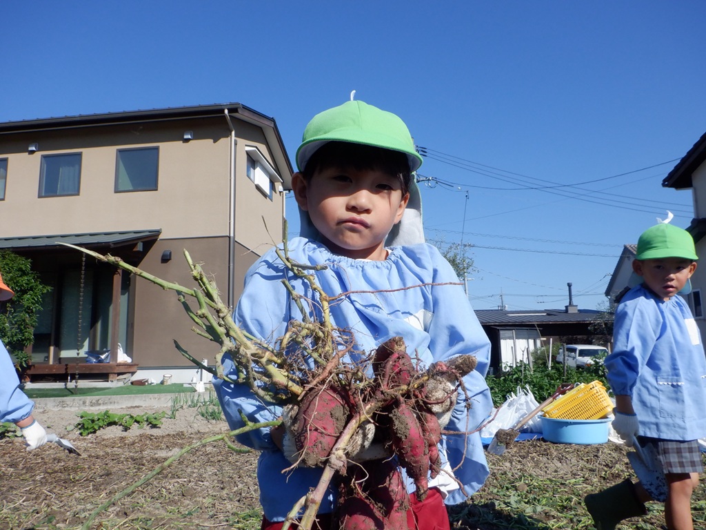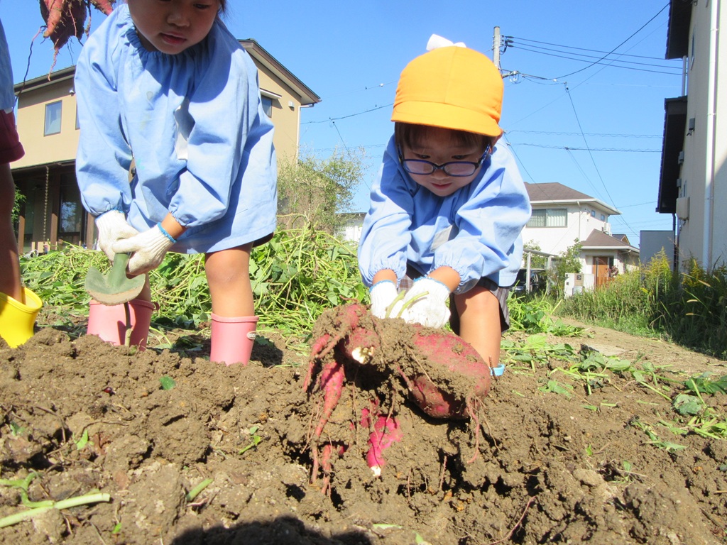 「よいしょ」と勢いよく引っ張ると、大きなお芋に小さなお芋、たくさんくっついているお芋など、いろいろなお芋がかおをのぞかせました。子どもたちは面白さを感じたり、喜んだりして手を休めることなく掘り続けていきます。😊