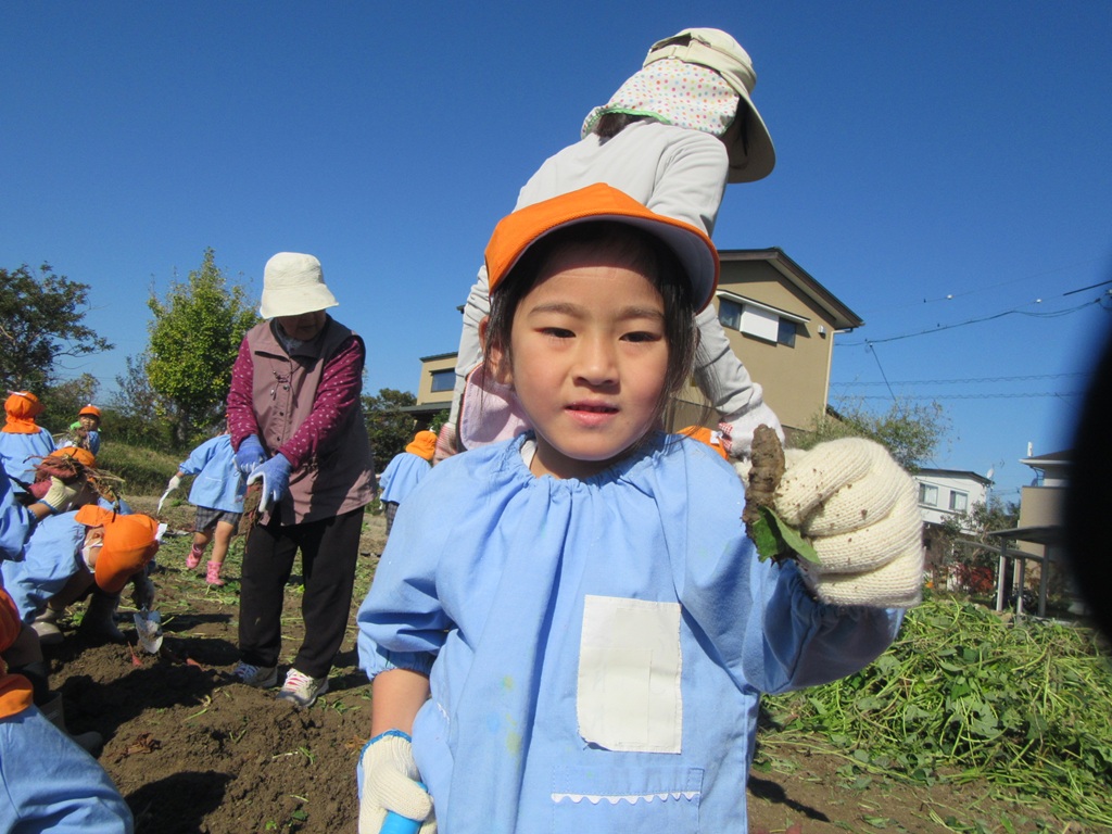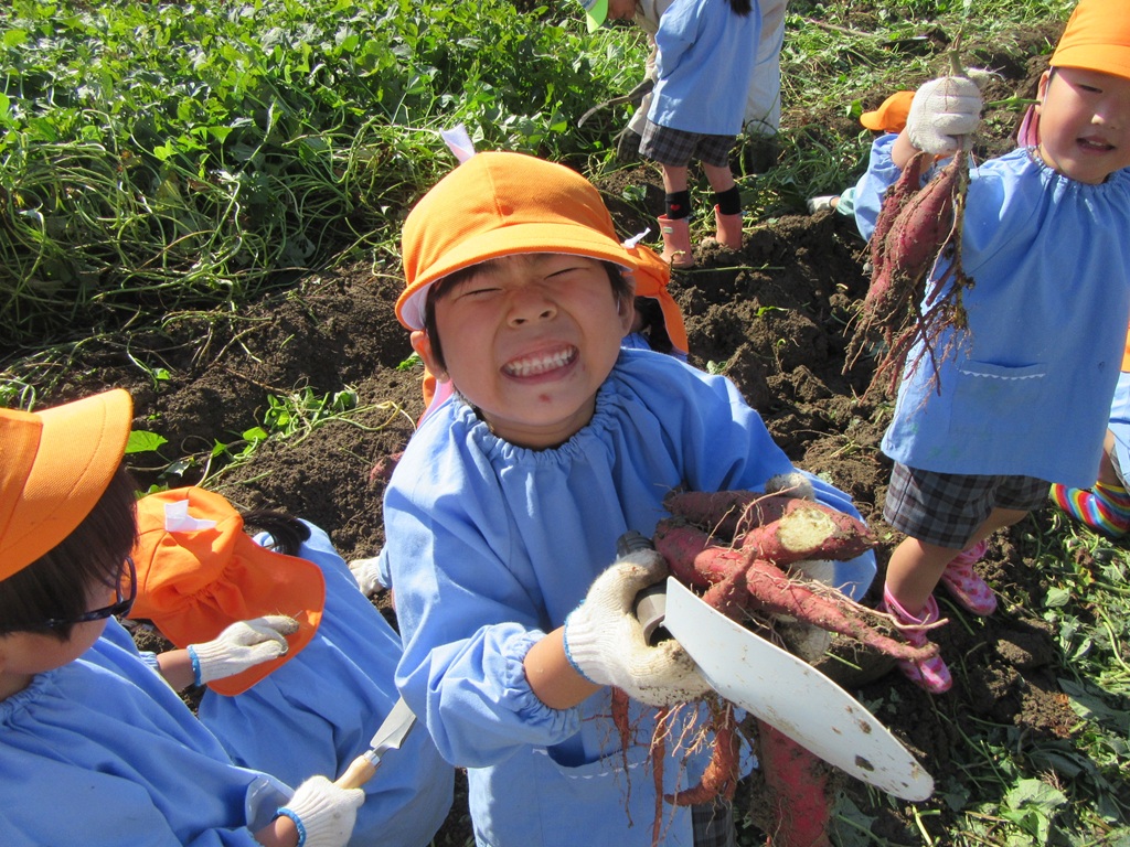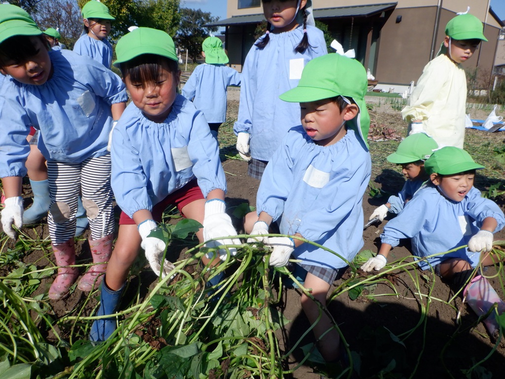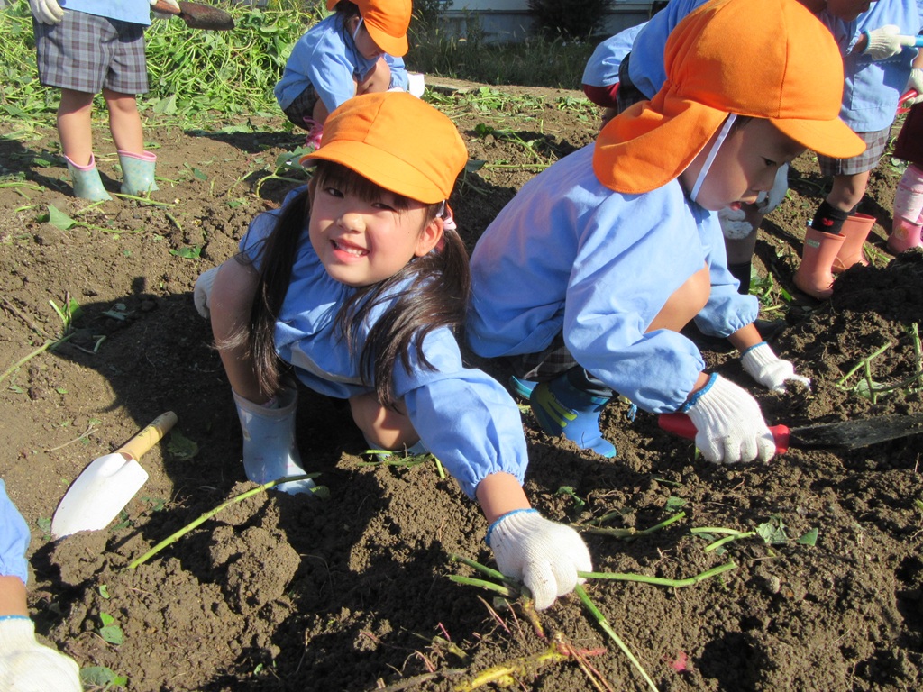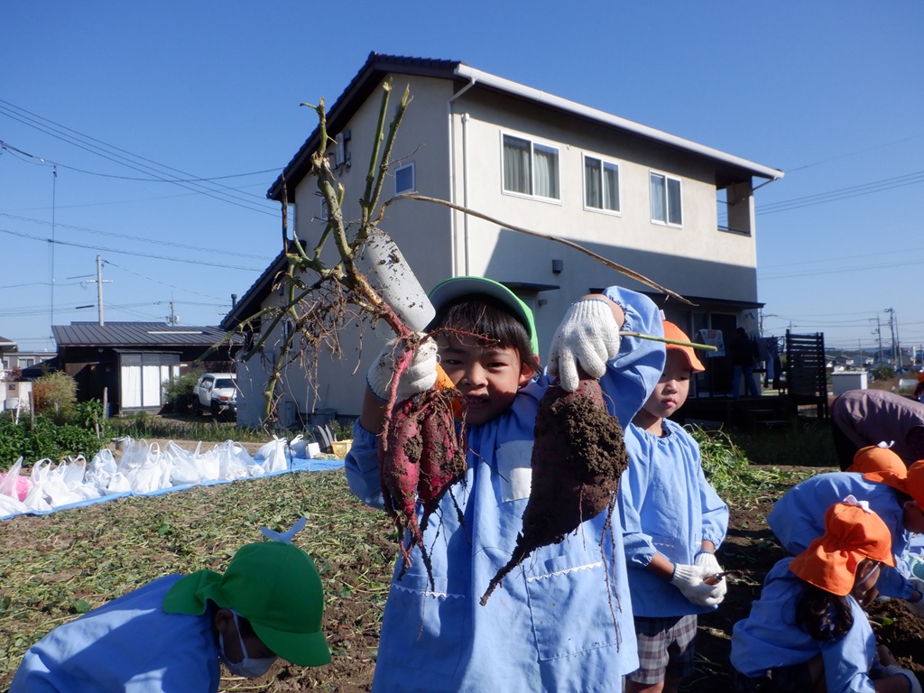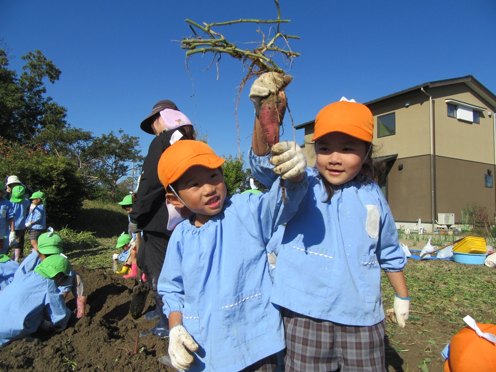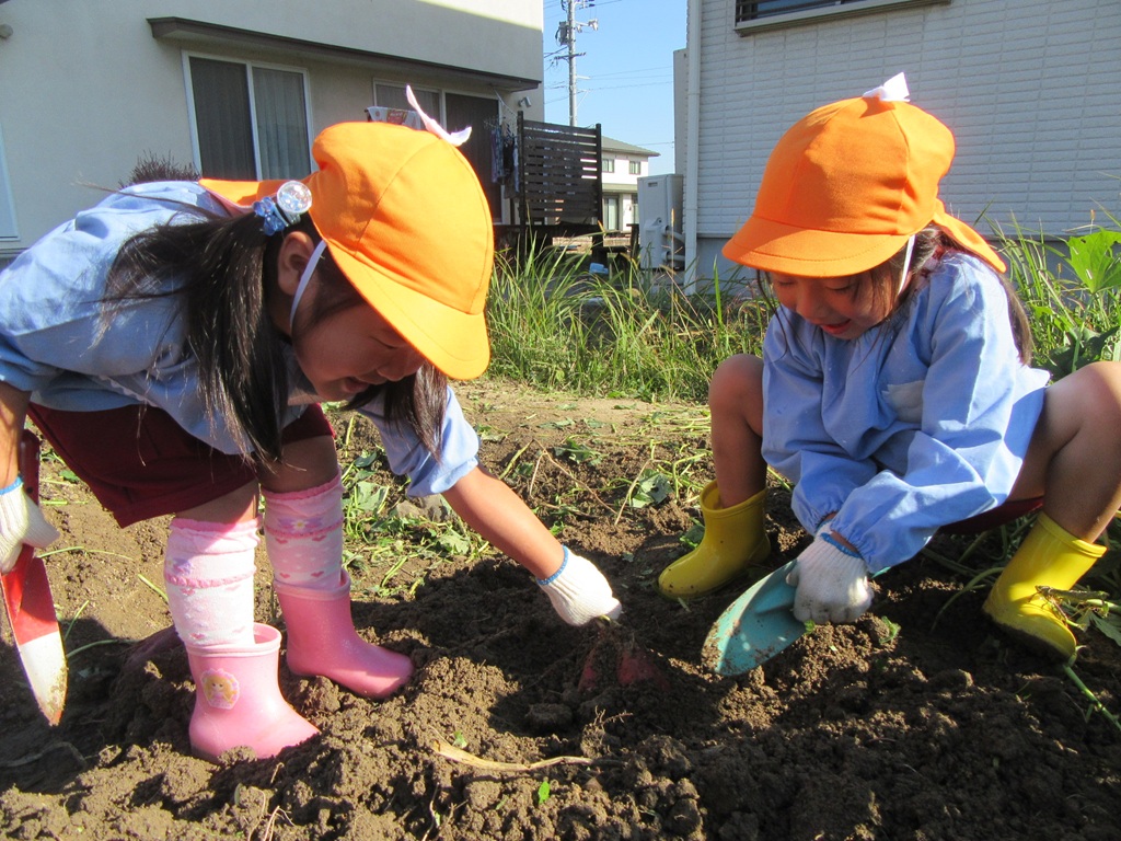 「よいしょ」と勢いよく引っ張ると、大きなお芋に小さなお芋、たくさんくっついているお芋など、いろいろなお芋がかおをのぞかせました。子どもたちは面白さを感じたり、喜んだりして手を休めることなく掘り続けていきます。😊