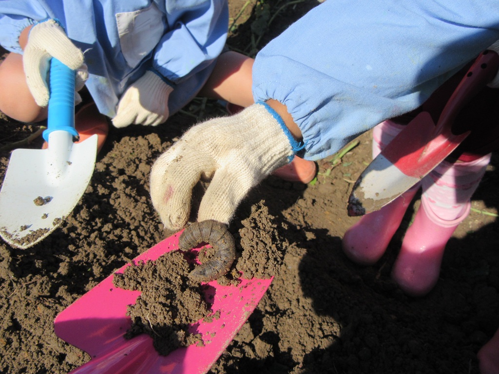 土を掘るなかで、いろんな虫たちにも出会いました。見たことのない大きさの芋虫に子どもたちはびっくり😲見たり触れたりしたあとは、土にかえしました。また春に出会えるといいですね💕