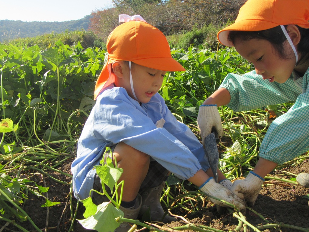 スコップで土を掘っていくと、お芋が顔を覗かせました。子どもたちも「見えた!」とわくわくした表情で友達と土を掘り進めていました🎵