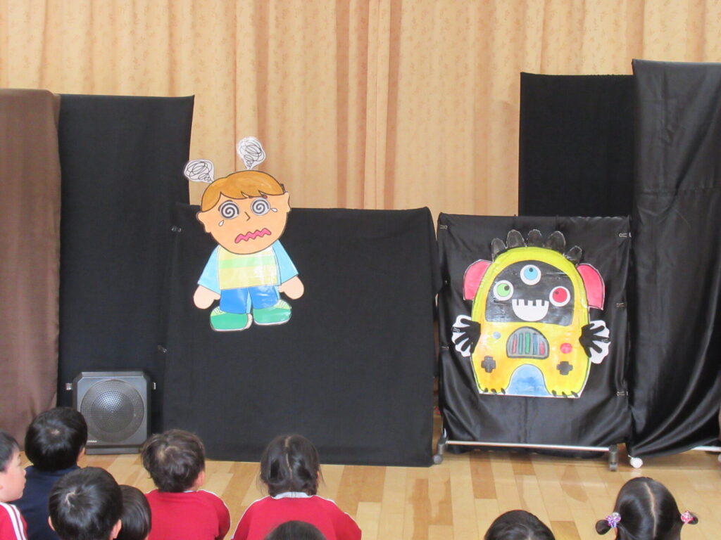 そこに、メディア怪獣が現れました。「ゲームばかりしていると、メディア怪獣になるんだよ~」