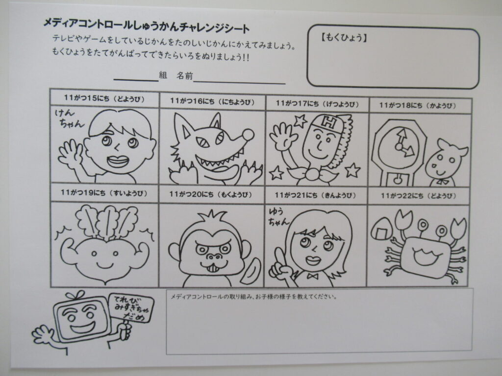 11月15日(土)~11月22日(土)はメディアコントロール週間です。お家の人と、一緒にメディアを使わない日を作りましょう。ずーっと、テレビや、タブレットを見ていると、困ったことが増えてきます。