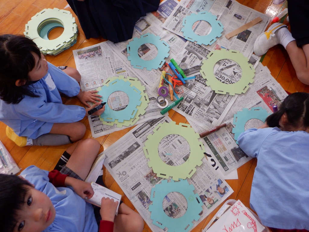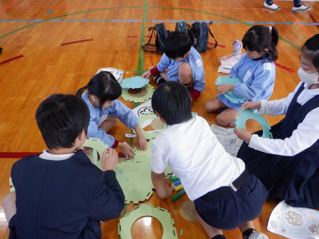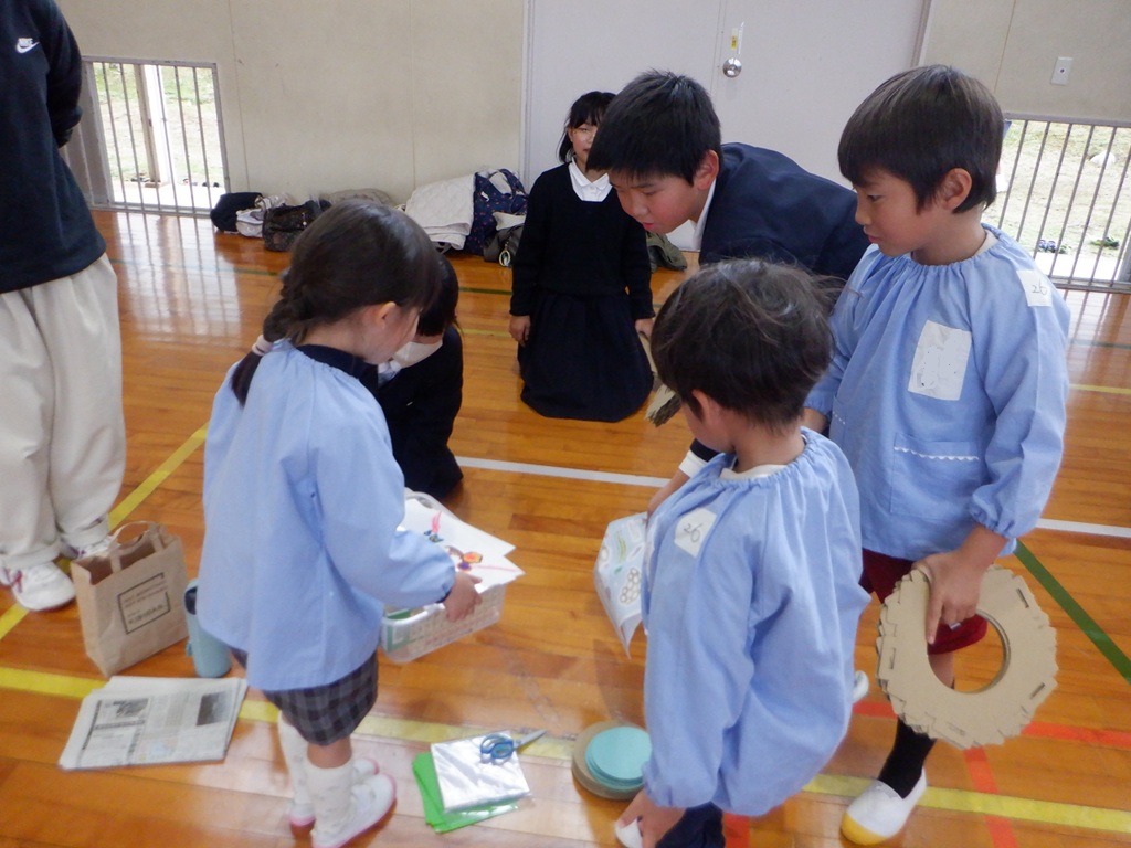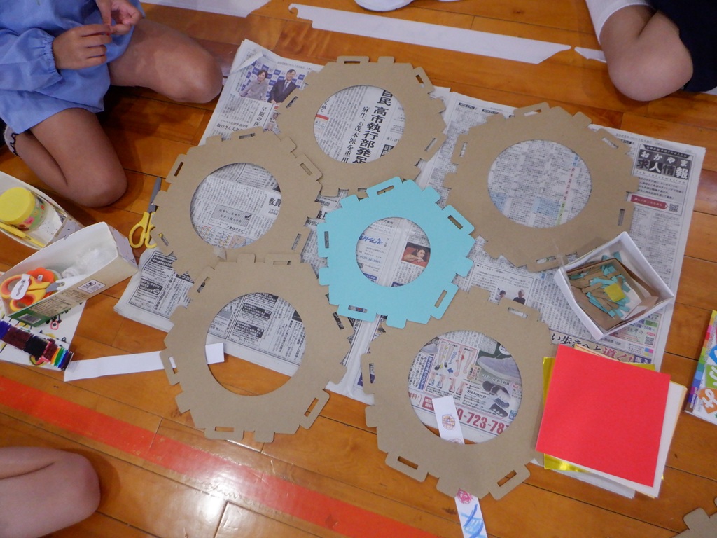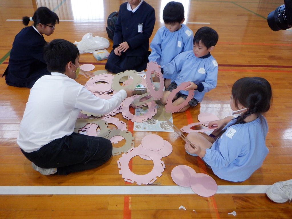 山手幼稚園年長クラスのお友達や山手小学校の5年生、岡山県立大学の学生さんと交流をしました。今回は、真備町にある段ボールの会社『タケシンパッケージ株式会社』さんが知育製品を提供してくださり、5年生のお兄さんお姉さんと一緒に力を合わせて、大きなサッカーボールを作りました。