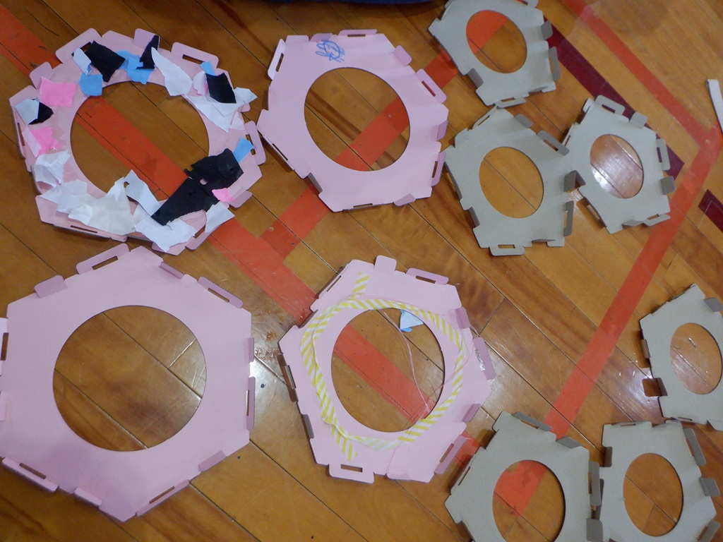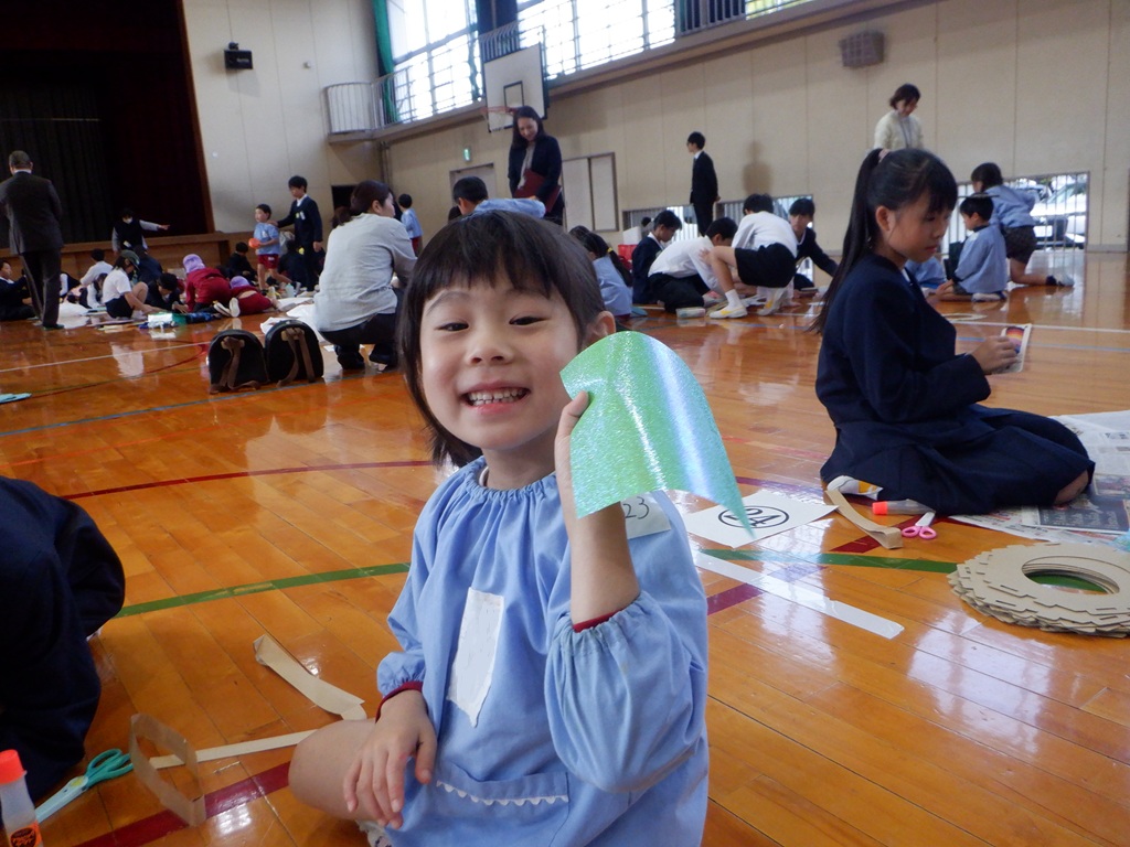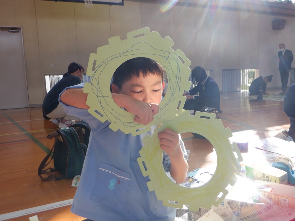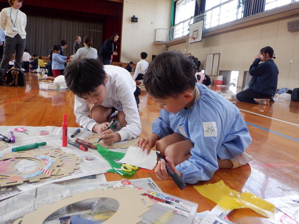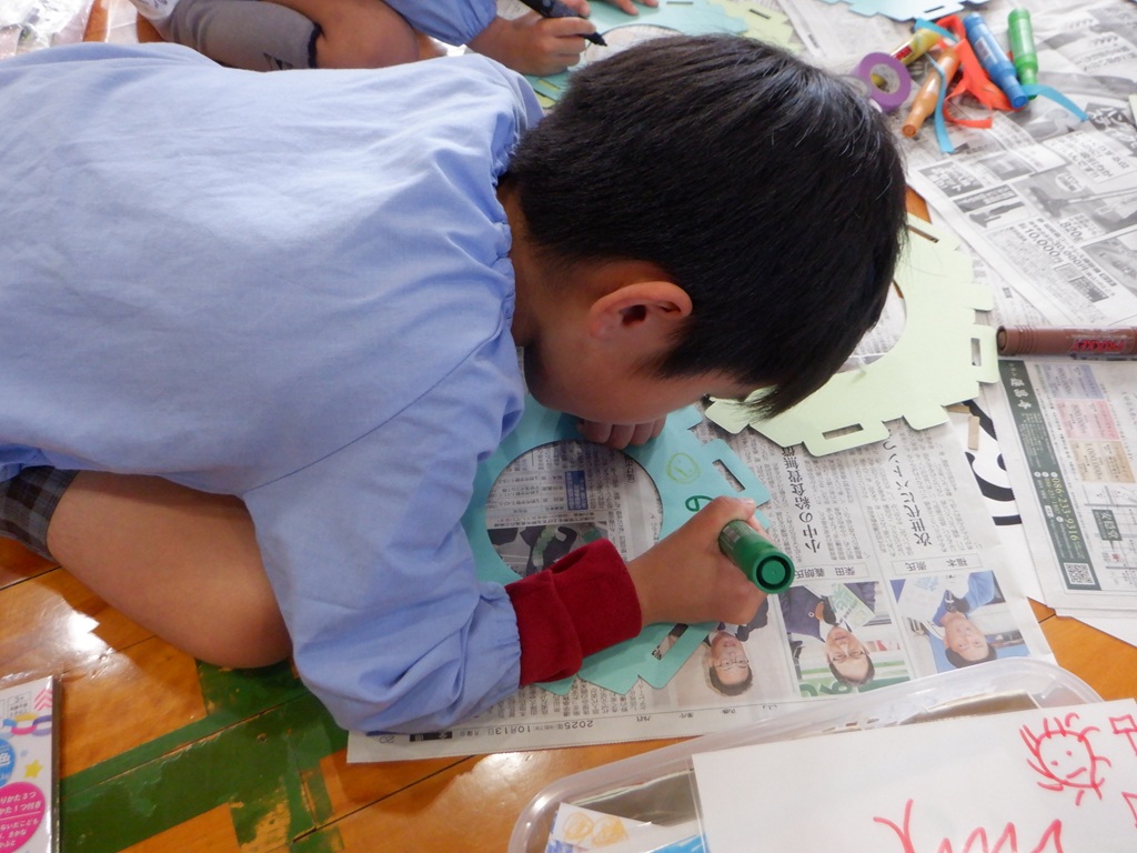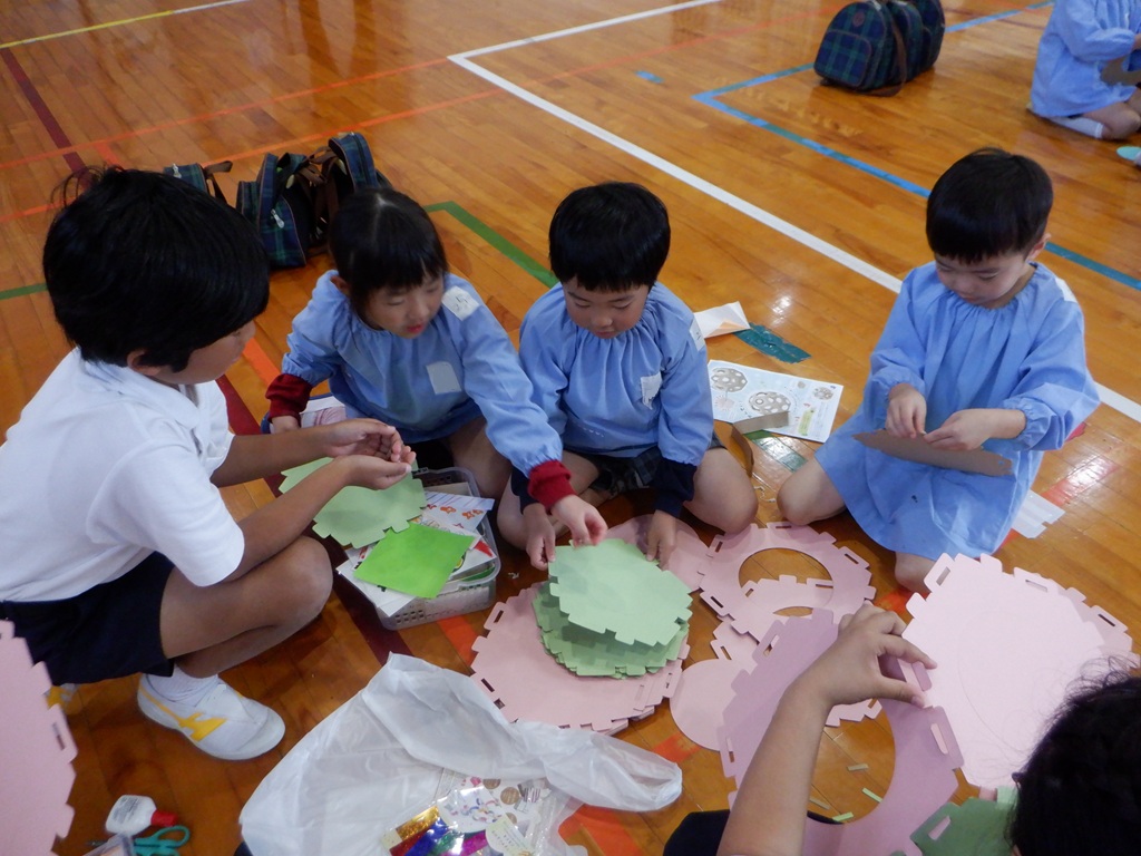 山手幼稚園年長クラスのお友達や山手小学校の5年生、岡山県立大学の学生さんと交流をしました。今回は、真備町にある段ボールの会社『タケシンパッケージ株式会社』さんが知育製品を提供してくださり、5年生のお兄さんお姉さんと一緒に力を合わせて、大きなサッカーボールを作りました。