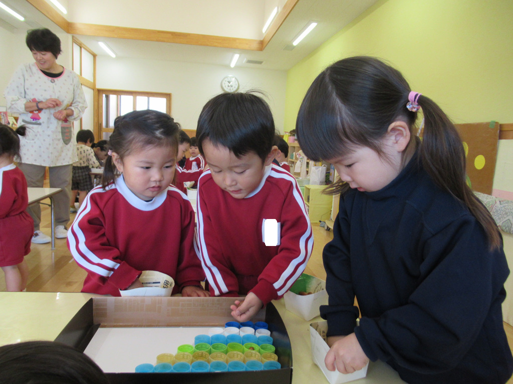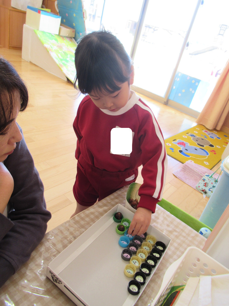 ドングリを数えながらペットボトルの蓋に1個ずつ入れて並べています。少しずつ、数にも興味を持ち始めてきました。✨