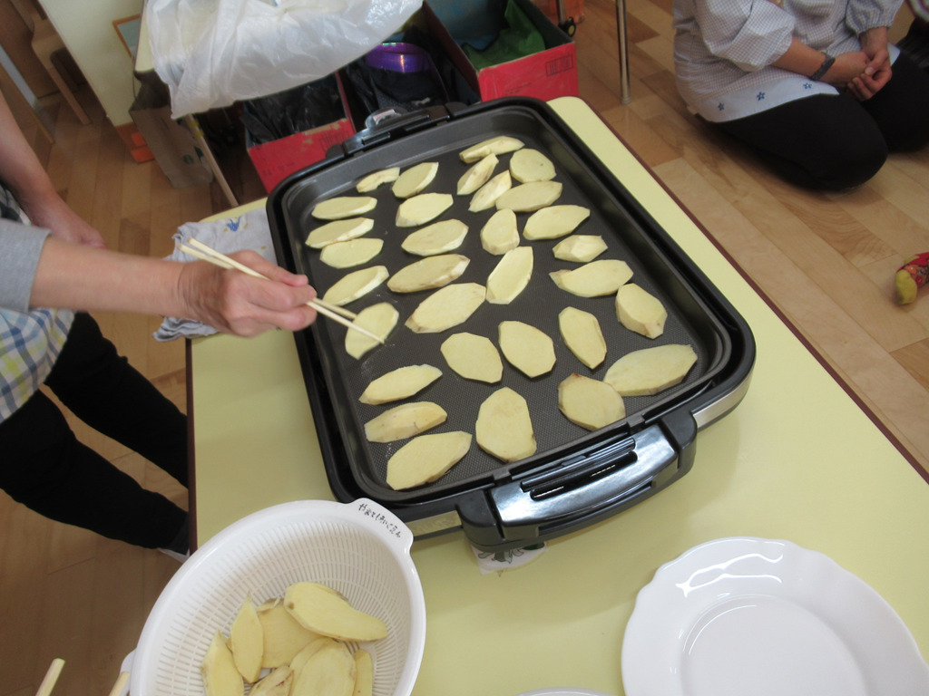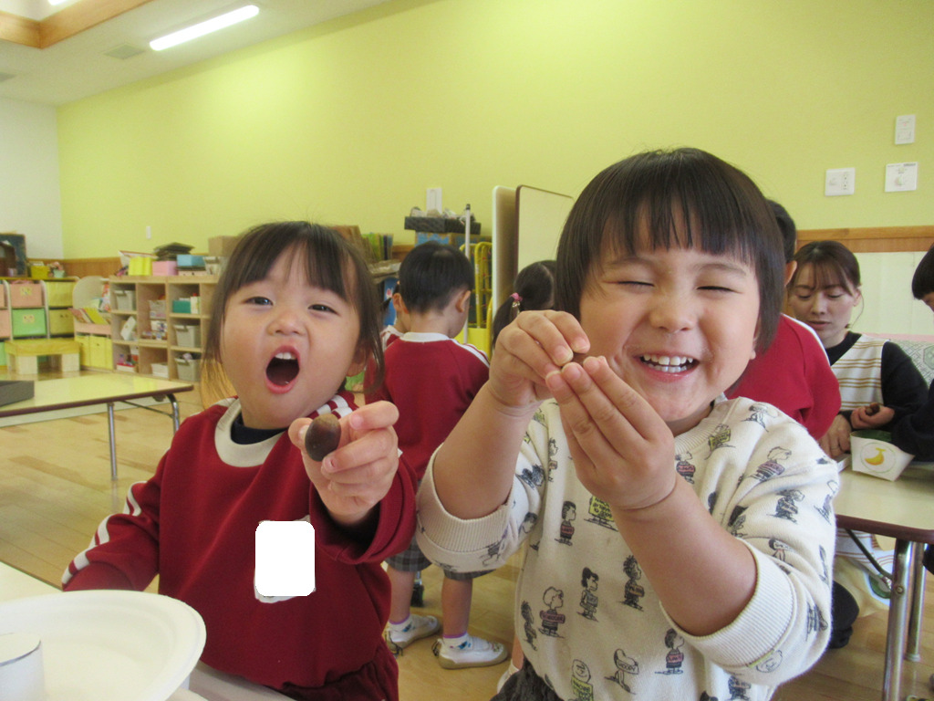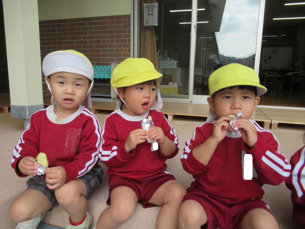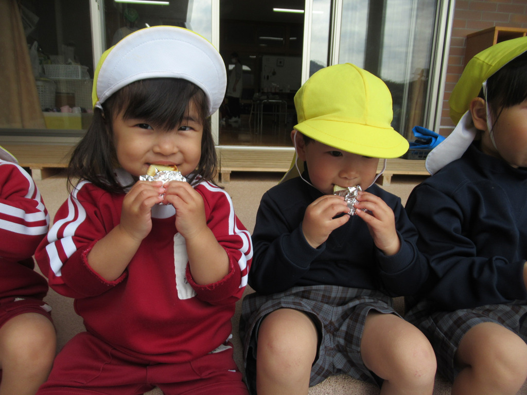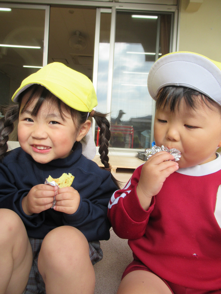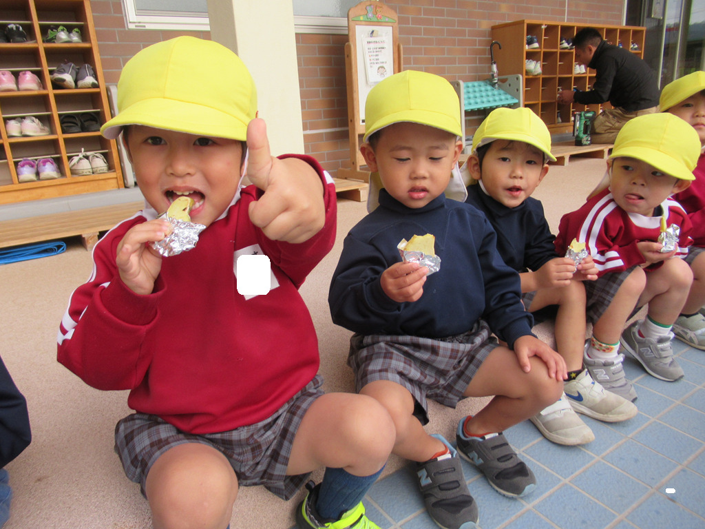 みんなで抜いたおいもを焼いて食べました。ホットプレートで焼いて良い匂いがしてくると、「早く食べたい。」と目を輝かせて見ていました。できたてあつあつのおいもを頬張って「おいしい!」とグッドサインです👍