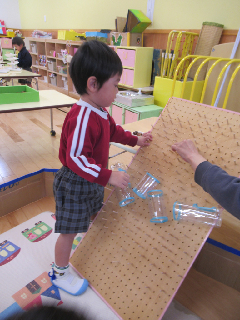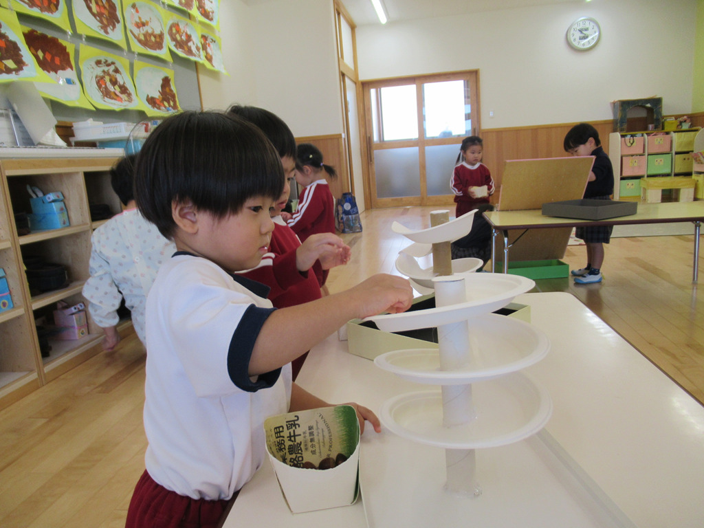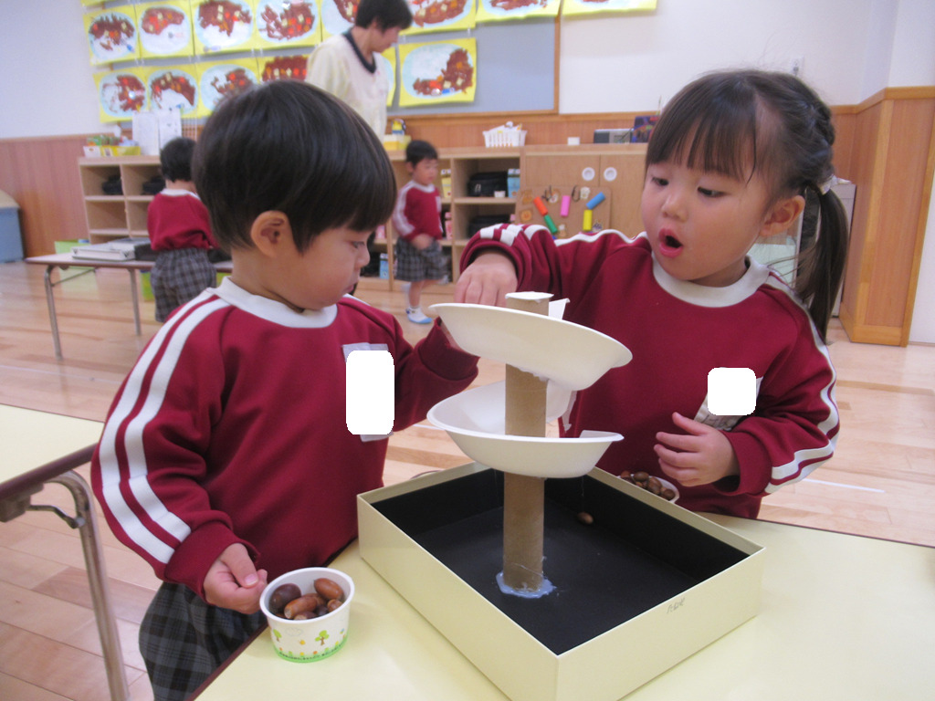 指の間にドングリを挟んで指先を使わなくてもカップに入れることができることを見せてくれます。どんぐりを使って、自分で色々な遊び方を考え楽しんでいました。