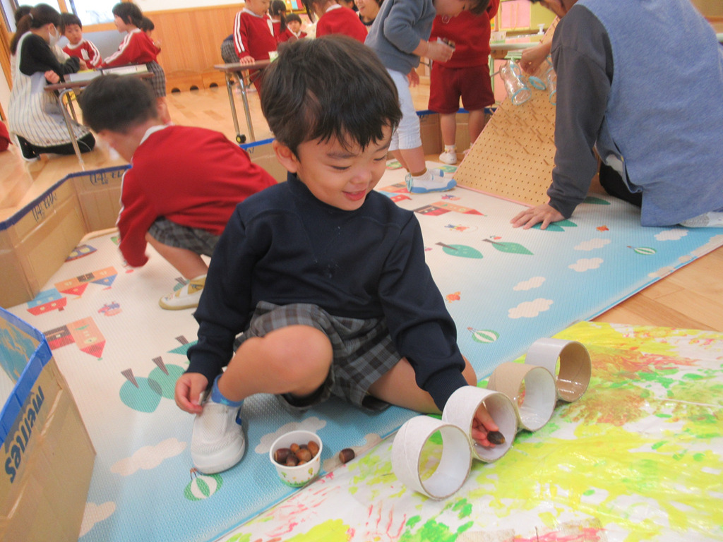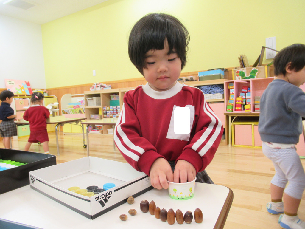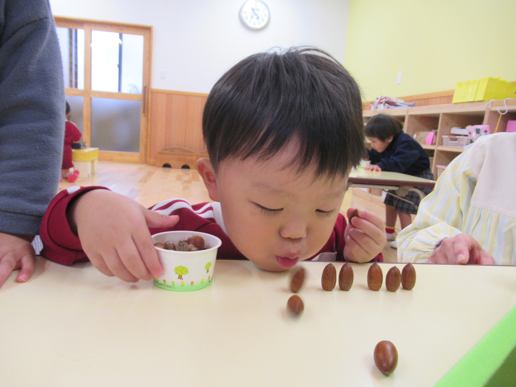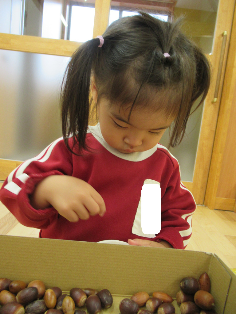 「好きなドングリさん、出ておいで。」自分の好きなドングリの形や大きさを選んでいます。💛