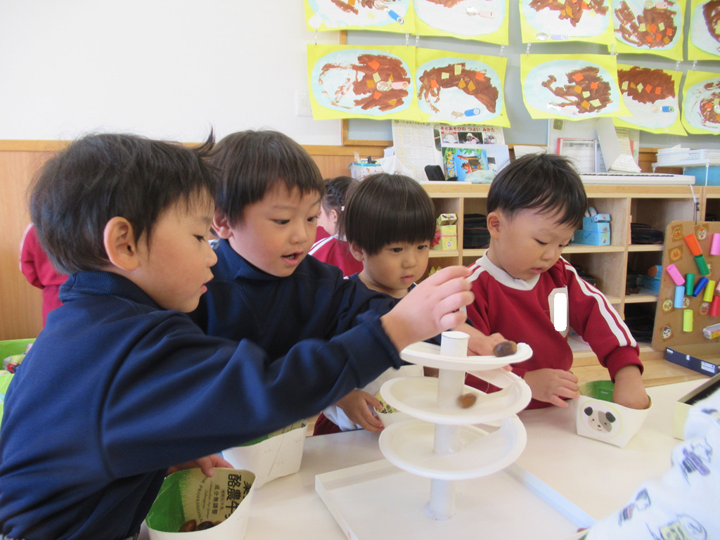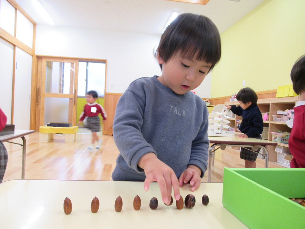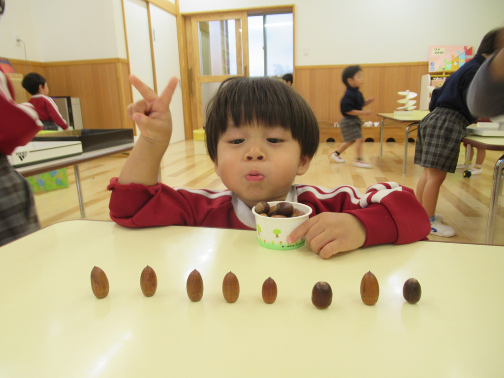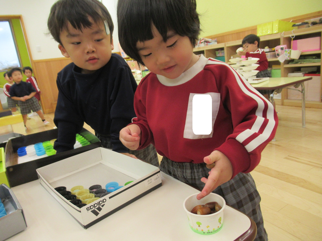 「好きなドングリさん、出ておいで。」自分の好きなドングリの形や大きさを選んでいます。💛