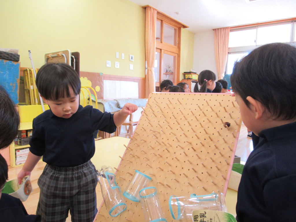 『どんぐりボード』に一つずつドングリを転がしてどこに転がっていくか最後まで見ていますね。