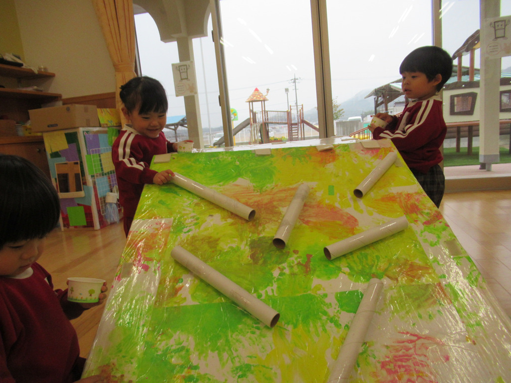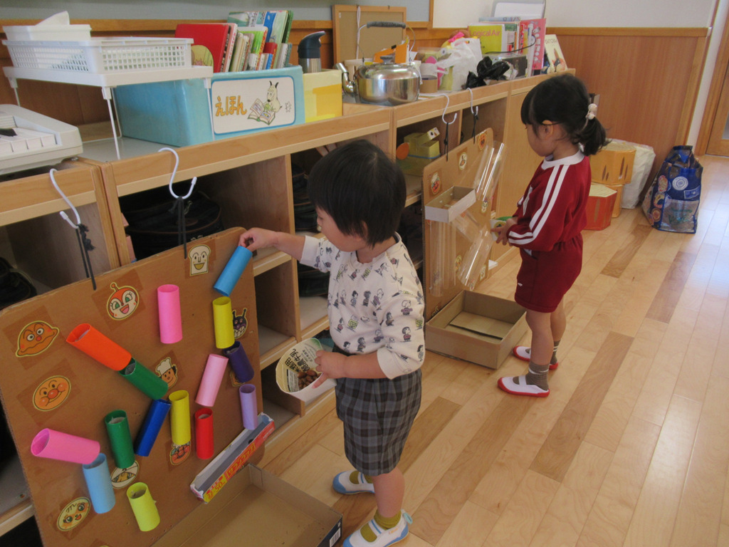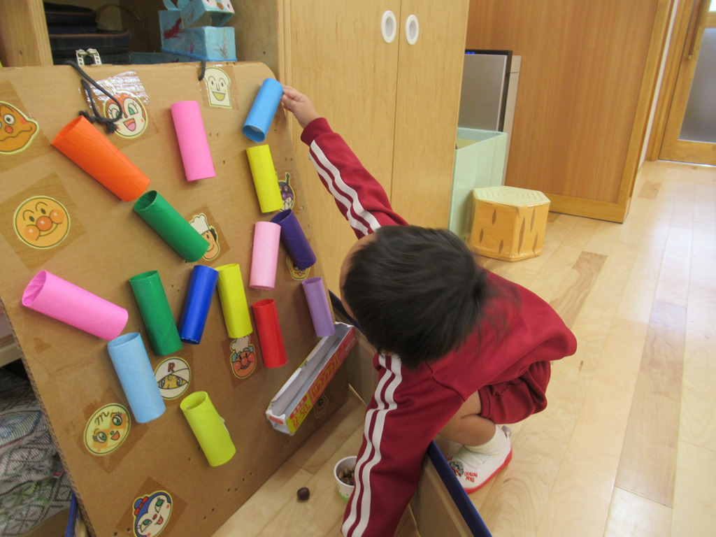 大きな坂道にサランラップの芯を貼ってどんぐりの道を作りました。好きな場所から転がしてみたり、芯の中に入れてみたりしながら転がる行方を楽しんでいます。