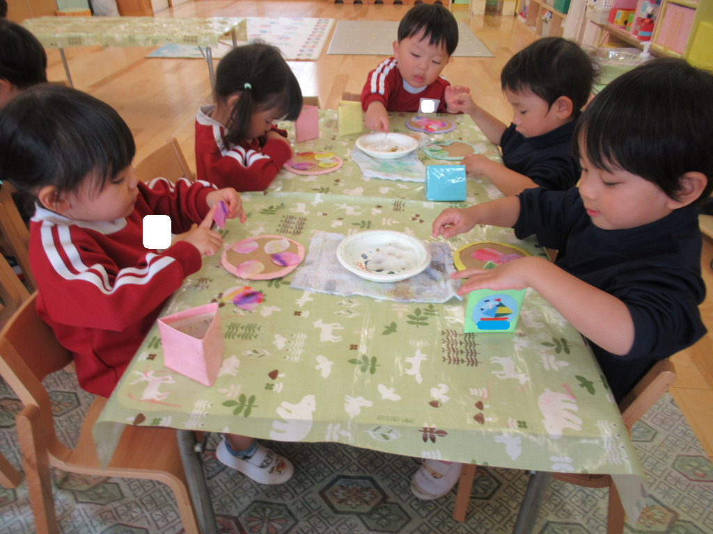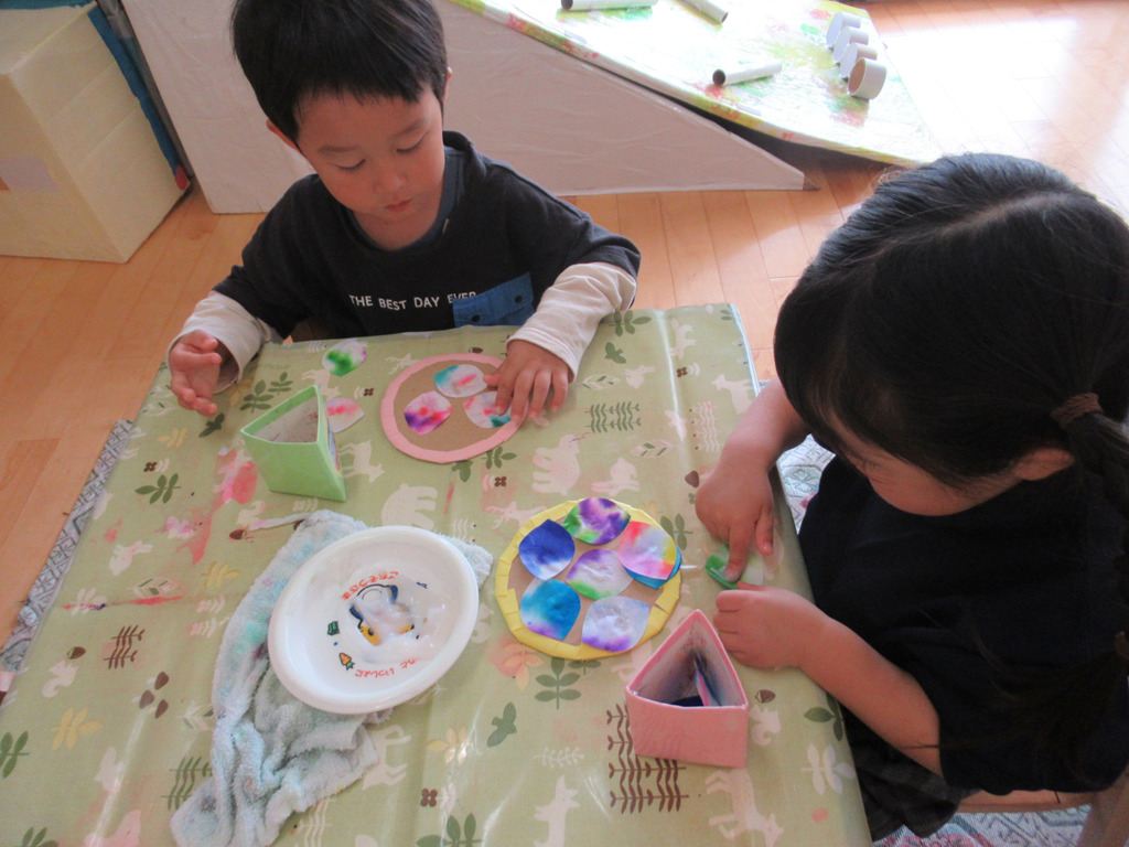 自然物を使って、「トトロのおうち」を作りました✨どんぐりやまつぼっくりが倒れないようにしっかりボンドをつけています。完成すると「せんせいみて!」「できたよ!」と嬉しそうに見せてくれました。色鮮やかな素敵なおうちができました🏠