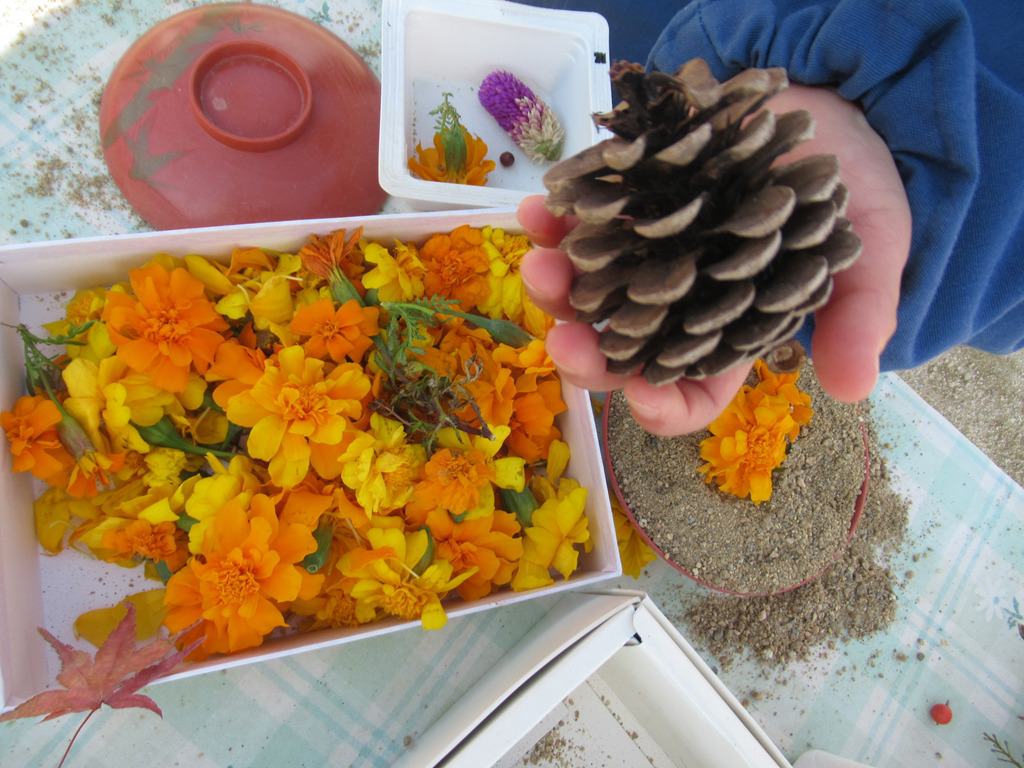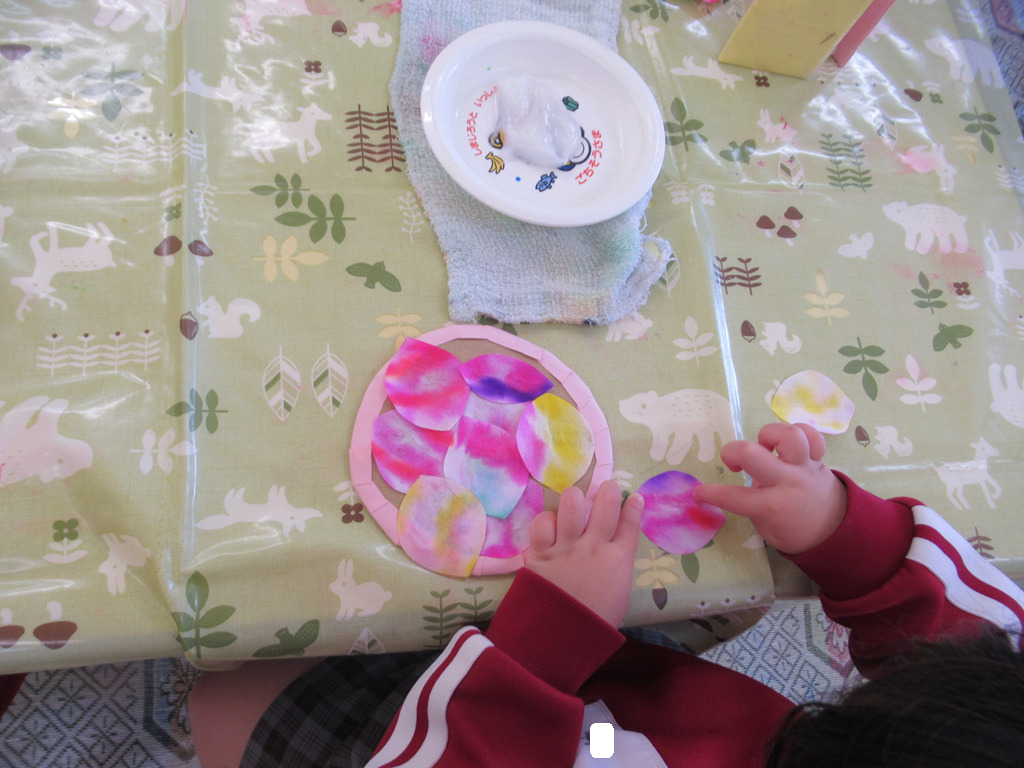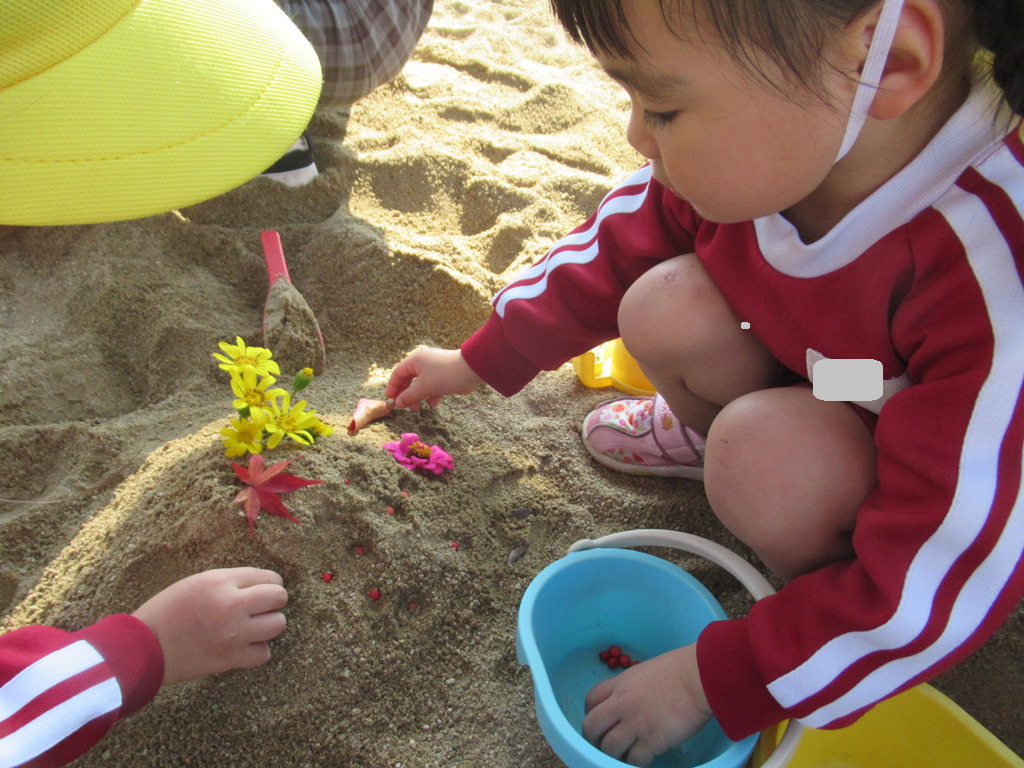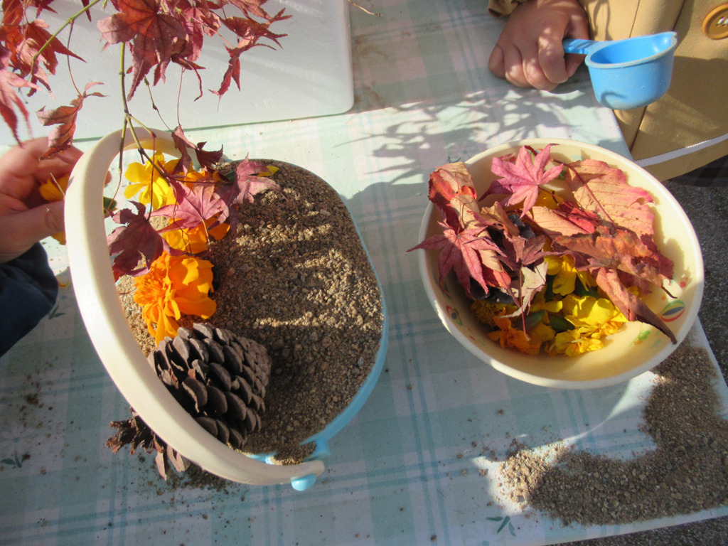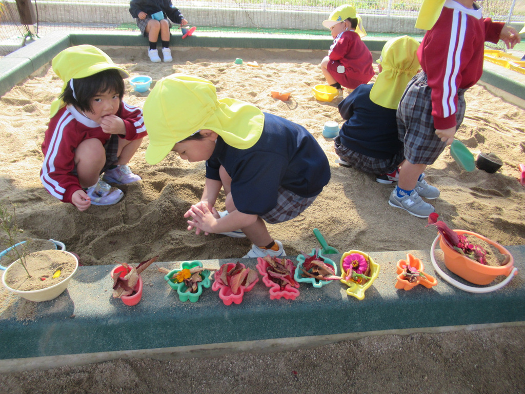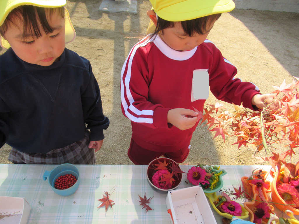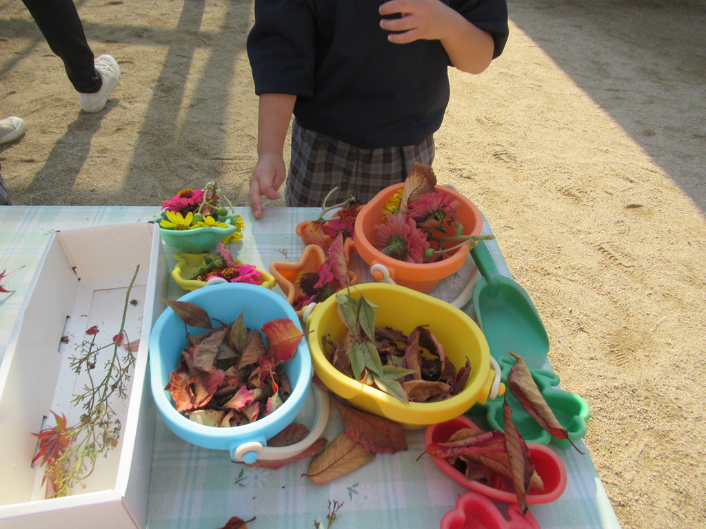 戸外では、落ち葉やお花などを使って遊びました。お皿に盛りつけてごちそうを作ったり、お店屋さんごっこをしたりしていました。