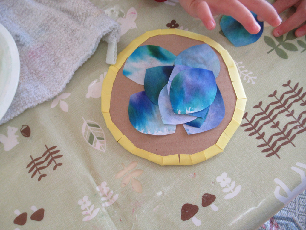 ボンドの使い方も上手になりました。指先で小さなドングリを持ってボンドを付けています。