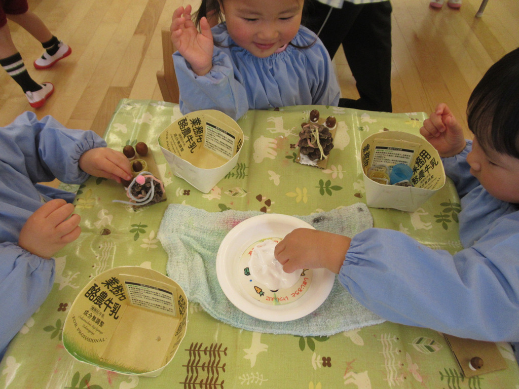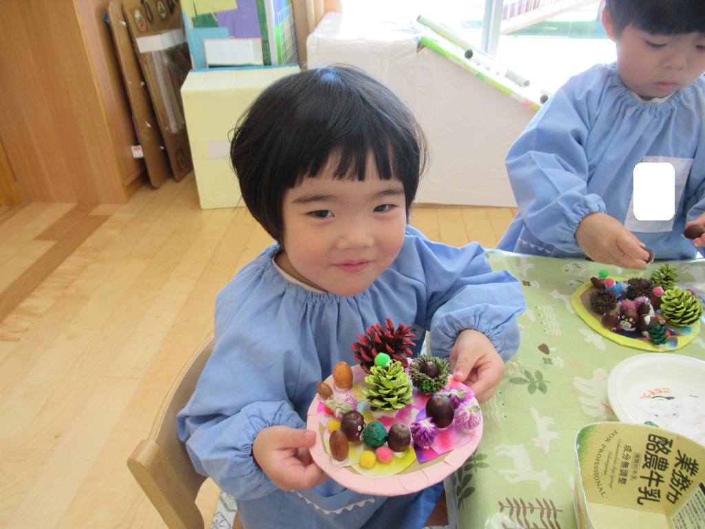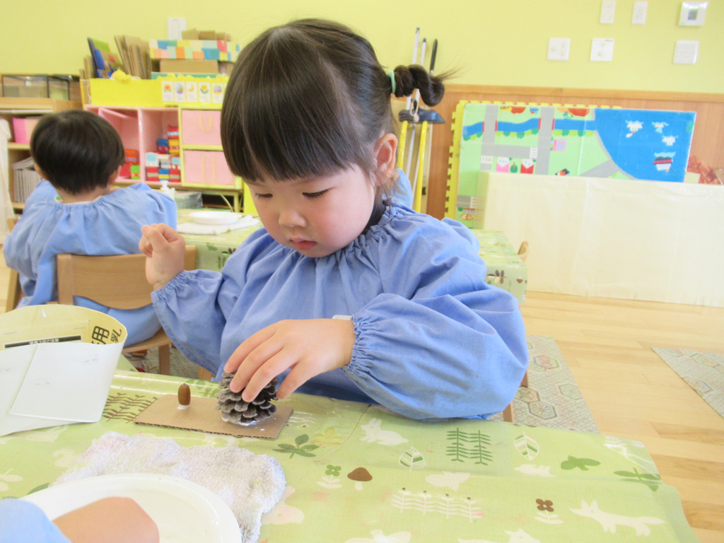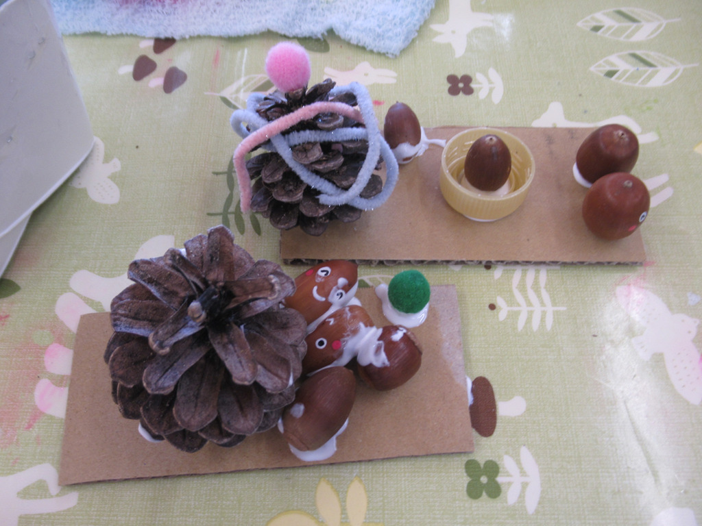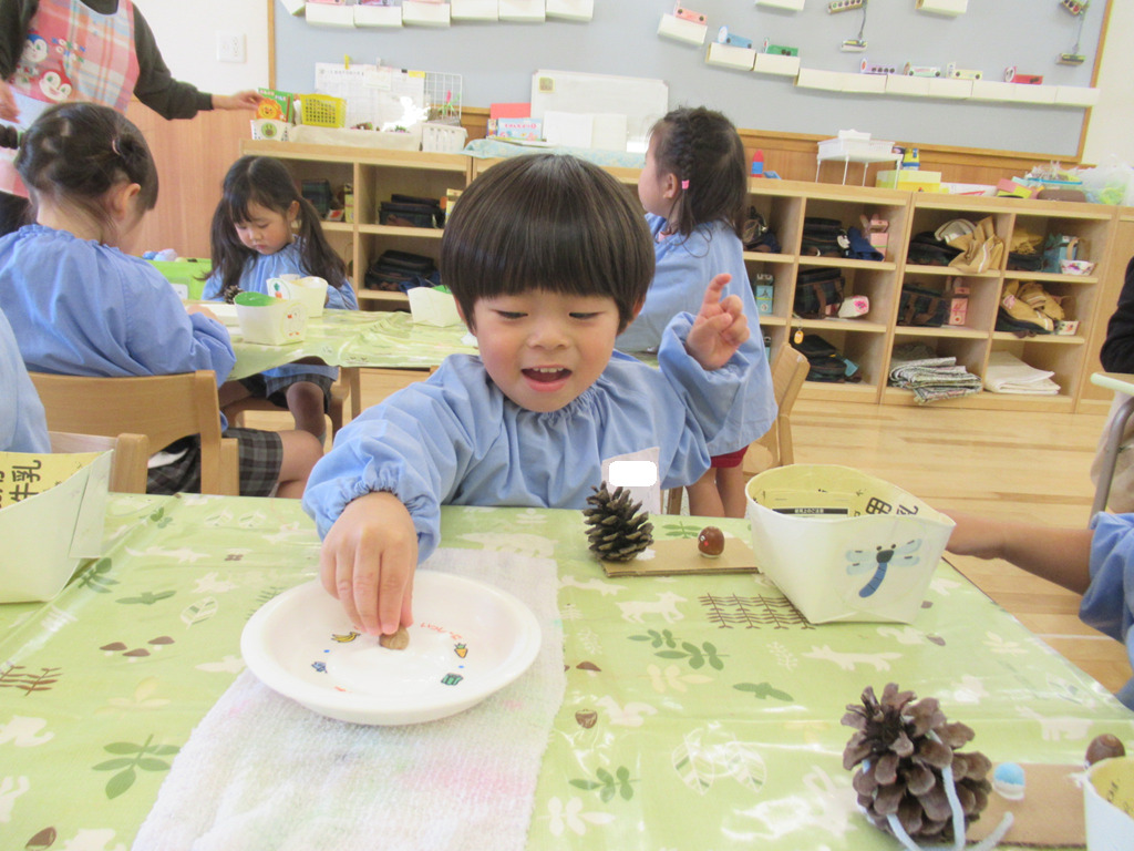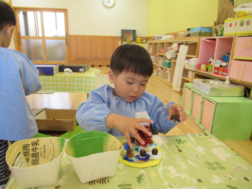 子どもたちがおうちの人とお散歩へ行ったり、お出かけをしてドングリや松ぼっくりなどの自然物を持って来てくれました。みんな興味津々です。自然物を使って遊んだり、製作をしたりして楽しみました。😊