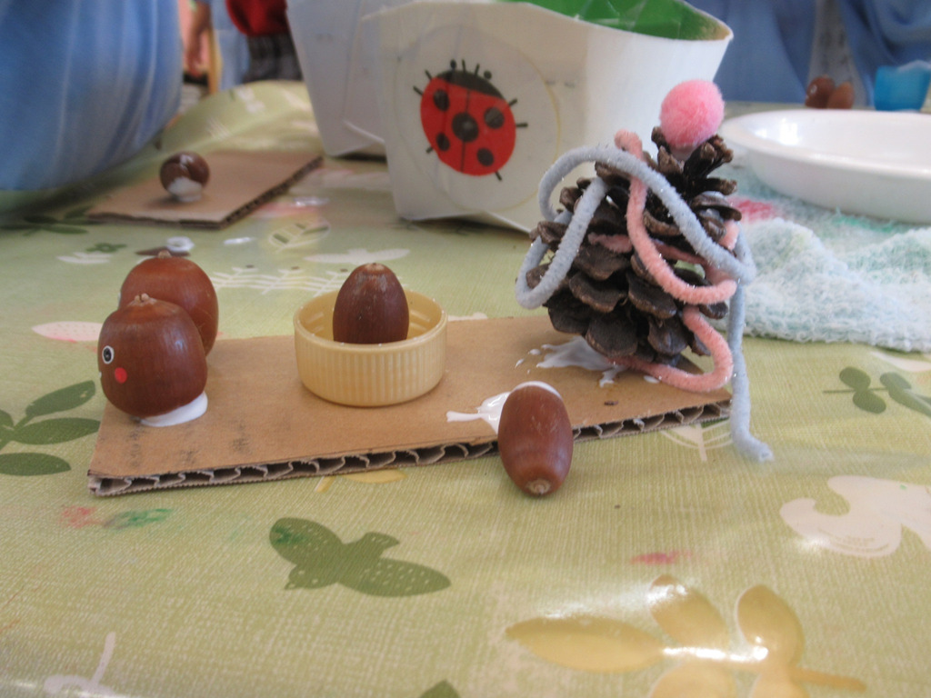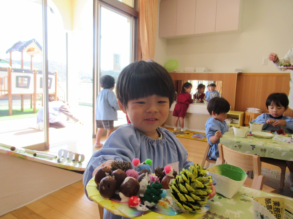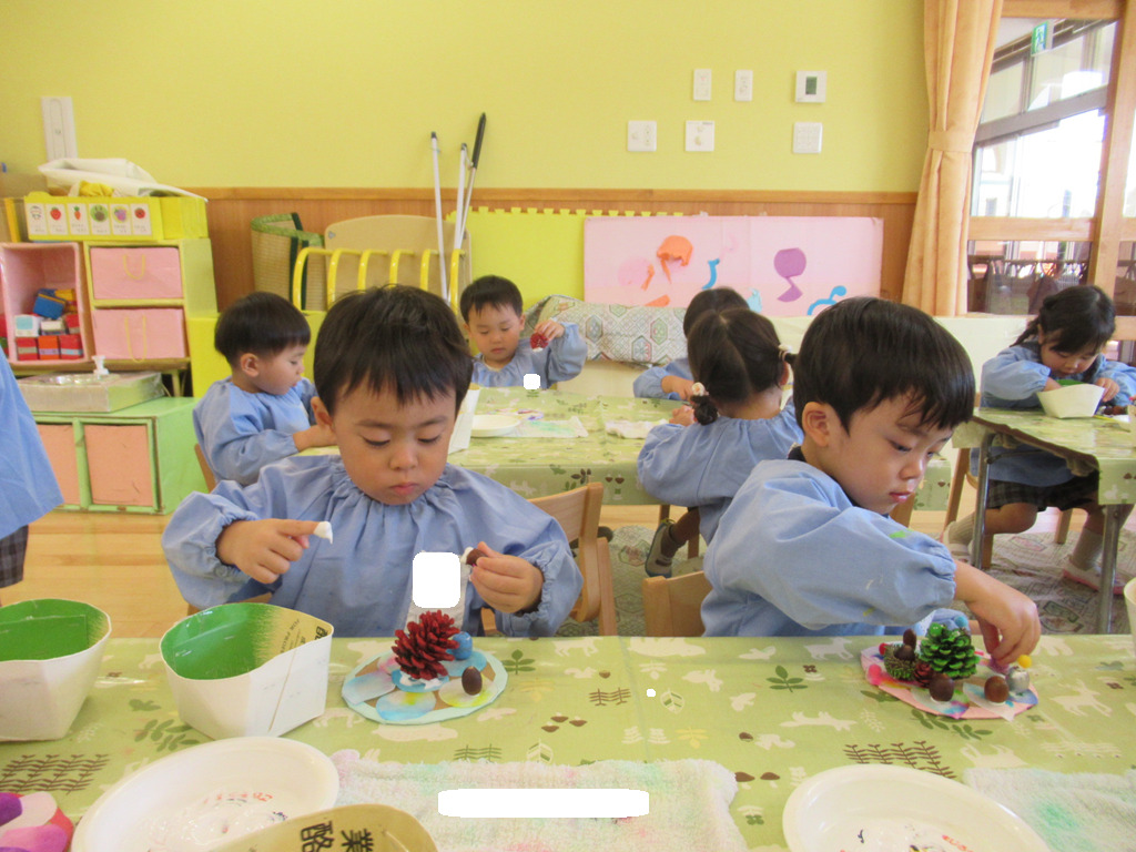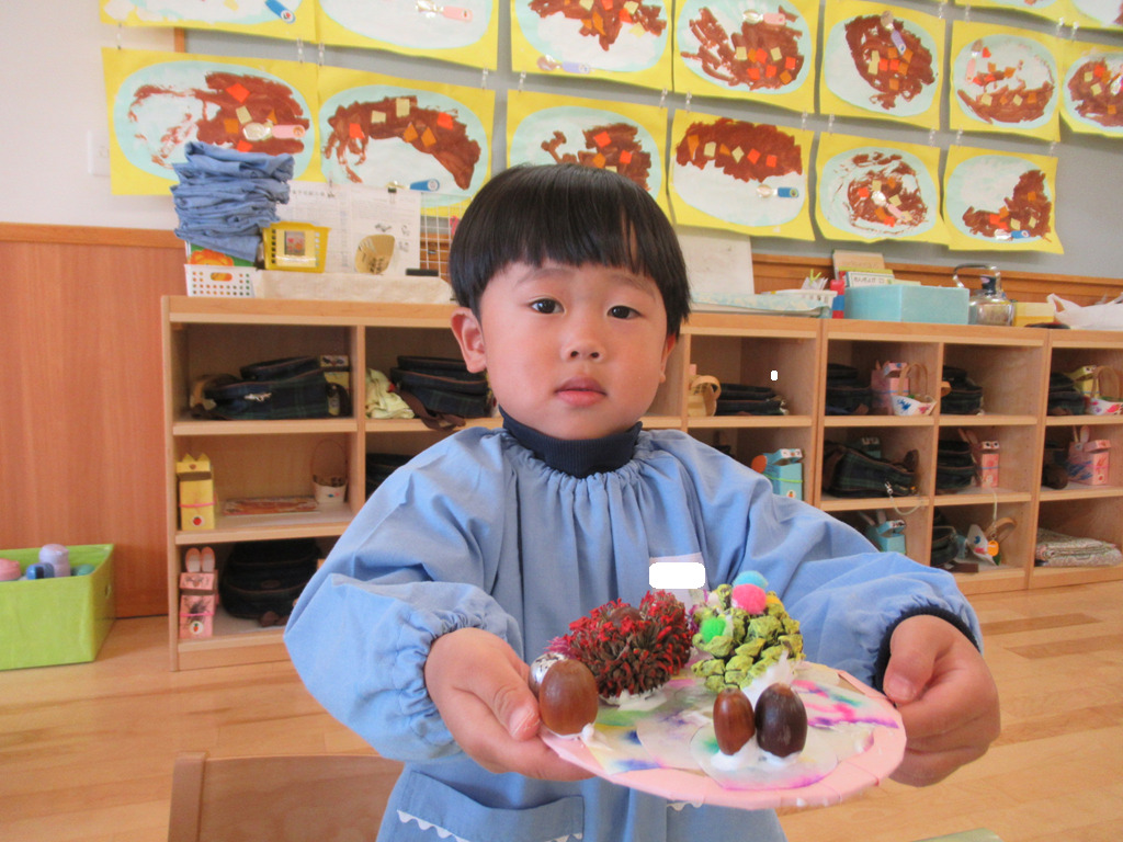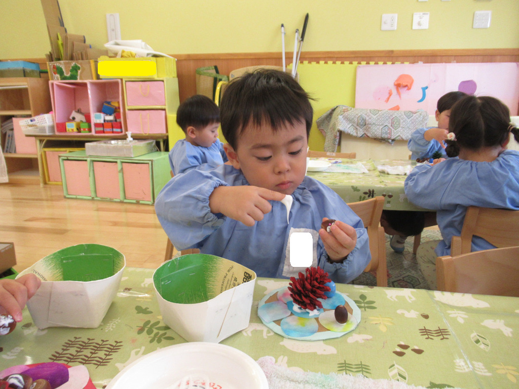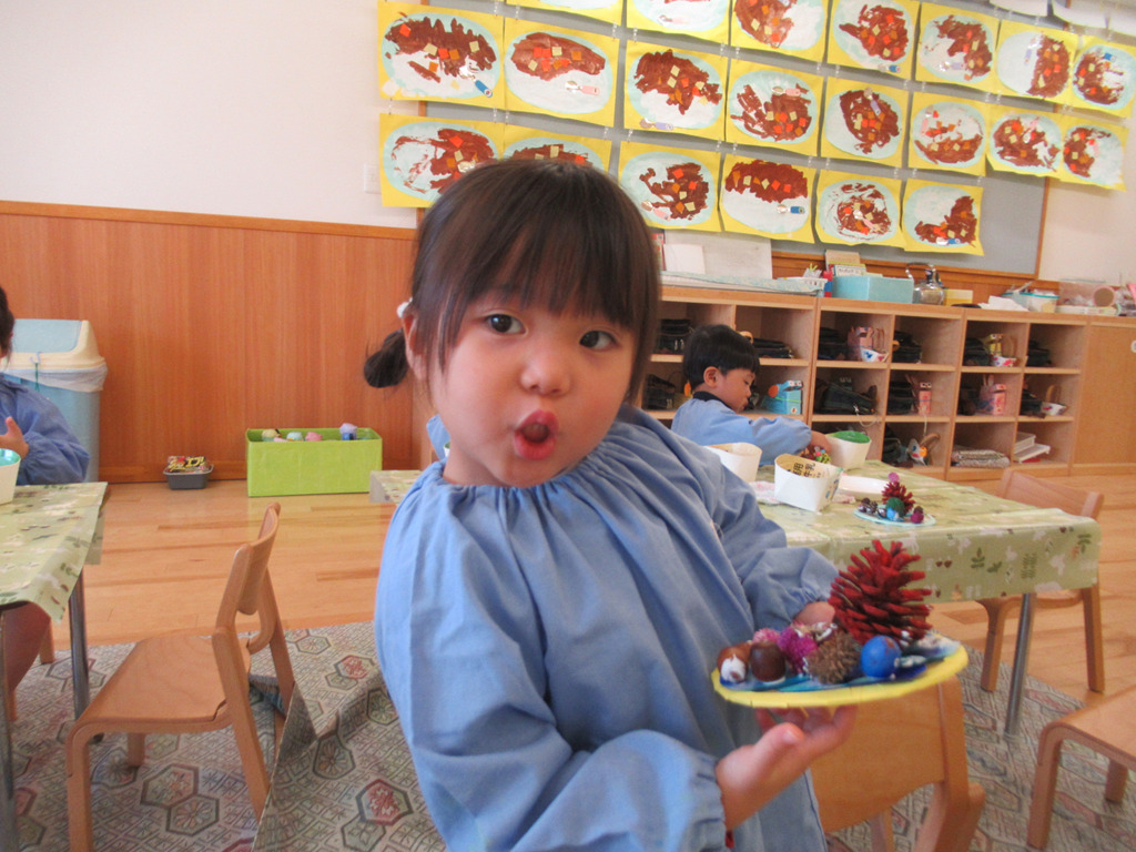 子どもたちがおうちの人とお散歩へ行ったり、お出かけをしてドングリや松ぼっくりなどの自然物を持って来てくれました。みんな興味津々です。自然物を使って遊んだり、製作をしたりして楽しみました。😊