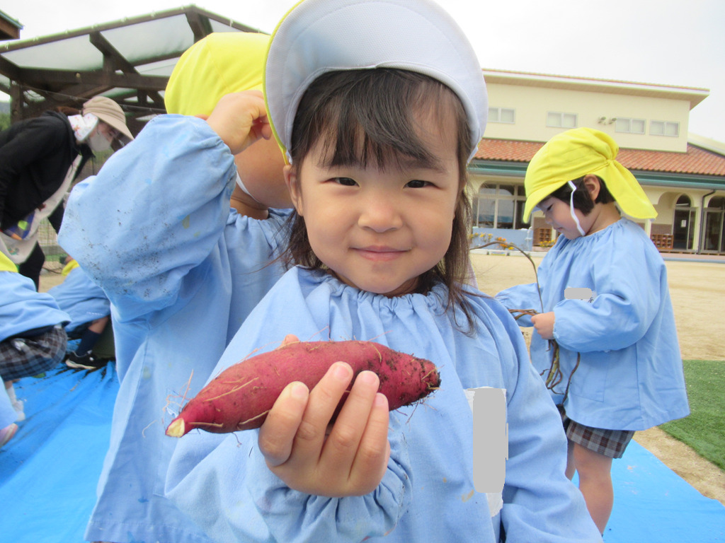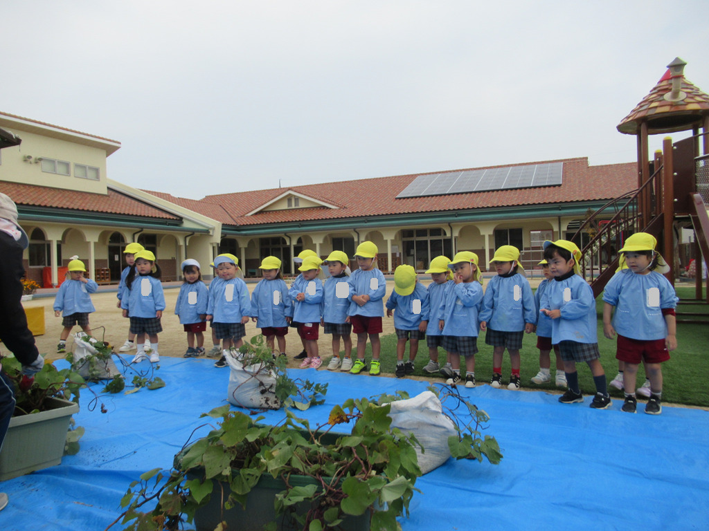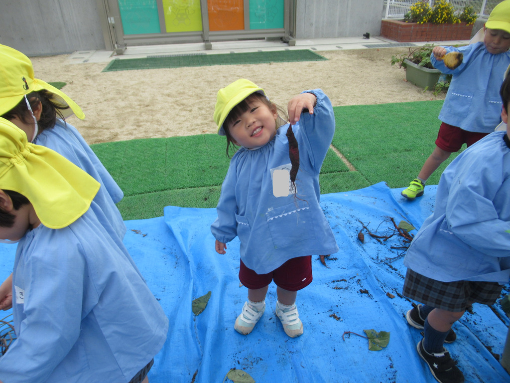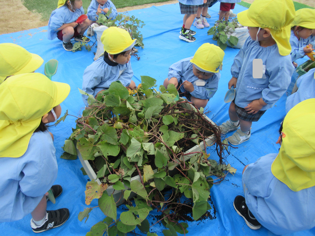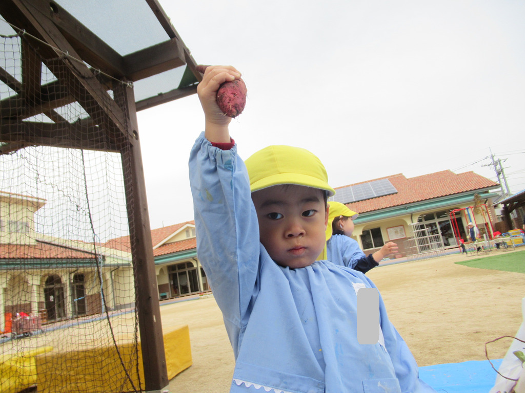 みんなが楽しみにしていたお芋ほりをしました。子どもたちは「どこにおいもがあるの?」とワクワクです。先生が抜いてみて、おいもが出てくると「うわあ~!」と大喜びです。友達や先生と力を合わせて「うんとこしょ!どっこいしょ!」と声を出して抜いている子どももいました😊子どもたちは、力を入れてつるを引っ張ってたくさんのおいもがとれると「おいも出てきたよ!」と嬉しそうでした💕