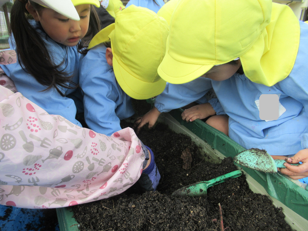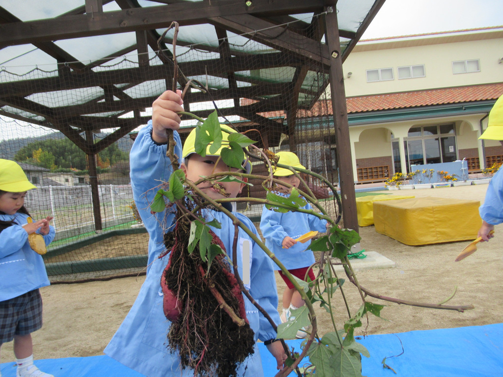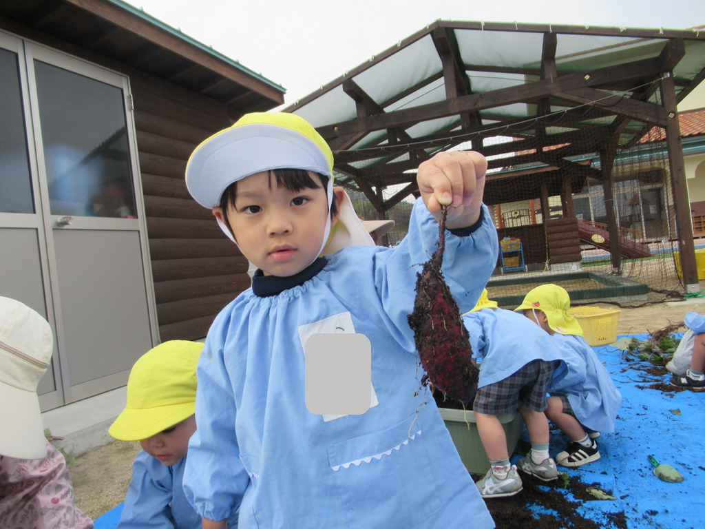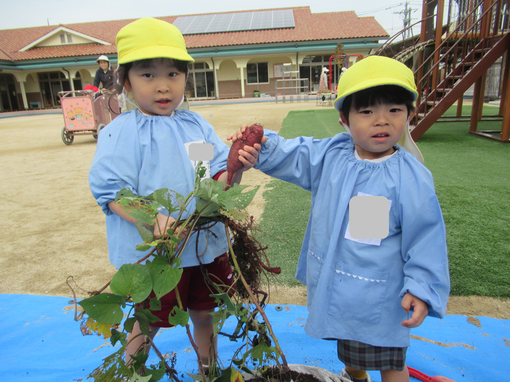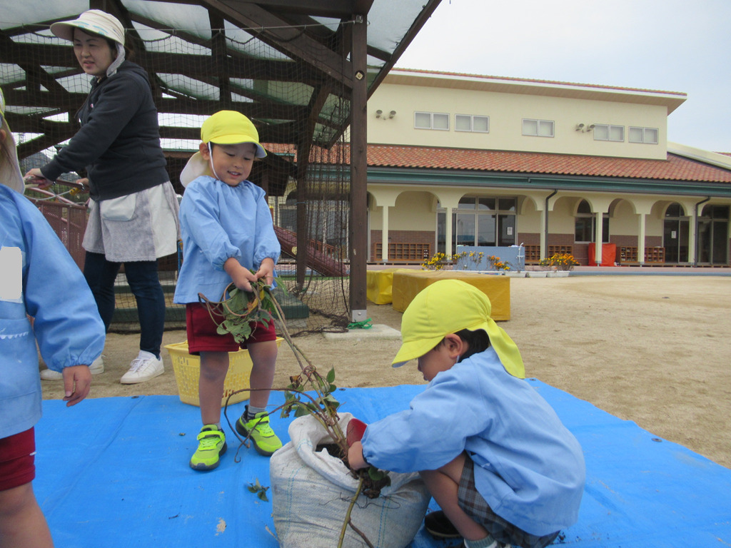 みんなが楽しみにしていたお芋ほりをしました。子どもたちは「どこにおいもがあるの?」とワクワクです。先生が抜いてみて、おいもが出てくると「うわあ~!」と大喜びです。友達や先生と力を合わせて「うんとこしょ!どっこいしょ!」と声を出して抜いている子どももいました😊子どもたちは、力を入れてつるを引っ張ってたくさんのおいもがとれると「おいも出てきたよ!」と嬉しそうでした💕
