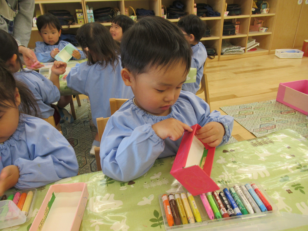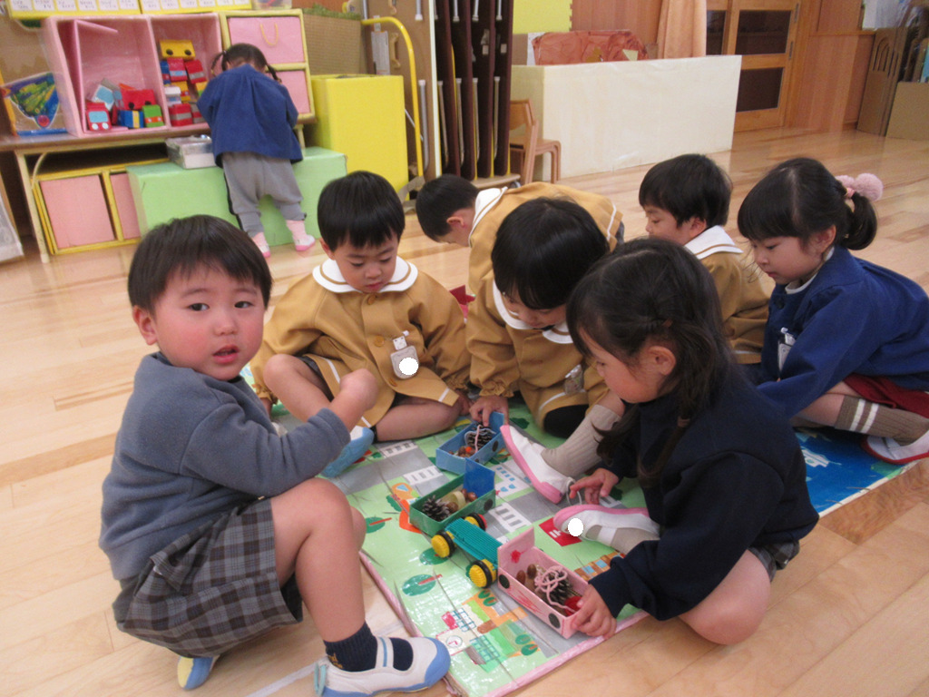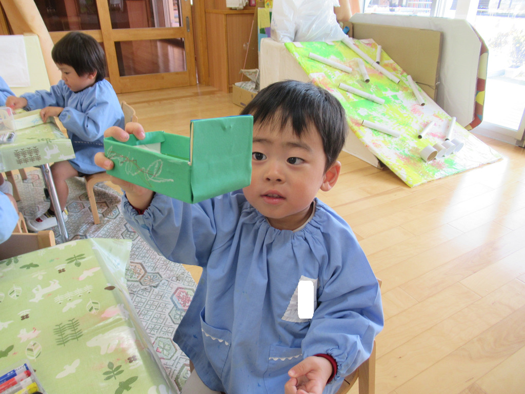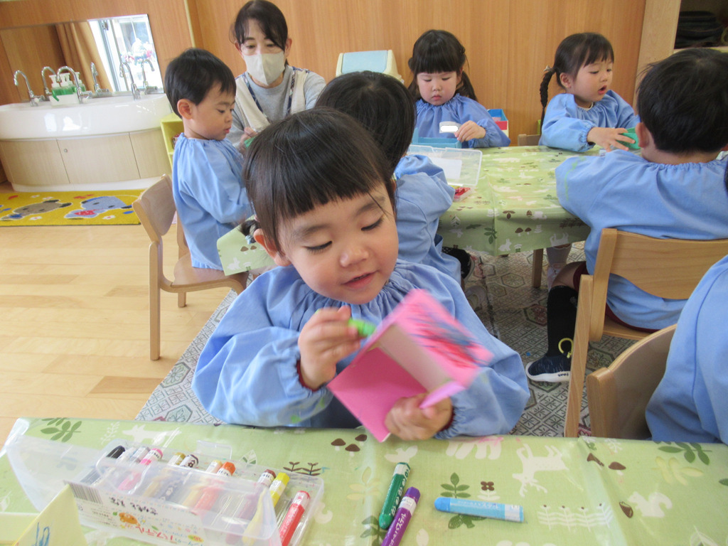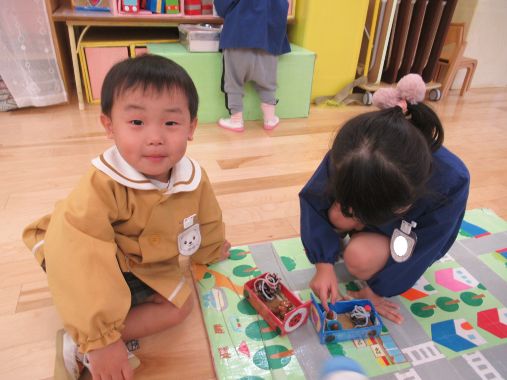 好きな色で車にお絵描きをして、どんぐり列車作りをしました。みんな乗り物が大好きです。一人一人違う列車が出来上がっていきます。