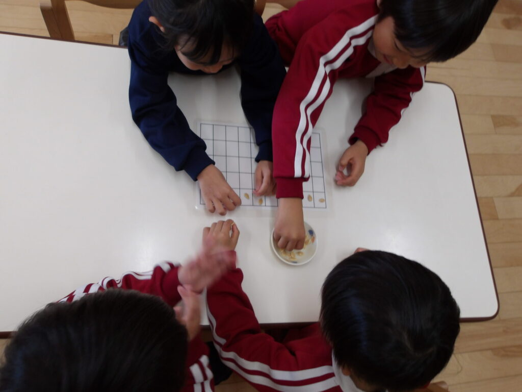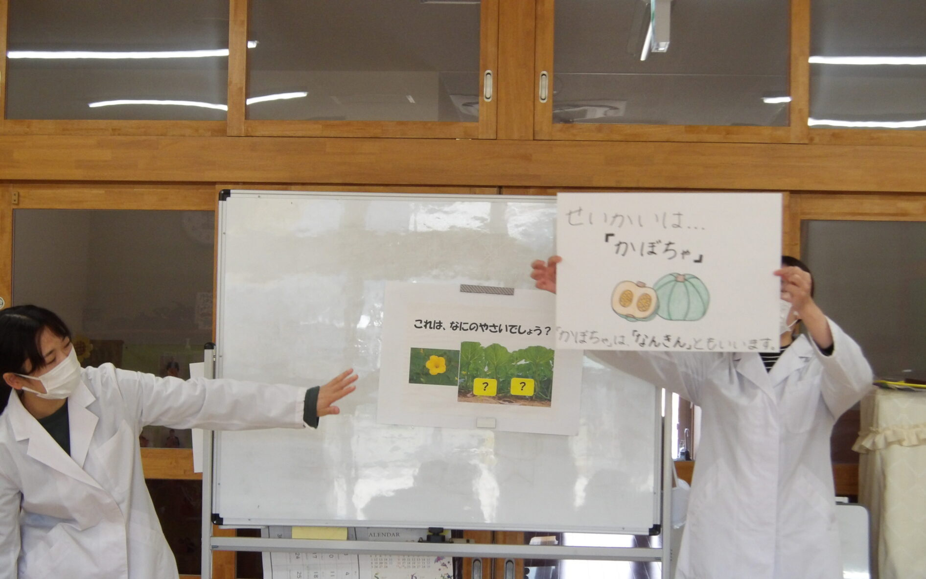 『お風呂に柚子を浮かべた、柚子風呂に入る』『最後の文字に「ん」がつく食べ物を食べる』などの言い伝えがあります。「なんきん」も最後に「ん」がついているので、冬至の日に食べると風邪をひかず、元気に過ごせると言われています。子どもたちからは「にんじん」や「ピーマン」などといった声も上がりました。また、かぼちゃの栄養についても話をしました。新しいことをまた1つ覚えることができました。