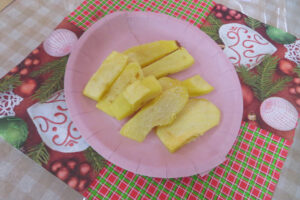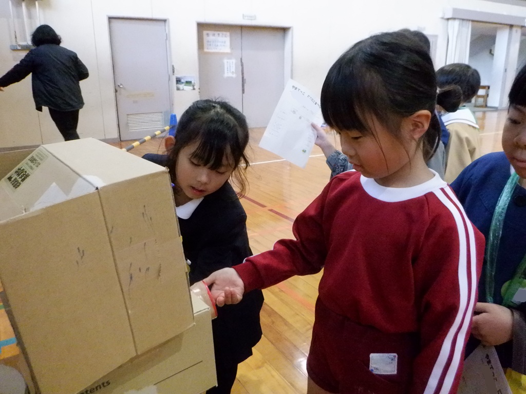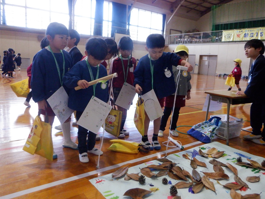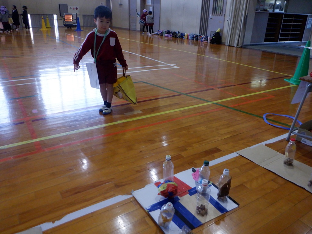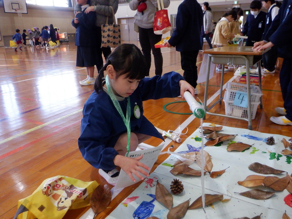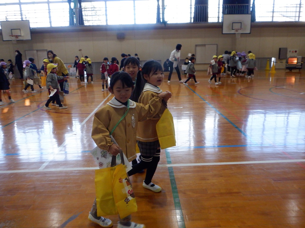 自分のカードに回ったお店のシールを貼ってもらいながら「〇箇所回ったよ。」「あとここに行ってないんだよ。」など、まだまだ遊びたい様子でしたが、1時間はあっという間に過ぎてしまいました。とても充実した時間を過ごしていたようで、こども園に帰ってからも興奮冷めやらぬ状態で、友達ともらった景品を見せ合ったり、楽しかった思いを伝え合っていました。振り返りの時間では、「葉っぱ釣りが楽しかったです。」「ボーリングで沢山倒れて嬉しかったです。」「どんぐり迷路が楽しかったです。」などそれぞれに楽しかったお店屋さんについて教えてくれました。来年はめろん組の皆が1年生になって、今のみかん組を迎えてあげるのだと思うと、感慨深いです。😊