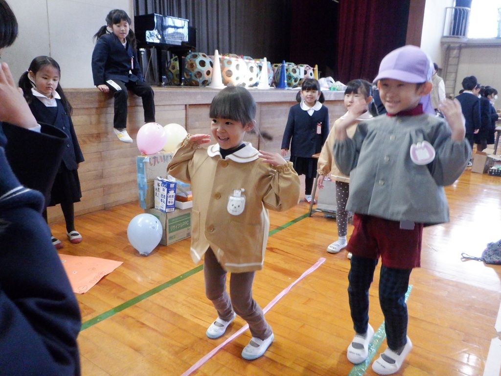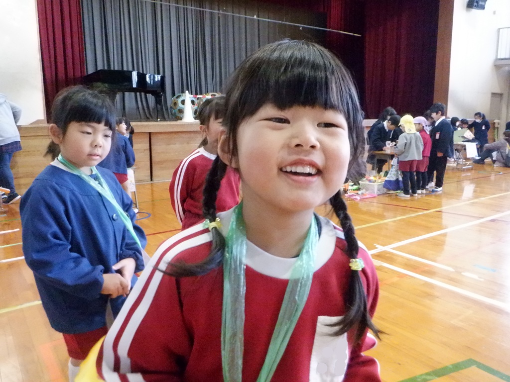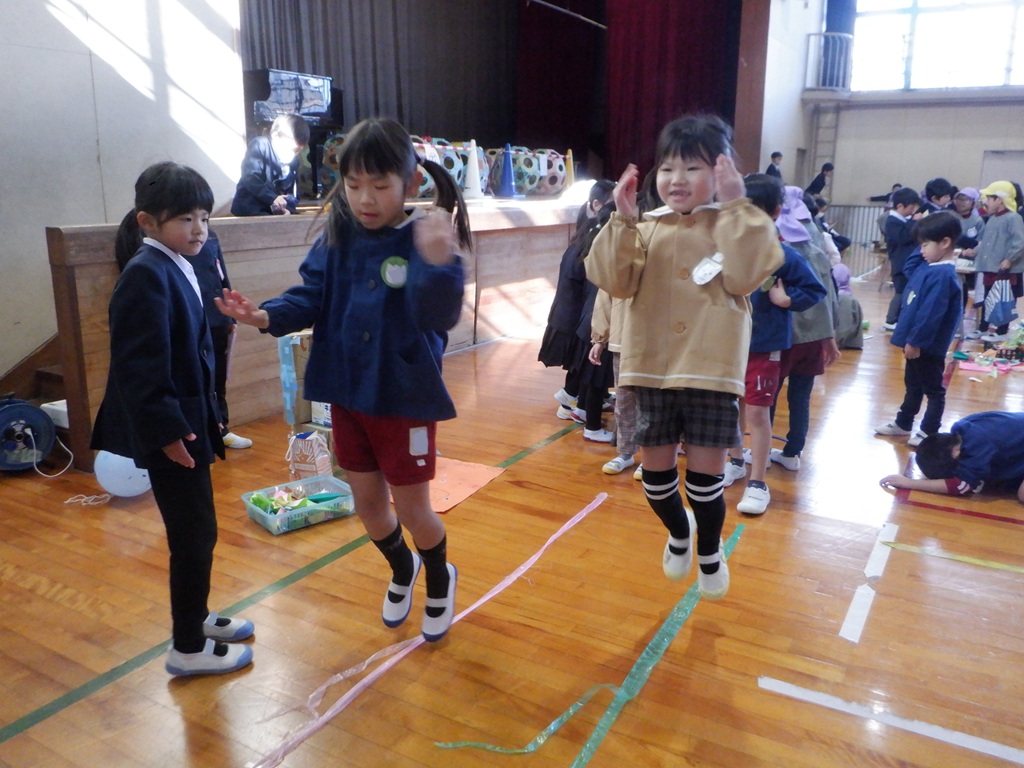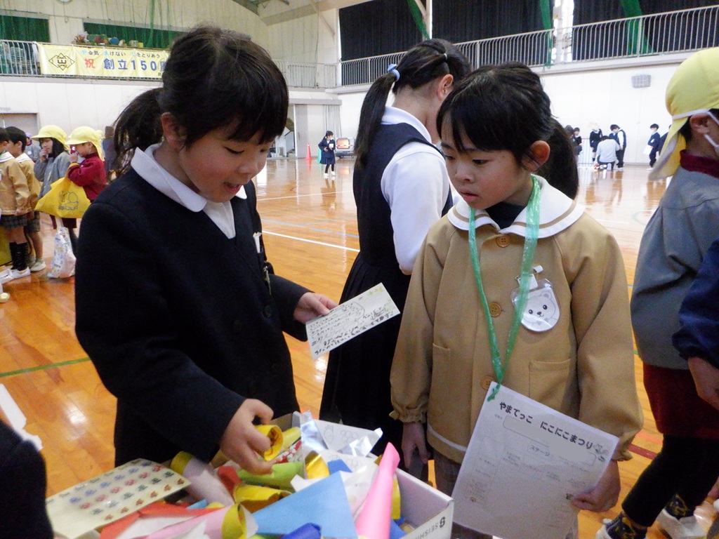 楽しみにしていた『山手っこにこにこまつり』の日がやってきました。小学1年生が14ものお店屋さんを準備してくれていました。初めの挨拶では、生活科の学習でこのお祭りの準備をしたことや、こども園、幼稚園の子どもたちにニコニコの笑顔になって欲しいこと、色々なお店に来てほしいことなどを話してくれました。1年生が教えてくれた遊び前の約束では『先頭のお友達は輪っかに並ぶこと』『自分のカードにシールを貼ってもらうこと。』『時間が来たら放送が流れるので、今いる場所に戻ってくること。』『トイレに行きたいときは近くの先生に言うこと。』『今日は体育館の中は歩く。』ことなどのお約束を聞きました。