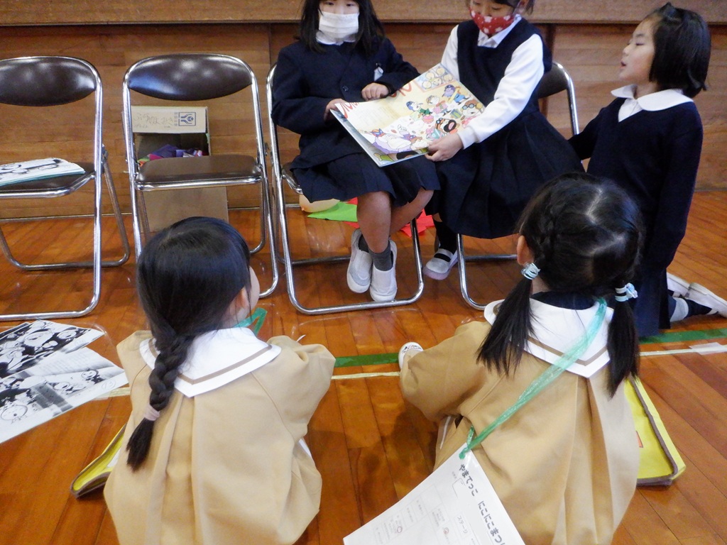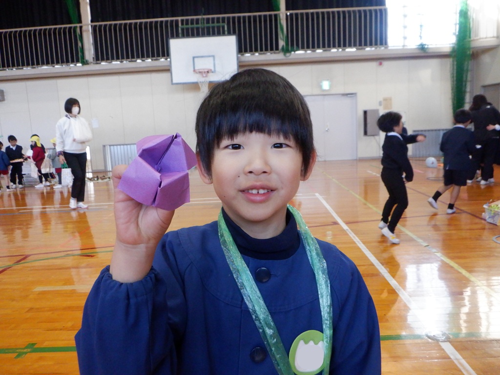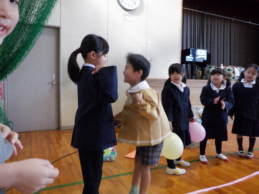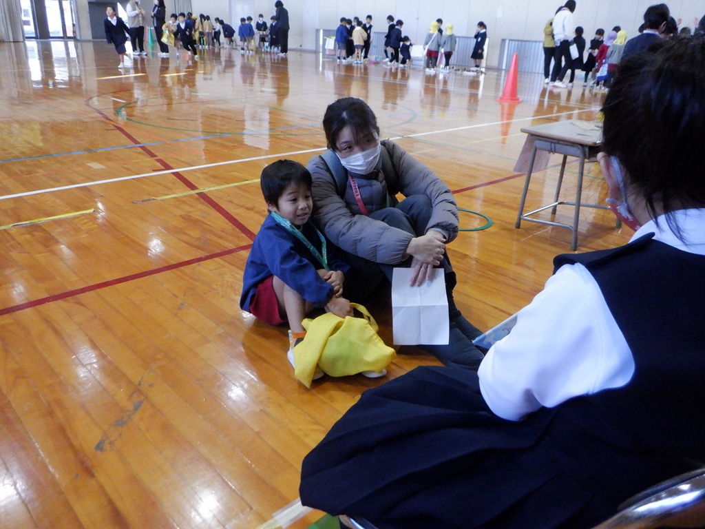 楽しみにしていた『山手っこにこにこまつり』の日がやってきました。小学1年生が14ものお店屋さんを準備してくれていました。初めの挨拶では、生活科の学習でこのお祭りの準備をしたことや、こども園、幼稚園の子どもたちにニコニコの笑顔になって欲しいこと、色々なお店に来てほしいことなどを話してくれました。1年生が教えてくれた遊び前の約束では『先頭のお友達は輪っかに並ぶこと』『自分のカードにシールを貼ってもらうこと。』『時間が来たら放送が流れるので、今いる場所に戻ってくること。』『トイレに行きたいときは近くの先生に言うこと。』『今日は体育館の中は歩く。』ことなどのお約束を聞きました。