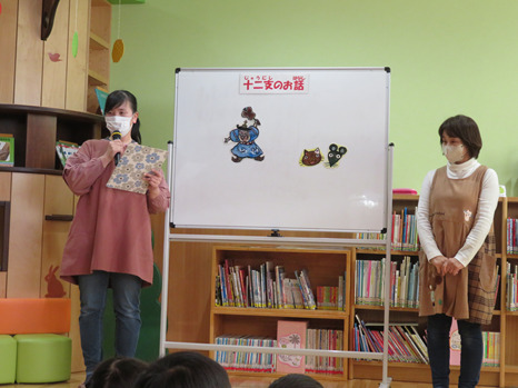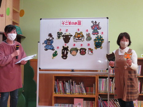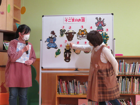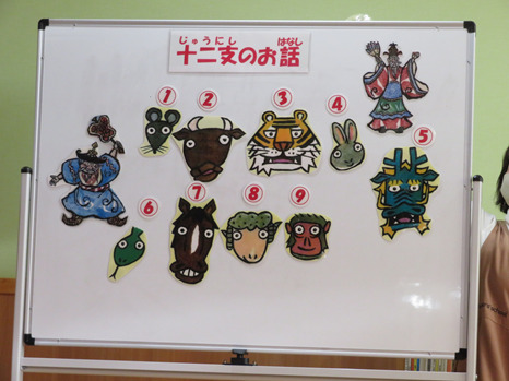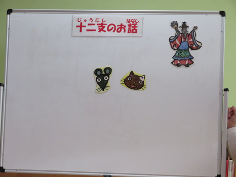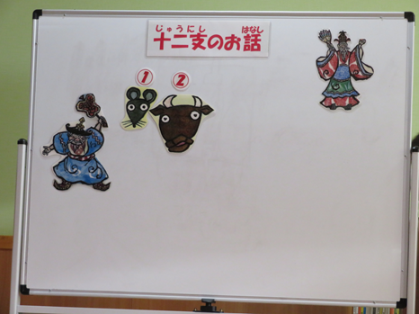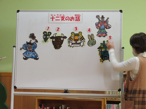 早いもので12月も終わりに近づき、年の瀬を感じます。十二支のお話を子どもにしました。「十二支は知っているかな?」と聞くと、「知っているよ。」と声も返ってきました。「ねずみでしょ、牛でしょ・・。」と指で数えながら動物の名前を言います。「みんなの知っているお話と同じかな・・・」子どもたちは、興味津々にお話を聞いてくれました。