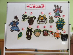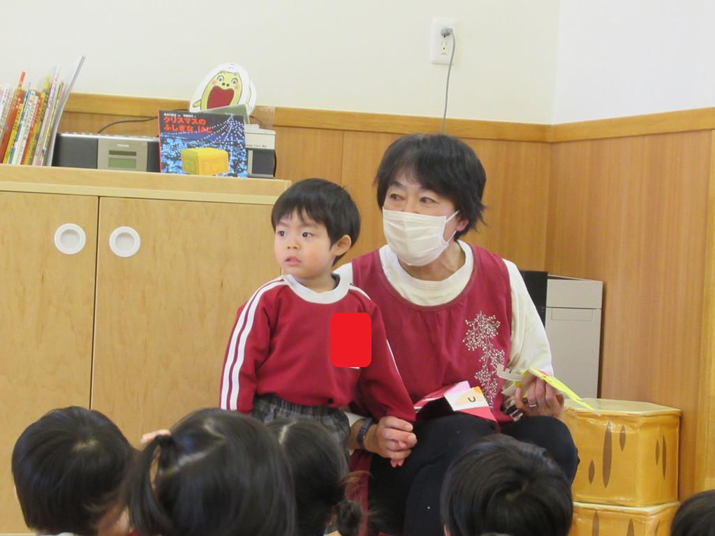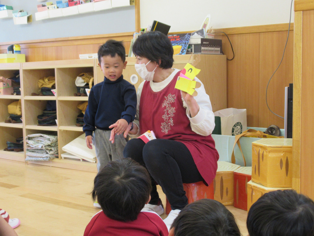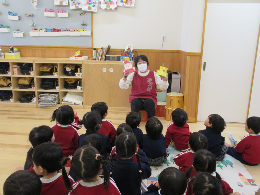 『3匹のこぶた』と『動物のお家』のスケッチブックシアターを楽しみました。オオカミが「ふぅー。」とする時はみんなで息を合わせて「ふぅー。」と吹いています。🐺