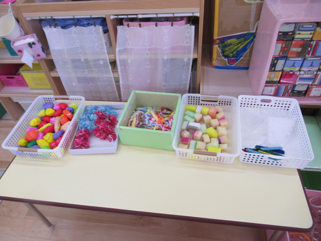 子どもたちが丸めて作った新聞紙に折り紙で巻いた物、スポンジ、毛糸、カラー棒など身近にある素材を使って遊びました。何に変身するのか楽しみです。✨