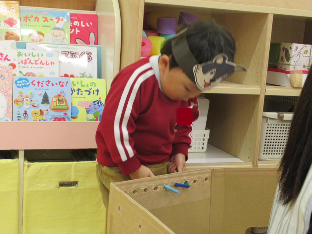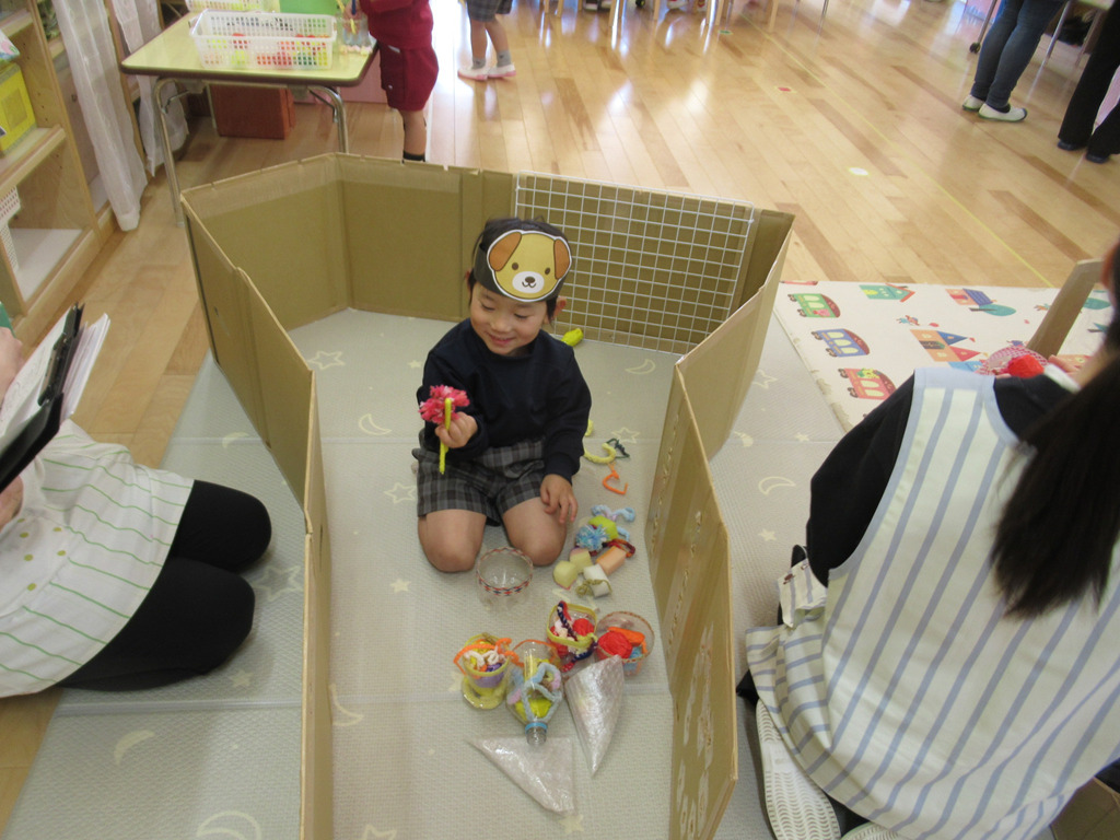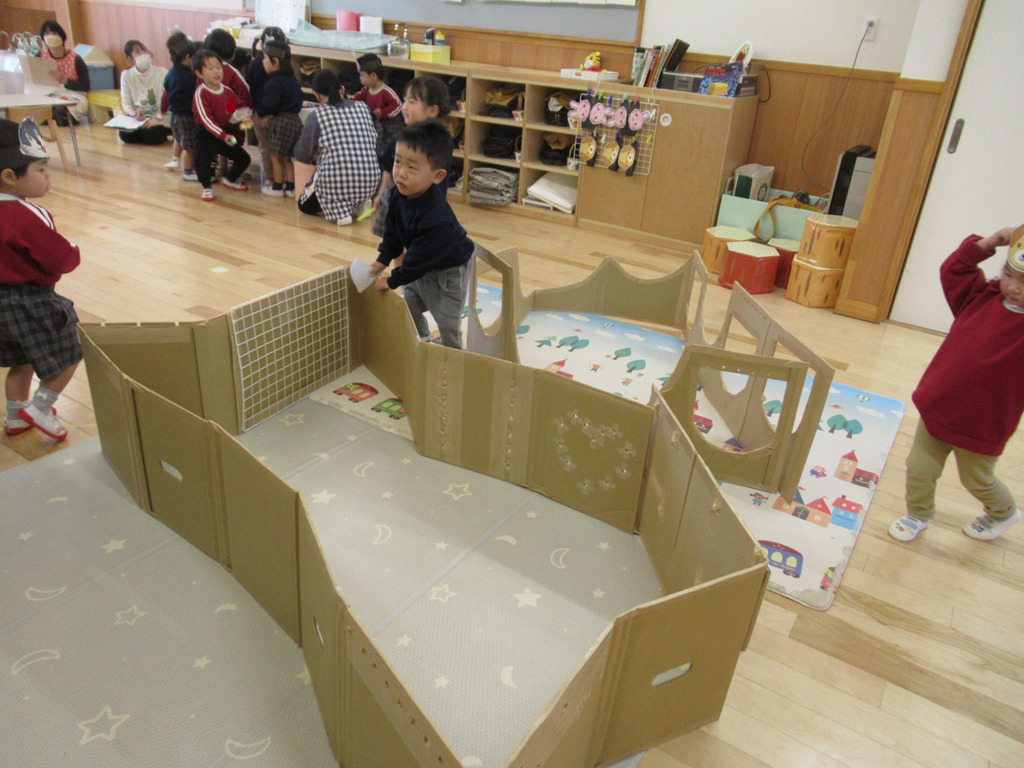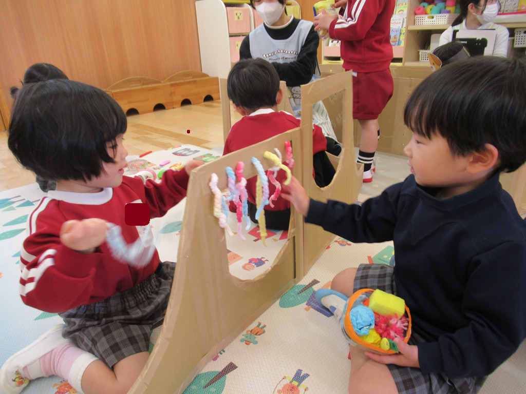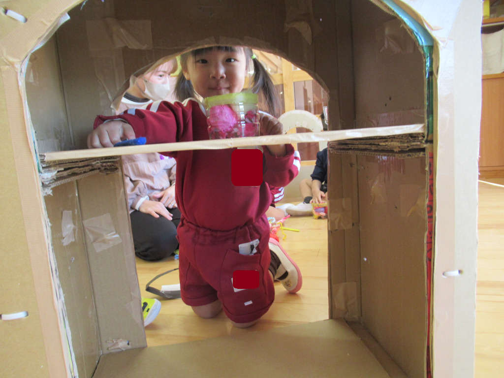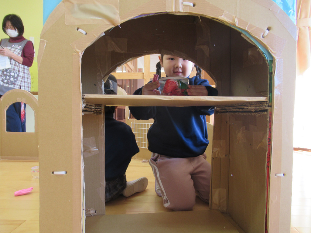 いろいろな素材を使って、ごっこ遊びを楽しみました。段ボールの長いものを立ててお家に見立てると、その中に入って友達や先生とごっこ遊びが始まります。一人一人の子どもたちが見つけた遊びにはストーリーがあり、発見と驚きがたくさんの遊びとなりました。😊