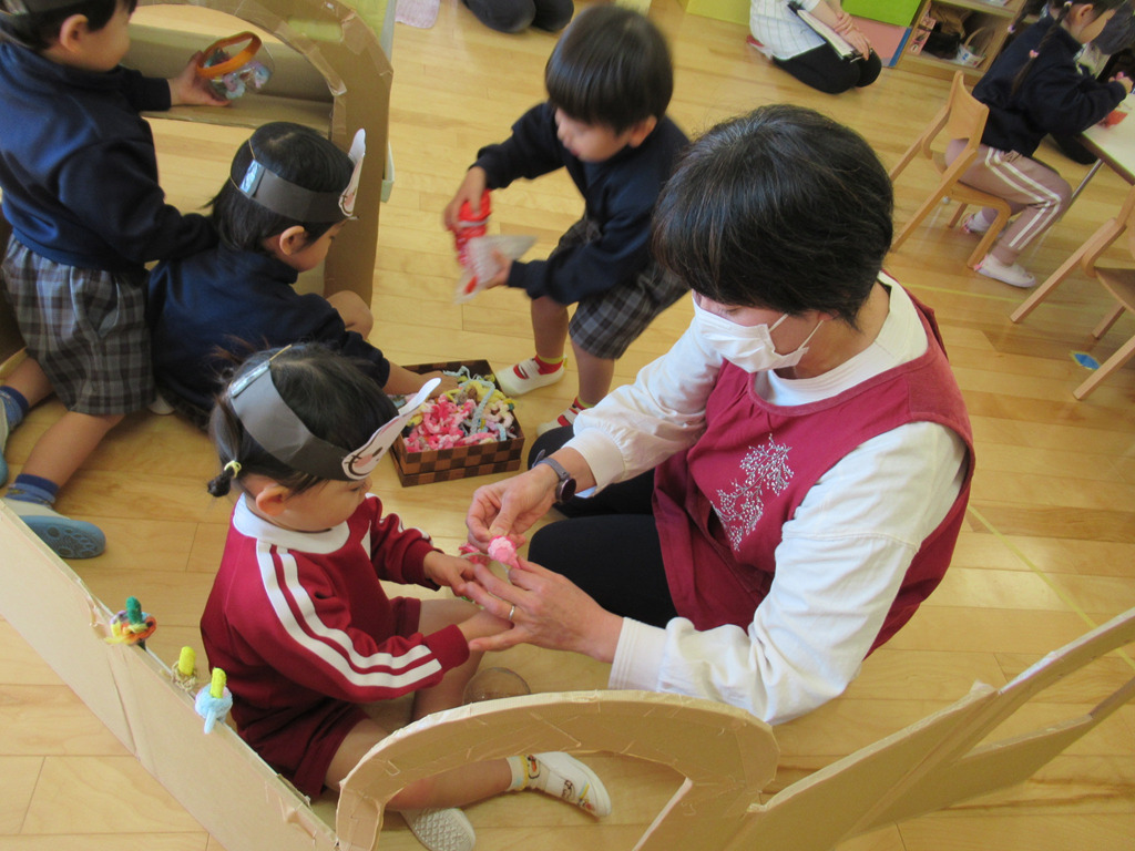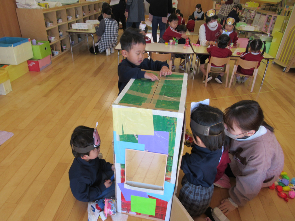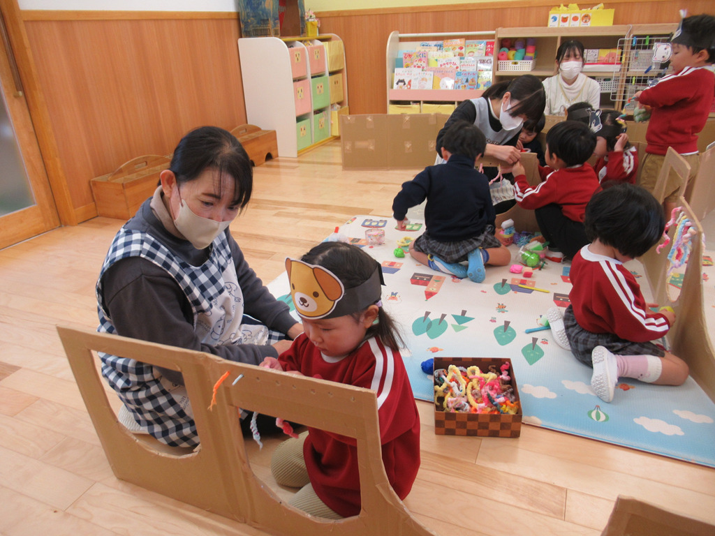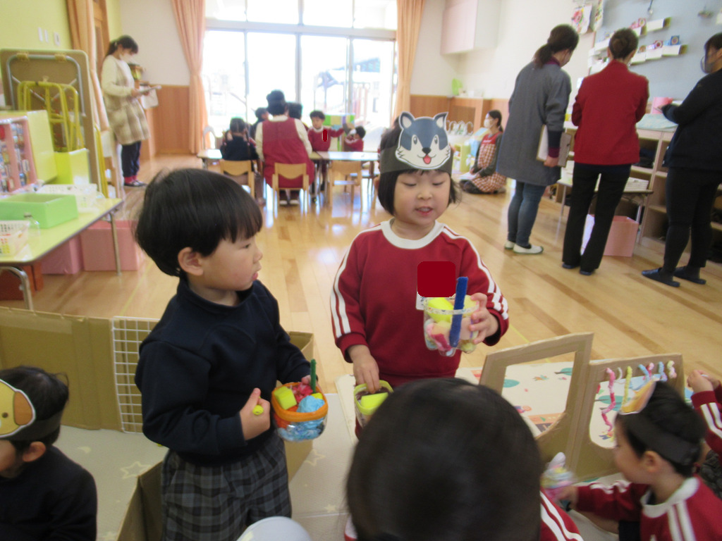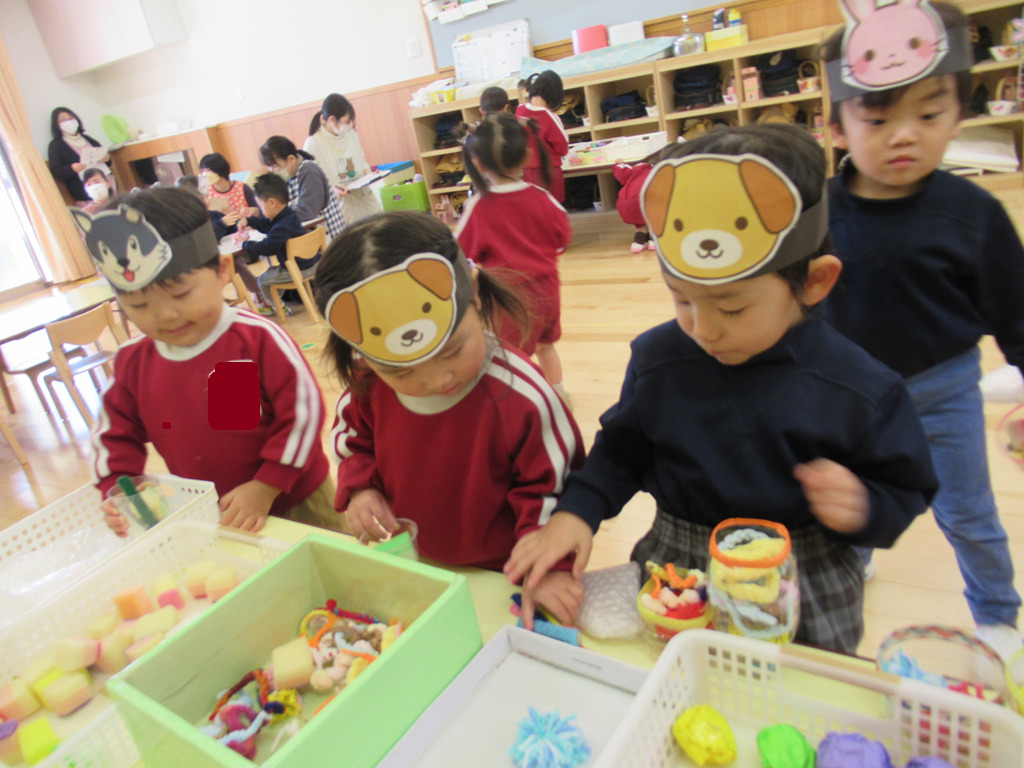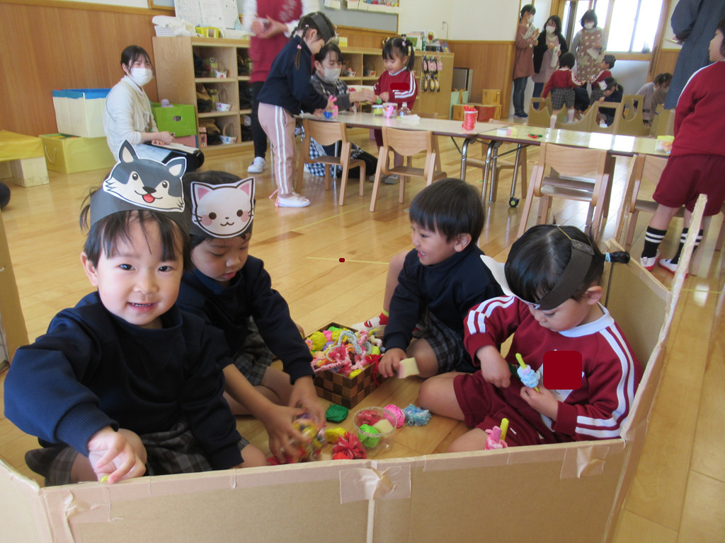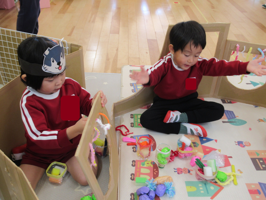お家作りをしたり、いろいろな素材を使ったりして遊びが始まりました。好きな動物のお面を被ってごっこ遊びの始まりです。💛