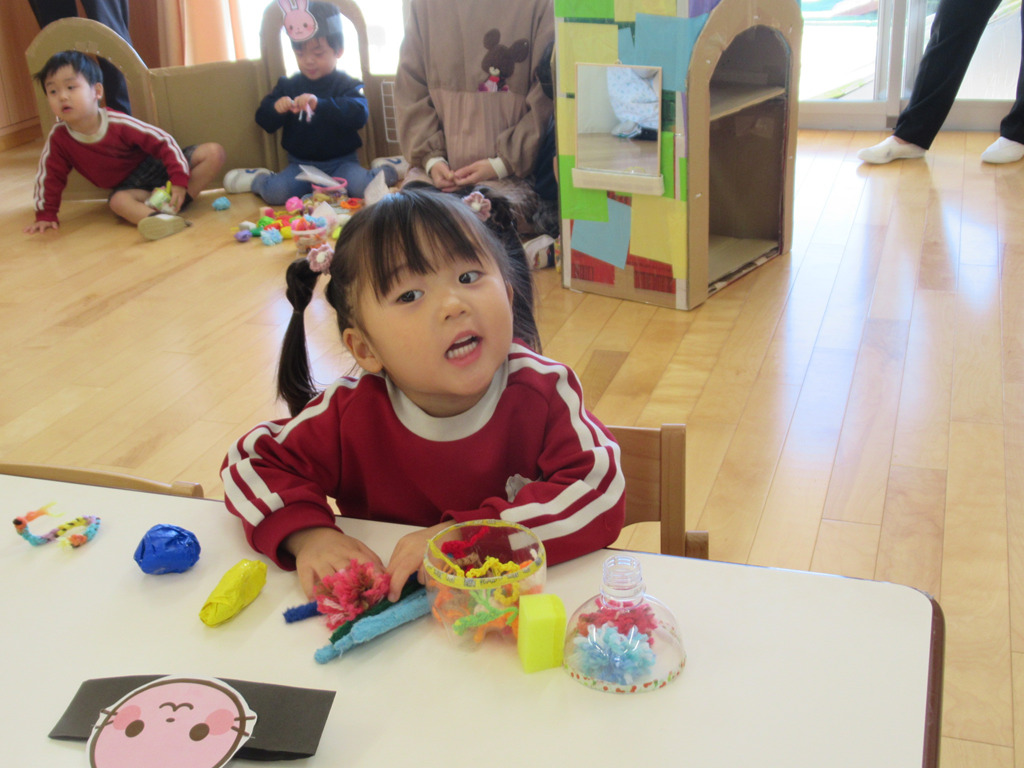 みんな真剣に小さな穴に毛糸を通しています。そして「いらっしゃい。」と両手を広げて友達を呼んでいます。