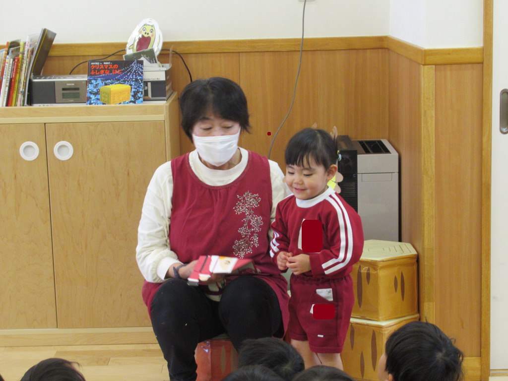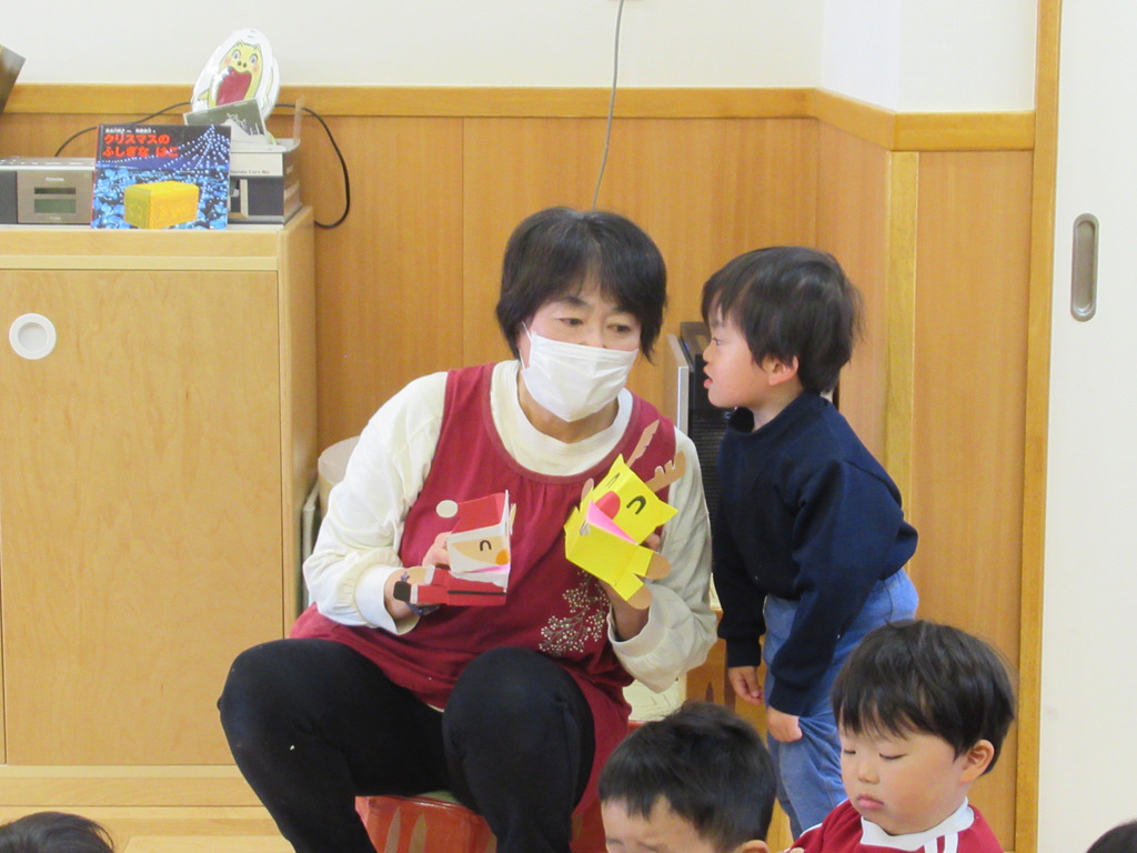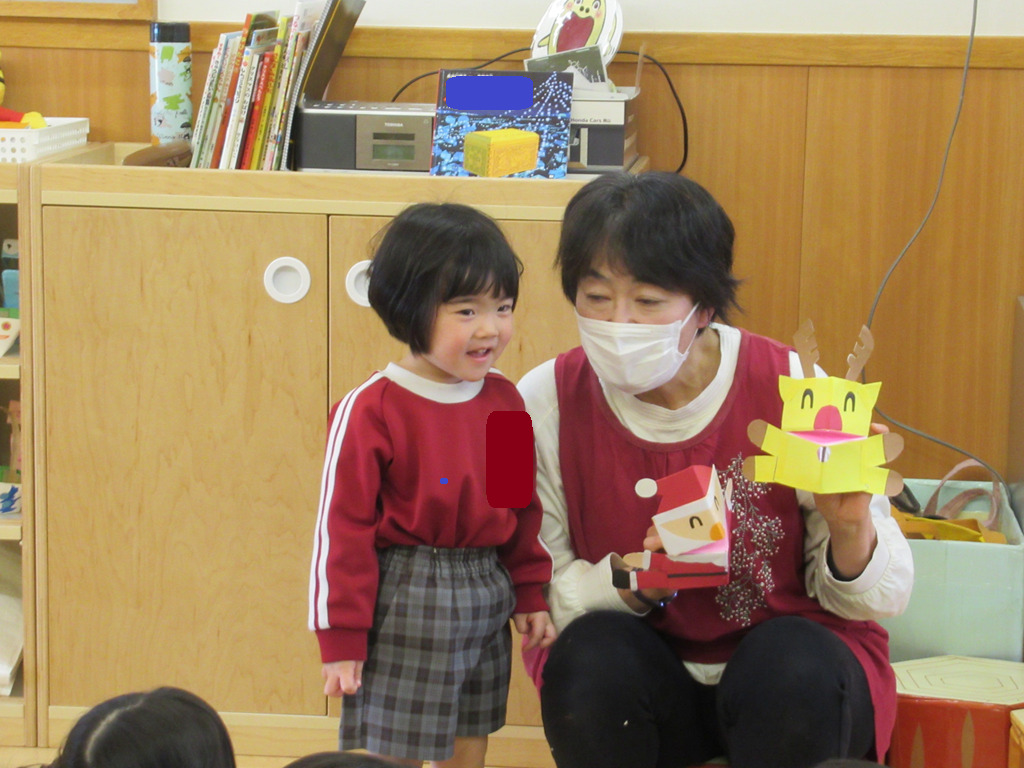 サンタさんとトナカイさんが来ましたよ。みんなお片付けを早くして集まることができました。