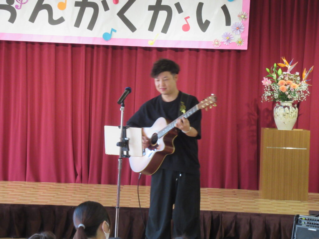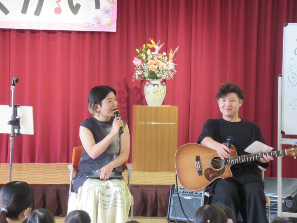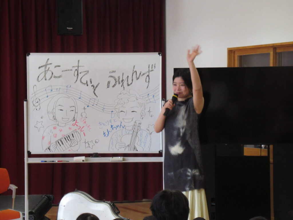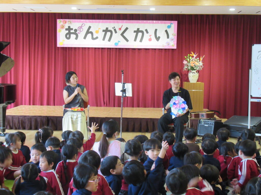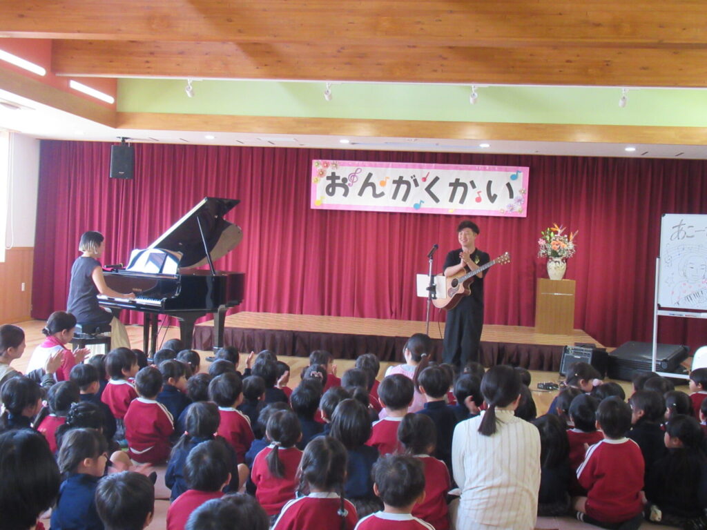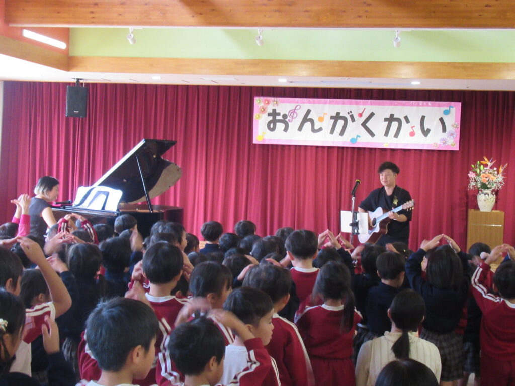 他にも、”ミッキーマウスマーチ” ”さんぽ”とたくさん演奏してくださいました。音楽の楽しさを味わえた1時間でした。子どもたちからの質問で、「なんの歌が好きですか?」よっしーは「子どものころ、アンパンマンの歌がすきでした。」と教えていただきましたもんちゃんは、「はたらくくるまのうたがすきです。」と話してくださいました。
