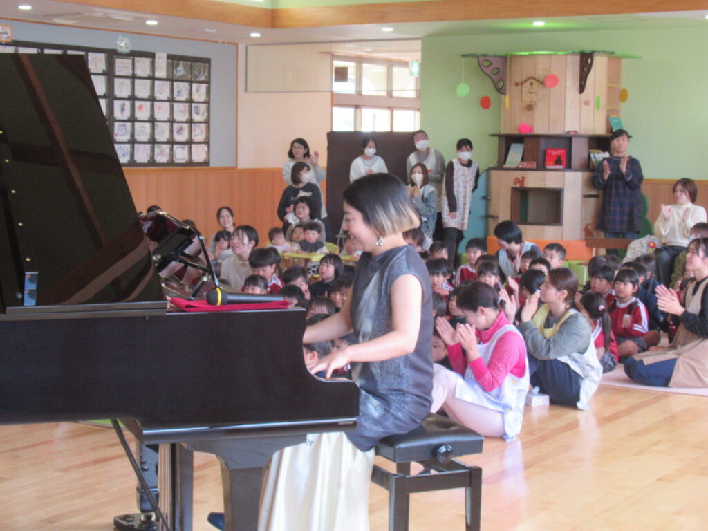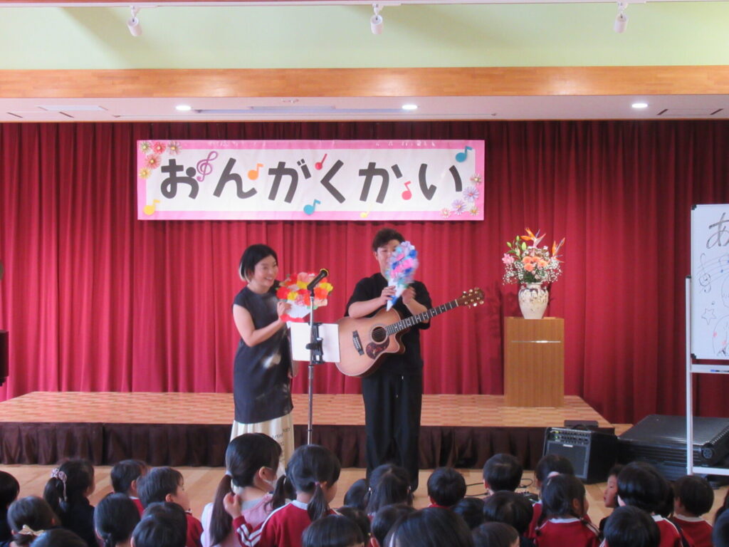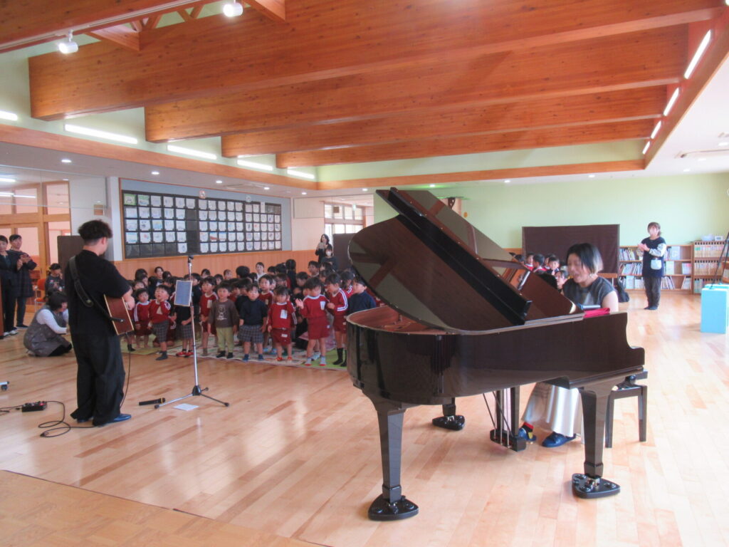 子どもたちの大好きな曲「となりのトトロ」を演奏してくださいました。思わず、子どもたちも「となりのトトロ、トトロ~」と口ずさみます。ヨッシーのピアノ、もんちゃんのギターで素敵な音楽でみんな虜になりました。