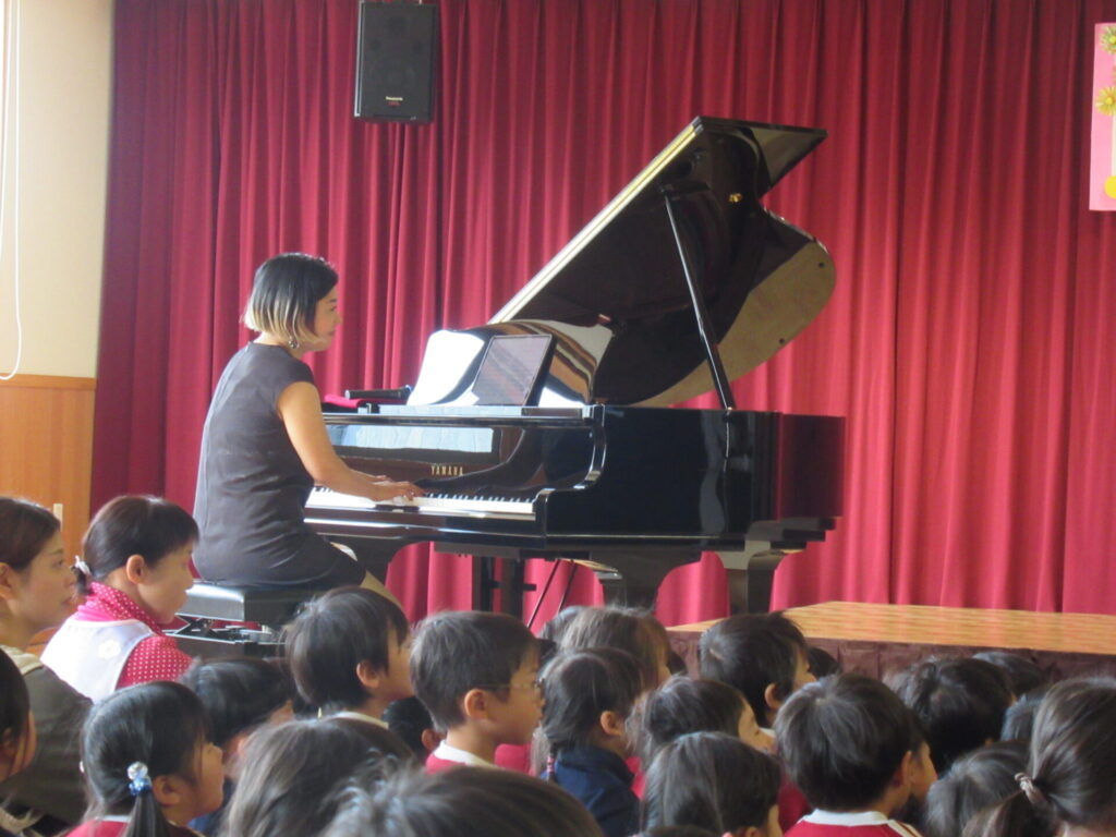 子どもたちの知っている歌もたくさん演奏していただきました。”大きな栗の木の下で”はいろいろなバージョンを楽しみました。ポップな音楽では、思わず「イエーイ!」と声が上がるほど。ところが、しんみりした”大きな栗の木の下で”では、ほんとに顔をしかめて、悲しそうに歌ったり・・・・。ピアノやギターに合わせて一緒に歌う楽しさを味わいました。