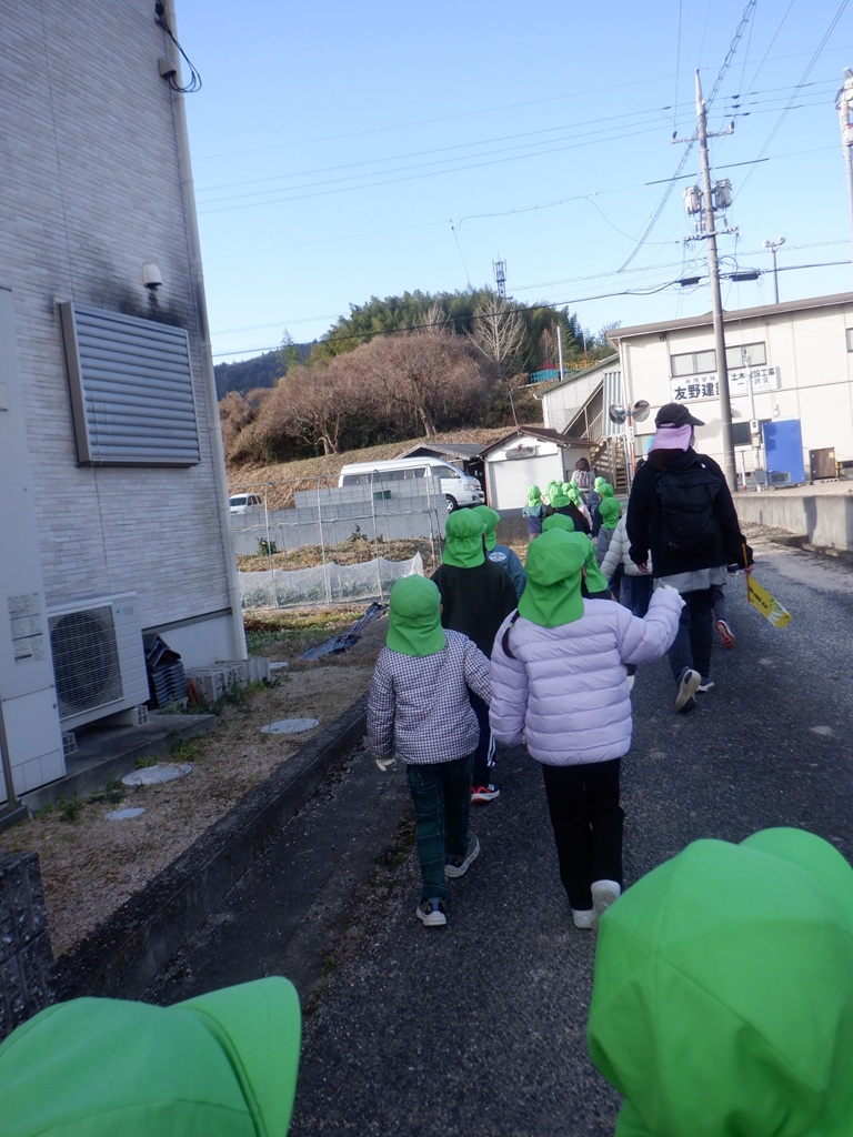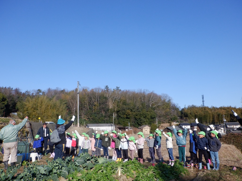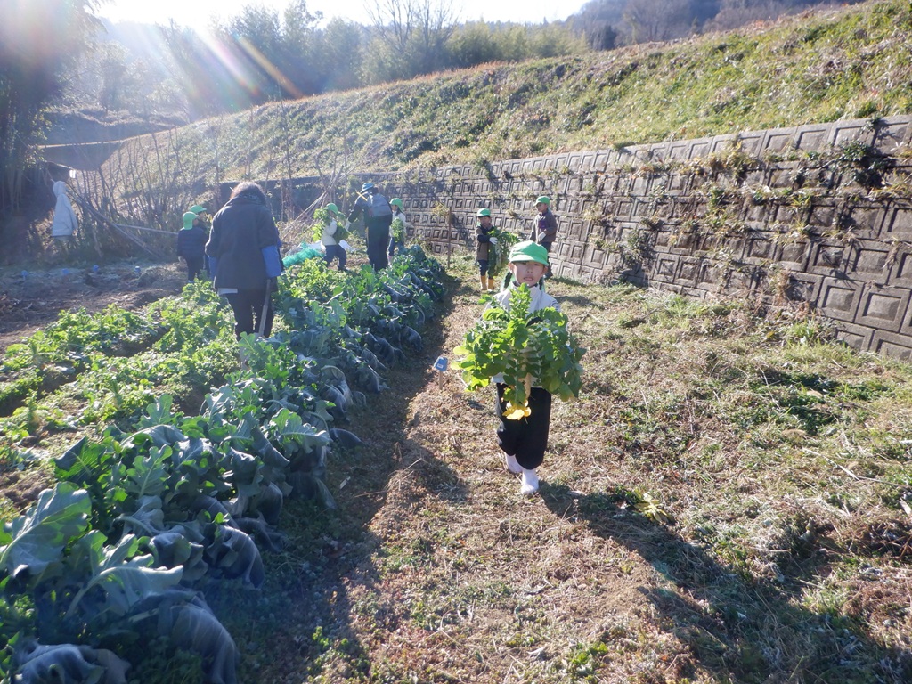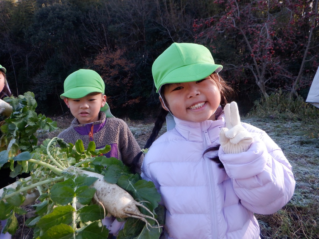 楽しかった大根掘りから帰る時にも交通安全に気を付けながら帰りました。みんなが持ち帰った大根はどんな料理に変身するのかな?こども園の給食にも使わせていただいて、こども園の子どもたちみんなで旬の大根を味わいたいと思います。友野さん今年も立派な大根をありがとうございました。