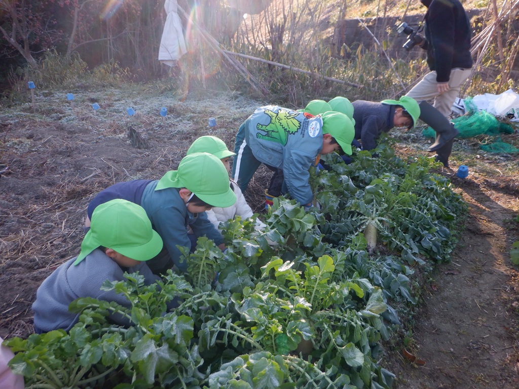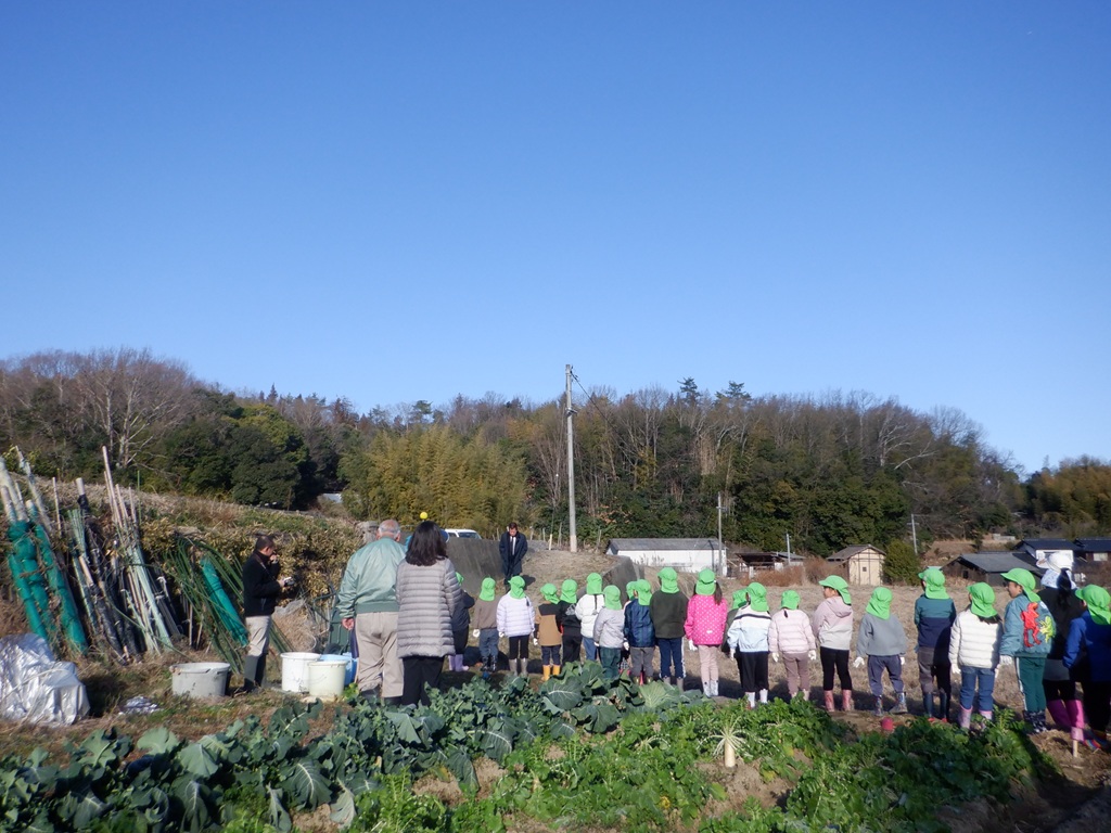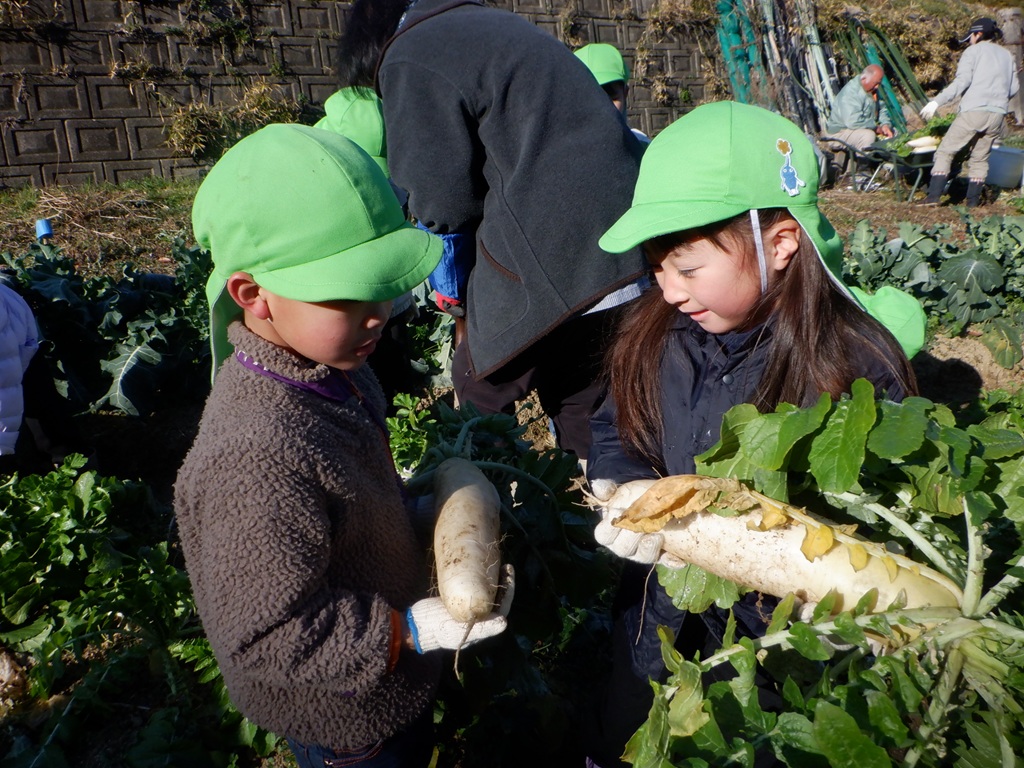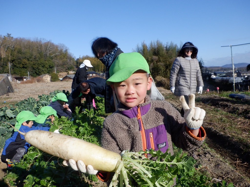 地域の友野さんにご招待いただき、今年も大根掘りに行ってきました。友達と手をつなぎ、畑までの道のりを景色を楽しみながら歩きました。畑に到着すると友野さんが待っていてれました。友野さんのお話で、大根は種から育てたこと、その種は10月に植えたことなどを聞き、「10月は運動会のころだね。」と自分たちの生活に重ねていました。