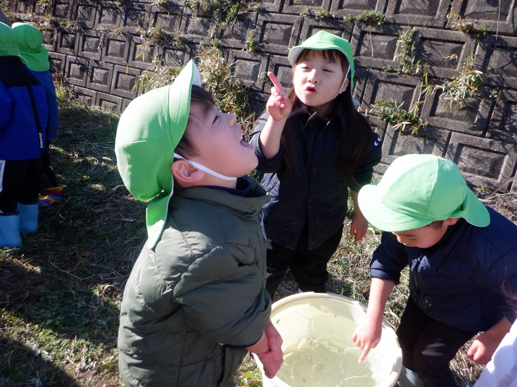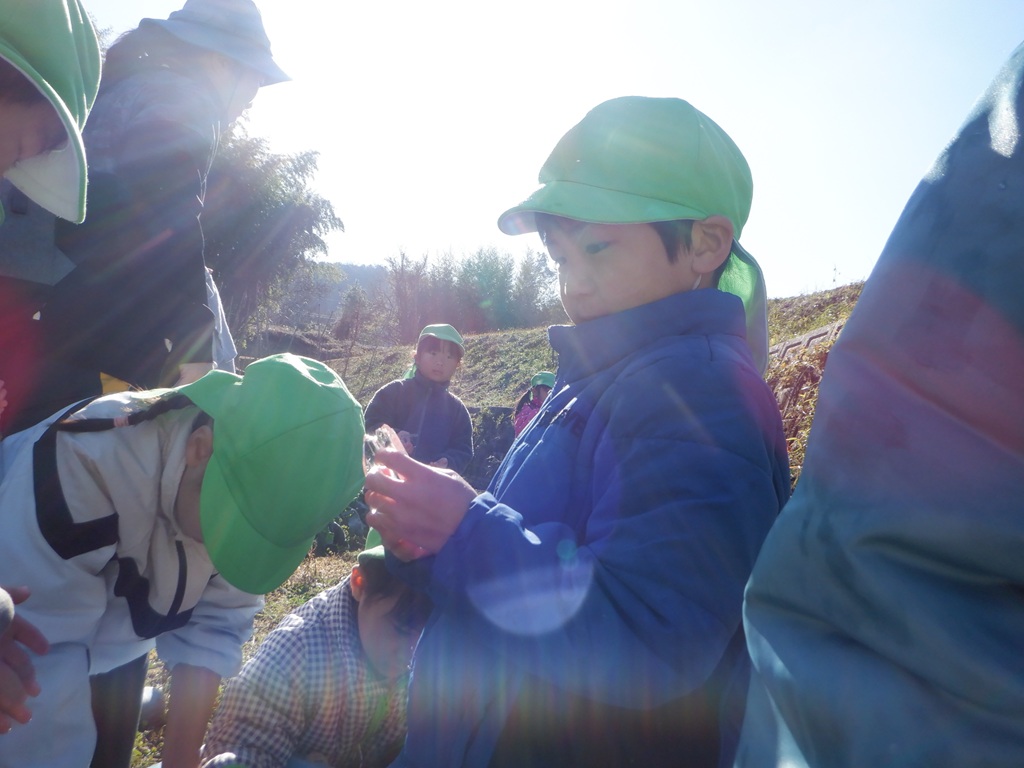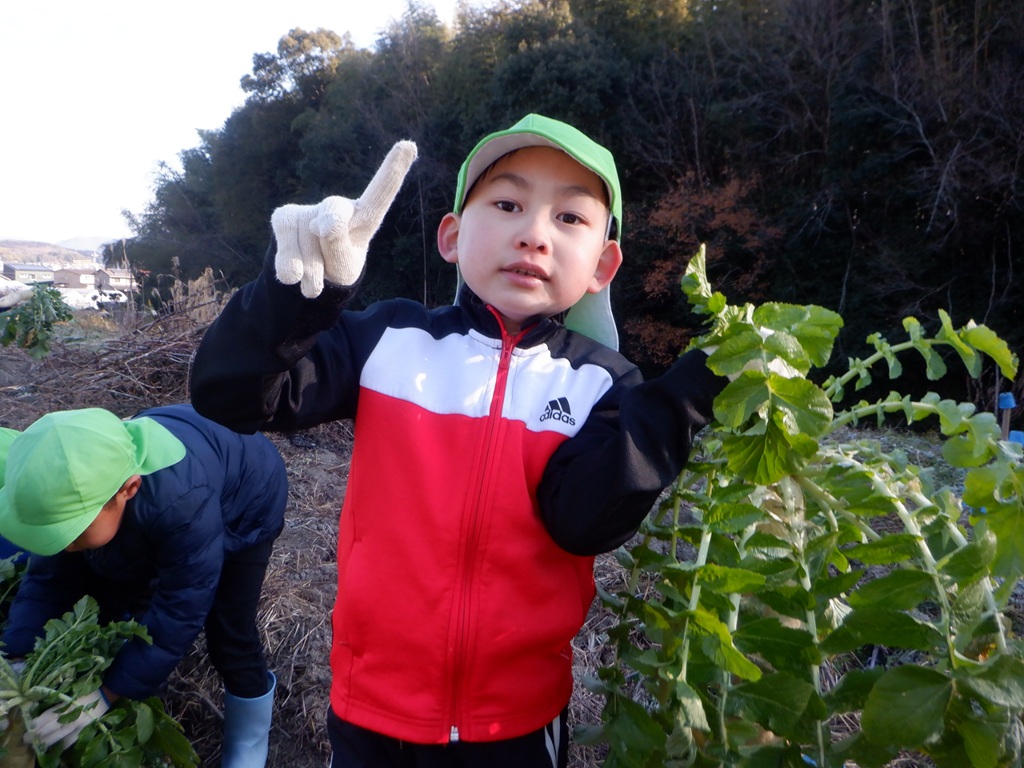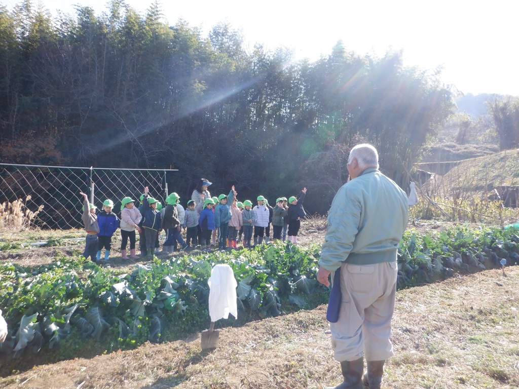 地域の友野さんにご招待いただき、今年も大根掘りに行ってきました。友達と手をつなぎ、畑までの道のりを景色を楽しみながら歩きました。畑に到着すると友野さんが待っていてれました。友野さんのお話で、大根は種から育てたこと、その種は10月に植えたことなどを聞き、「10月は運動会のころだね。」と自分たちの生活に重ねていました。