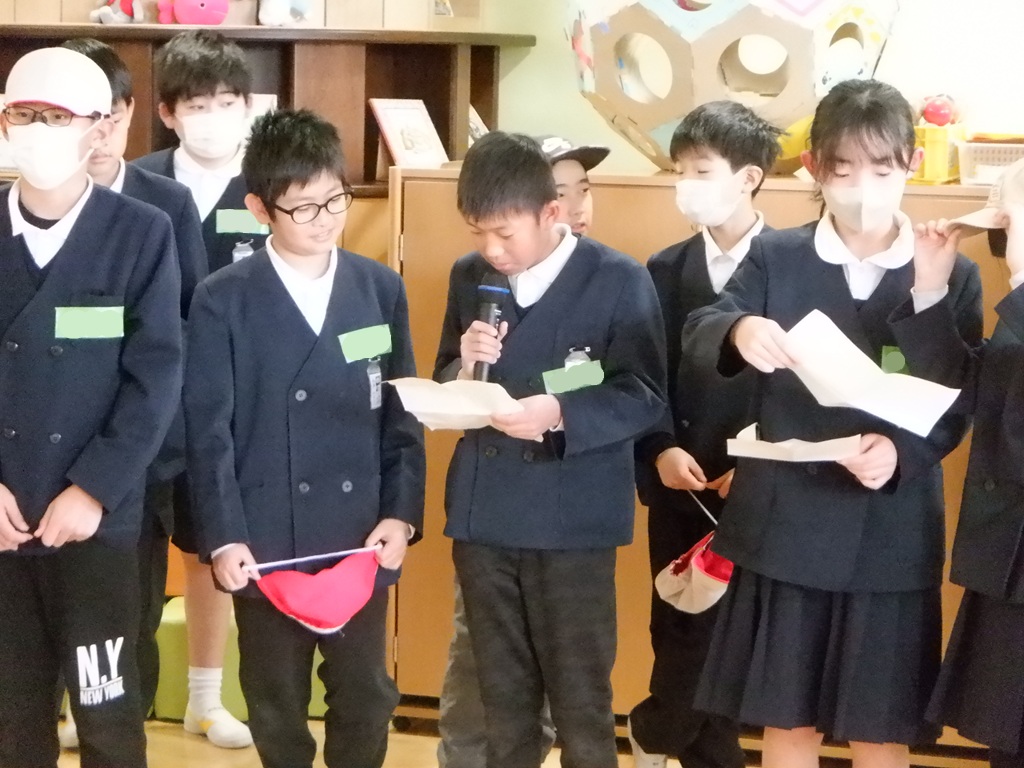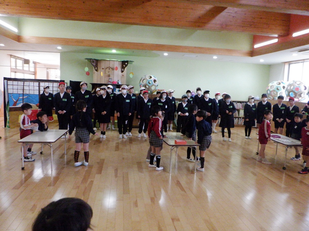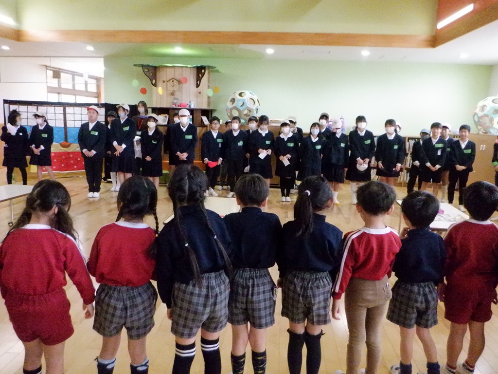楽しい時間はあっという間に過ぎ、5年生達が小学校へ帰る時間になってしまいました。とても楽しい時間を過ごせたようで、めろん組の子どもたちからは「もっと遊びたかった!」という声が聞こえてきました。みんなでお礼を伝えた後は、別れを惜しんでテラスまで出てお見送りをしました。5年A組の皆さん、ありがとうございました。また小学校で会える日を楽しみにしていますね。