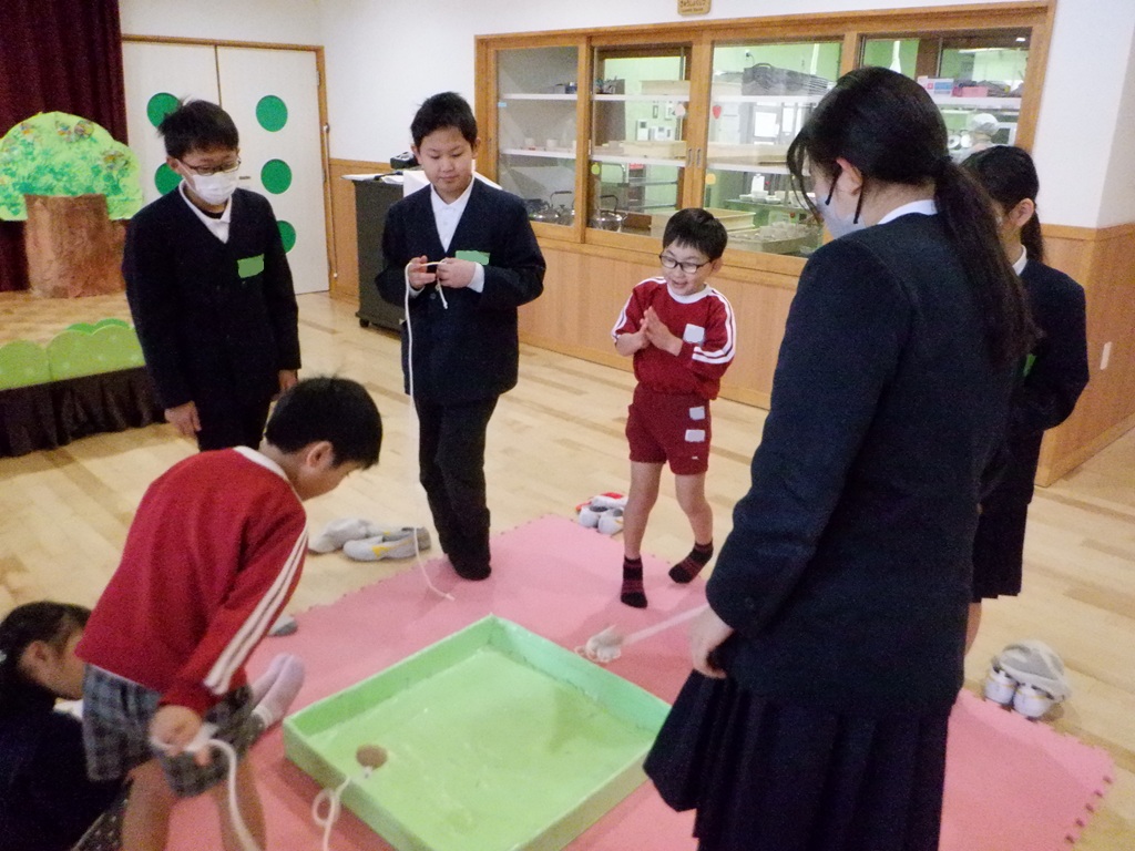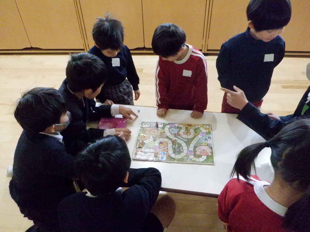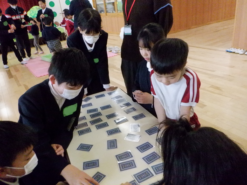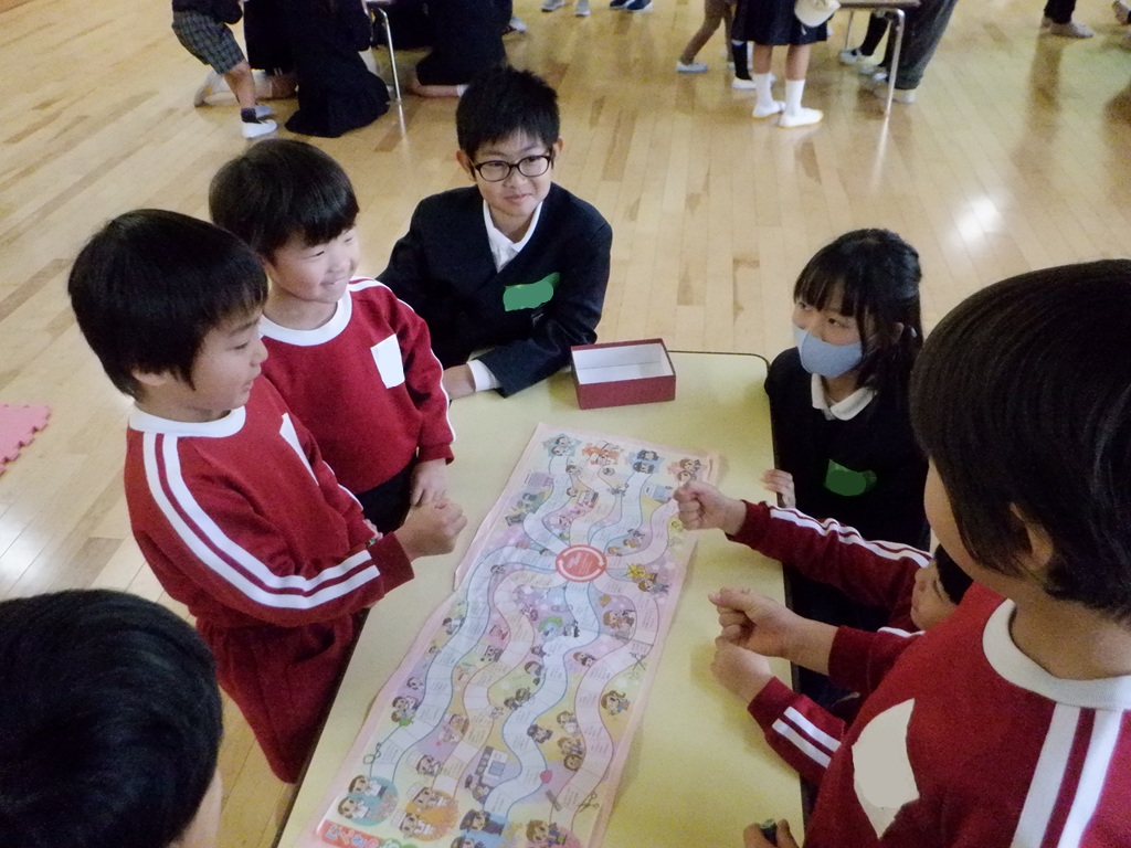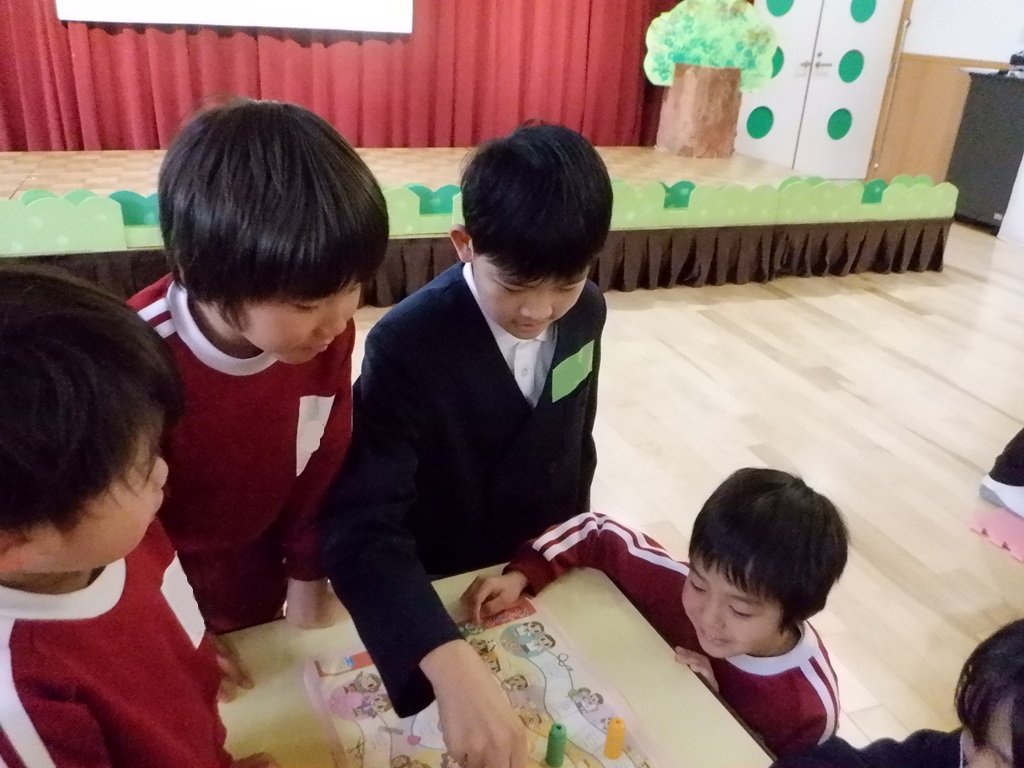 お兄さん・お姉さんとペアになってすごろくをしました。初めは緊張した様子の子どもたちでしたが、お兄さんお姉さんが優しく声を掛けたりすごろくの文字を呼んでくれたりしたので、あっという間に仲良くなって楽しく遊ぶことができました。