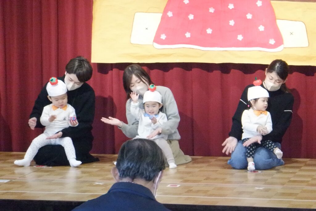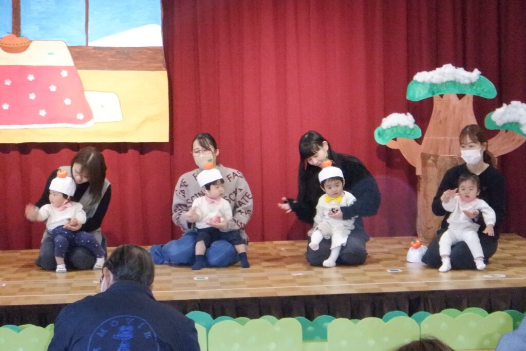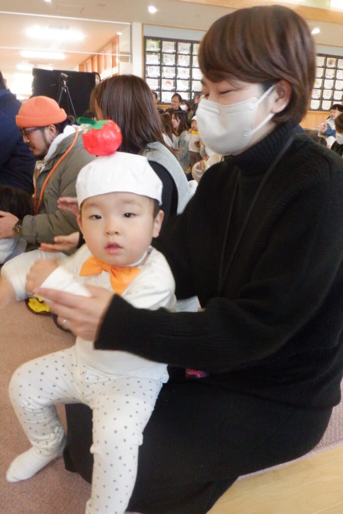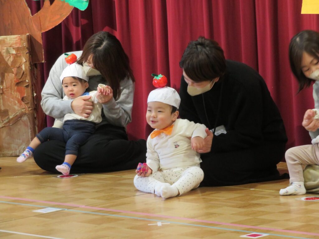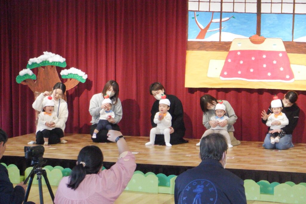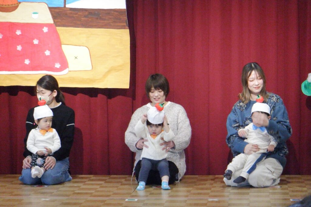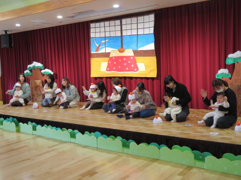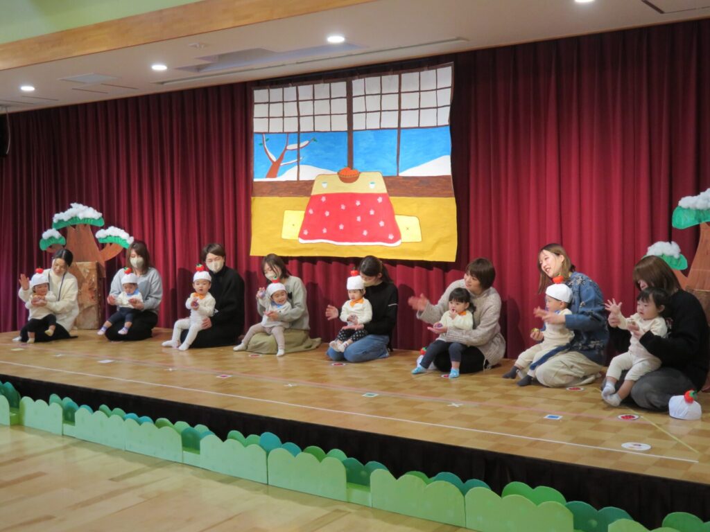 1月22日に生活発表会がありました。いちご組の子どもたちは、お母さんと一緒にわらべ歌を楽しみました🎵今年度はお正月にちなんで、お米やお餅のわらべ歌です。子どもたちは可愛いいちご大福ちゃんとみかん大福ちゃんに変身しました🍓🍊