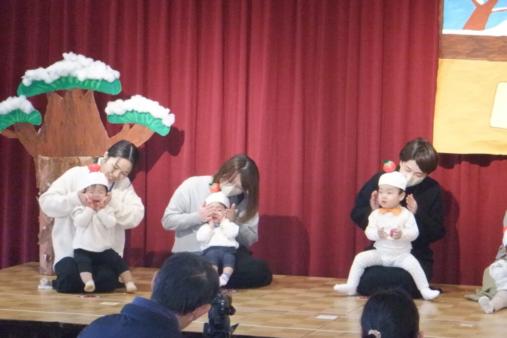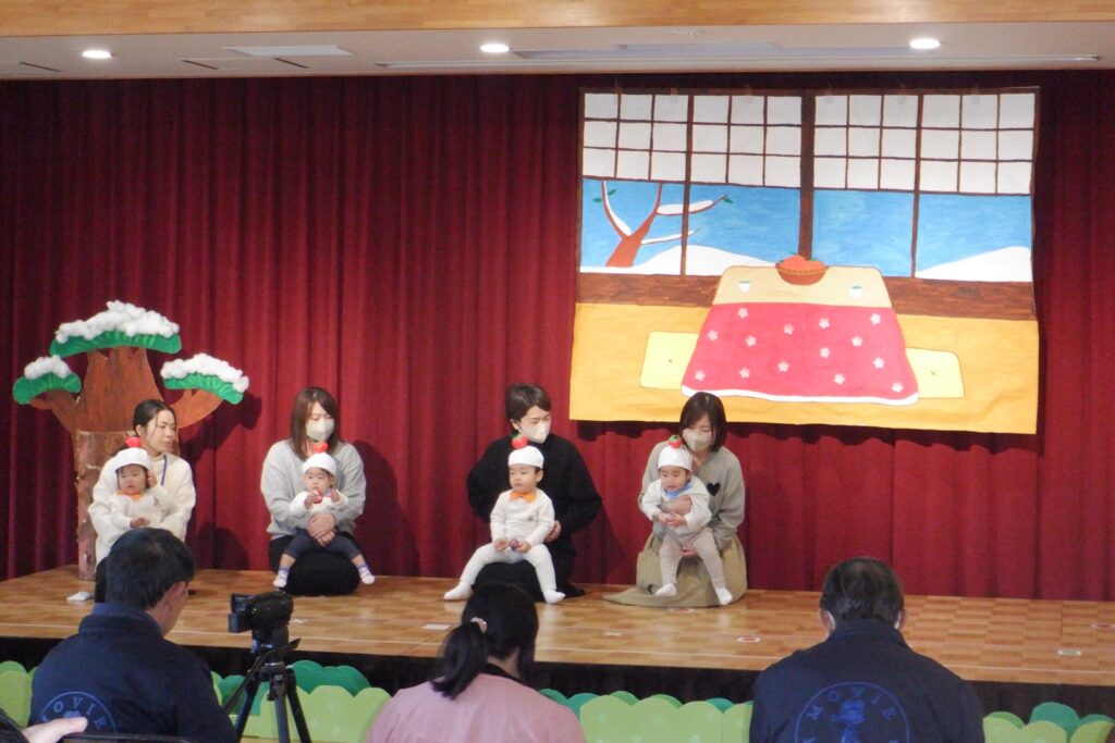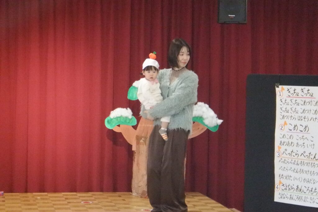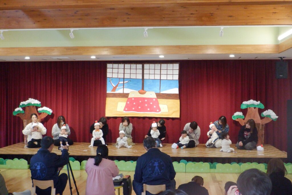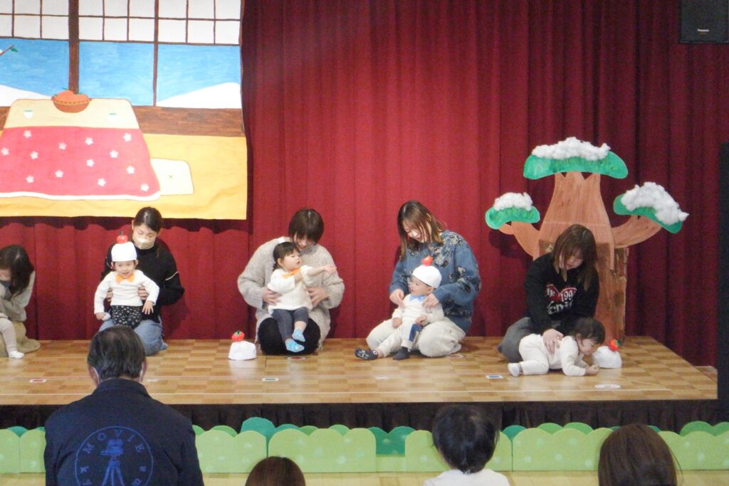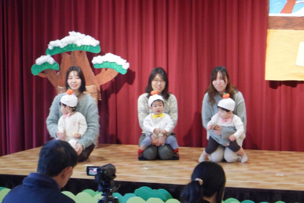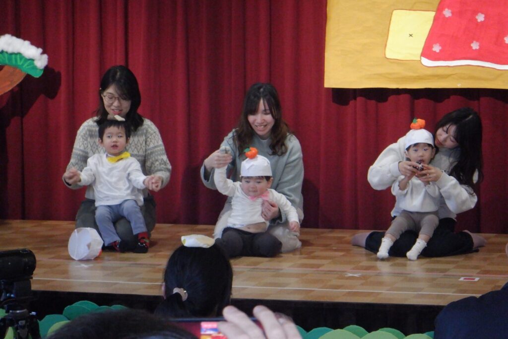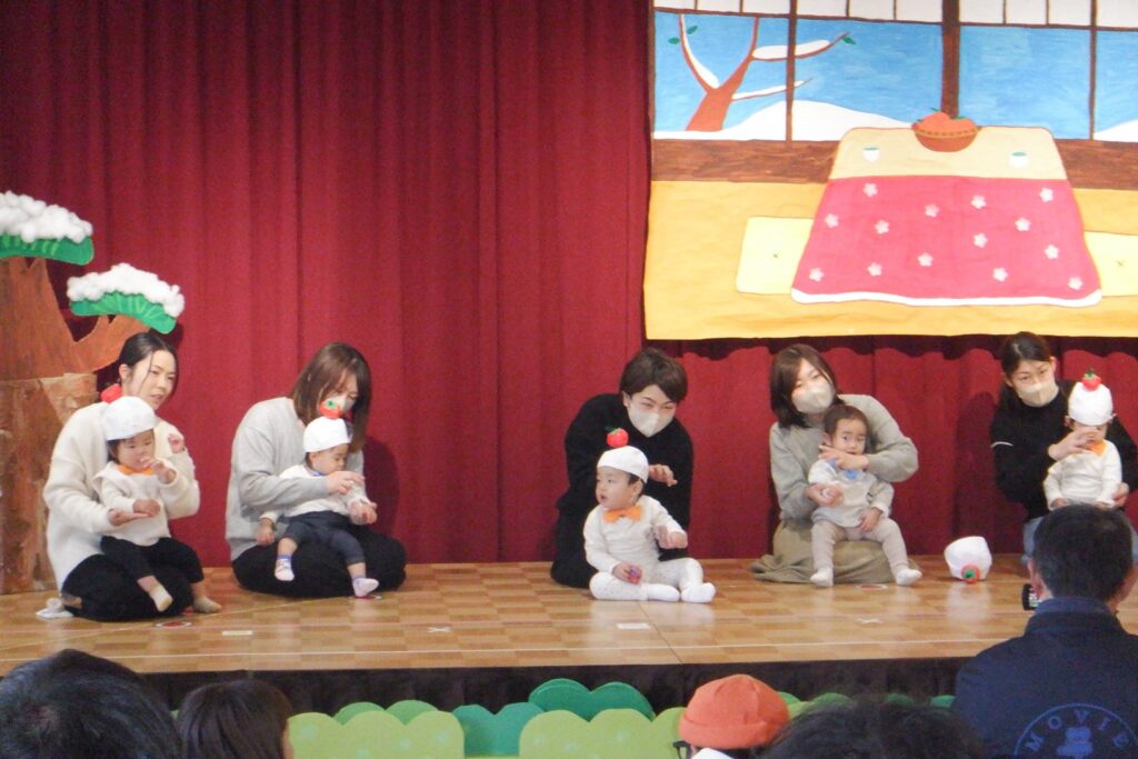1月22日に生活発表会がありました。いちご組の子どもたちは、お母さんと一緒にわらべ歌を楽しみました🎵今年度はお正月にちなんで、お米やお餅のわらべ歌です。子どもたちは可愛いいちご大福ちゃんとみかん大福ちゃんに変身しました🍓🍊